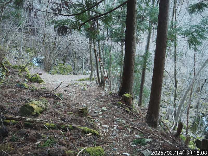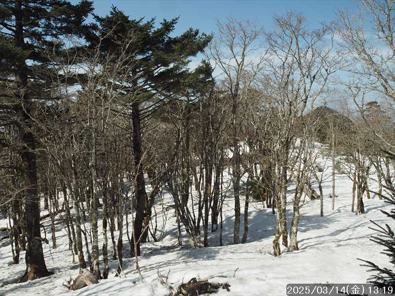 | 3月も半ばに入った、このところの暖かさもあり、どの山も残雪は薄くなったと思われる。 近畿最高峰の八経ヶ岳なら、まだそれなりに積雪は残っているのでは と思い、雪山登山の締めくくりに出かけることにした。ただし雪質は悪そう。 昨年は、狼平までしか行けなかったので、今回は何とか八経ヶ岳まで行きつきたいと思っているが・・ 5年前は八経ヶ岳・弥山と周回できたが、2年前は八経ヶ岳往復が精いっぱい、昨年は届かずに狼平までだった。体力は衰えて行くばっかり、年齢は正直だ。 でもその衰えに逆らって何とか八経ヶ岳までに辿り着きたい。昨年のリベンジを果たしたい。 雪山のロング行程なので、頑張って早く起き自宅をスタート。まだ外はまだ真っ暗、今日は天気が良いとの予報だが空に星は皆無。外気温は 3℃で風はないが寒さを感じた。 ガソリンが、ヤバそうなのでいつものガソリンスタンドに立ち寄ったので 10分ほどロスして奈良をスタート。平日だが早朝なので順調に走る。 熊渡の駐車地には予定より 15分ほど遅れて到着した。先着車はなかった。週末の明日・明後日は天気が良くないので、天気の良い今日は登山者はそれなりにいると思っていたが以外だった。 現地の外気温は 1℃、風はないが少し寒さを感じる。防寒着を着て行くかどうか迷ったが、寒さを感じたのと、目的地の標高が高いので防寒着を着て行くことにしてスタート。 5~6分ほど歩いた所で、スタート時に食べようとして車の上に置いていたオニギリを忘れてきたのに気付いた。取りに戻ると 10分ほどのロスになってしまう。時間が惜しいのでオニギリは諦める。 林道を黙々と歩いていると、軽クロカン 2台が通過して行った。先ほど「伐採作業中につき・・通行止め・・」の注意書きを見たので、その関係かと思ったが、この季節に伐採はなく作業車でもない。 双門コース分岐の先で、左下の弥山川に下りて行く道路に 2台駐車しているのが見えた。ダムの点検作業だろうか。 スタートして 30分弱で金引橋(林道終点登山口)に到着。一生懸命に歩いて来たこともあり少し汗ばみかけたので防寒着の下のフリースを脱いだ。 林道終点の登山口から入山し、少し先でカナビキ尾根に乗る。尾根を上がりかけた先で少し尾根の右から回り込んで再び尾根に戻る。 その少し先で、今度は大きく尾根の右からトラバースして行く場面があるので、体力温存のためそのトラバースルートを利用するつもりであったが、分岐に気付かずにそのまま尾根を上がってしまった。 急な尾根登りであるが、シッカリとした踏み跡が所々に出来ていたので、今は尾根ルートが主流になった模様。トラバースルートはあまり使われなくなった感じで分岐が薄くなったみたいで気付かなかった模様。 そんな尾根を一生懸命に登って行く。尾根上に雪はなく、周りにも白いものは見えない。 高度を上げて行き、ルートが尾根の右に回り込んで行く所まで来ると、ルート上にのみ残雪が出てきた。踏み固められた雪が融けずに残りガチガチに凍っていた。 ルート横の残雪のない所を拾いながらトラバースして行くが、少し先でルート上に残雪のない部分がなくなり、右側の崖が深くなってきた所で 4本爪を履いた。 ガチガチに凍っているので、傾斜のある所は叩き込むようにして爪を噛ませる、アイゼンがチャチでナマクラなためだ。 尾根を回り込んで、激登りに入るとルートがハッキリしない。兎に角登って行くだけなので、キックを入れたりして一生懸命に登る。直登出来ないので右にフラフラ、左にフラフラだ。見た目で 50mほどの登りだがシンドイ事。おまけに 4本爪なので堅い雪に効きが悪い、最初から 10本爪を履いていれば良かったと後悔。 登るのに一生懸命で、横の稜線に方向を変えるのに気付かず登り過ぎてしまった。気付いた所で稜線に向かう。 ヘトヘトになって、「カナビキ尾根分岐」のある川合からの稜線に合流。スタートして 2:19' かかっていた。尾根上に残雪がなく歩きやすかった割に時間がかかっていた。 稜線分岐の目立つところにスノーシューが立て掛けられていた。デポしているのかとも思ったが先行者はいないので忘れ物だろうか。帰路に確認すると左右ともビンディングが破損してぶっちぎれていたので廃棄していったのだろうか、そうとすればとんでもないことだ。 倒木に座りパンで小腹を満たして、アイゼンを 10本爪に履き替えてから先に進む。 分岐の鞍部から登りに入ると、残雪上の踏み跡がハッキリせずルートが分からない。左から回り込んでいくルートだと覚えているので、適当に進むとルートらしき部分が出てきた。それでも時々ルートを見失いないながら進む。 進む方向がハッキリしているのでルートを外しても問題ないが、残雪は表面は堅いものの下が緩んでいるのでズボる事が多い。なるべくルートと思われる所を拾おうとするが、雪の表面がガタガタでトレースが分からない。そんなんでズボリながら進む