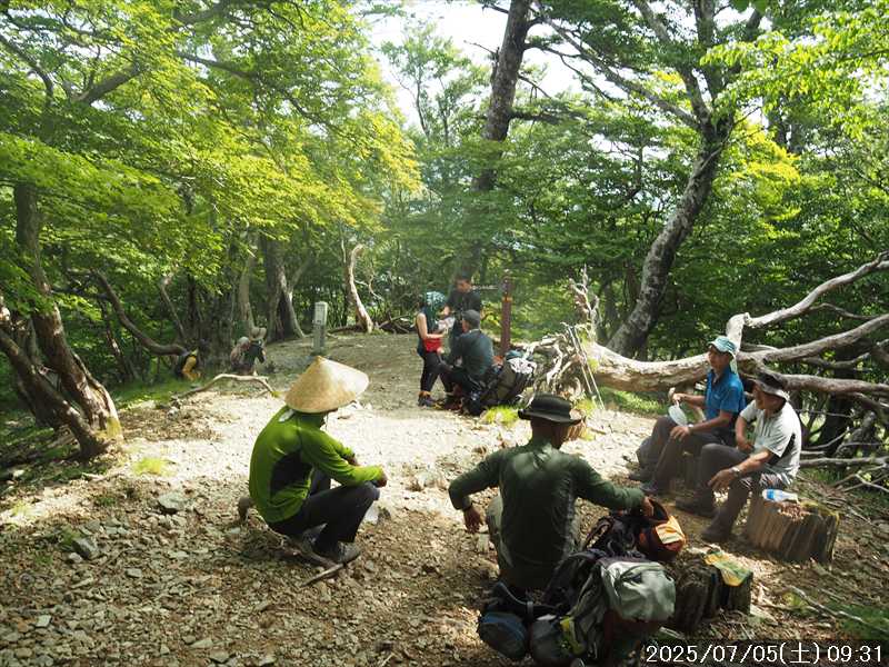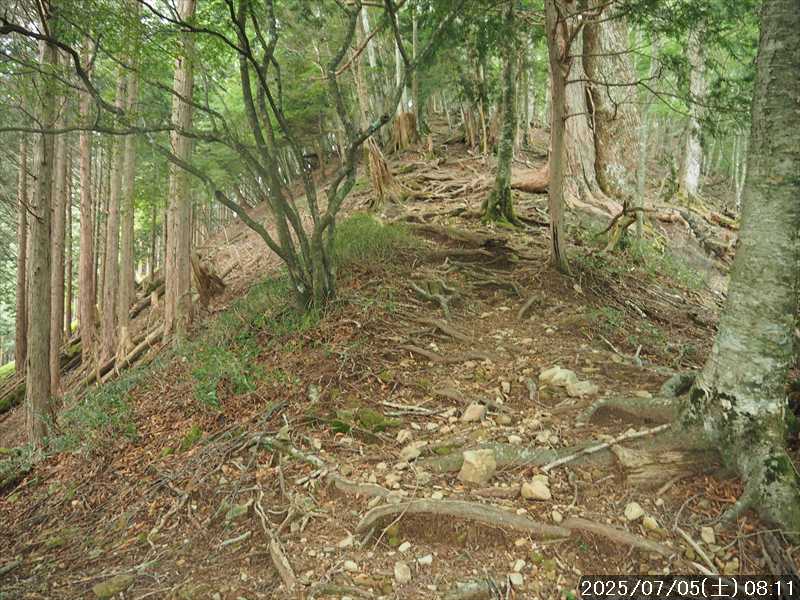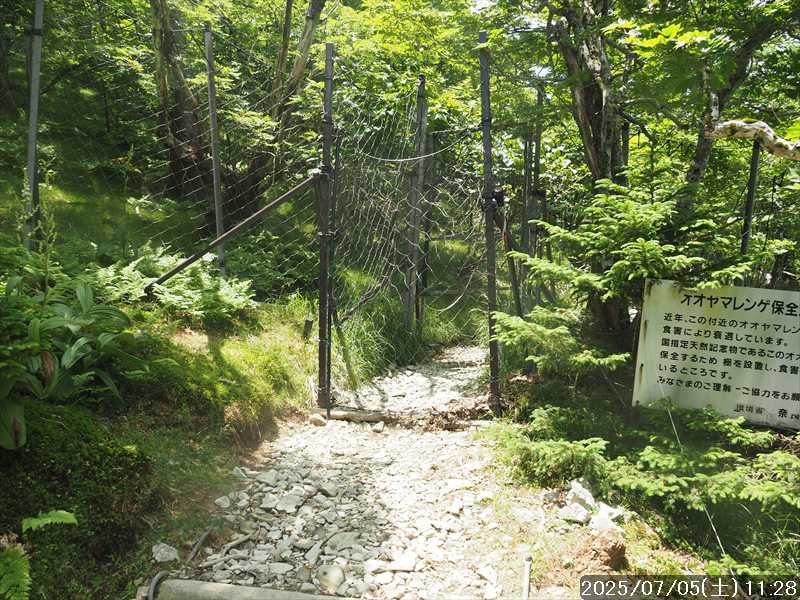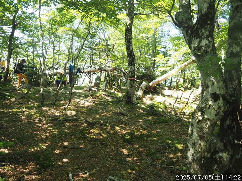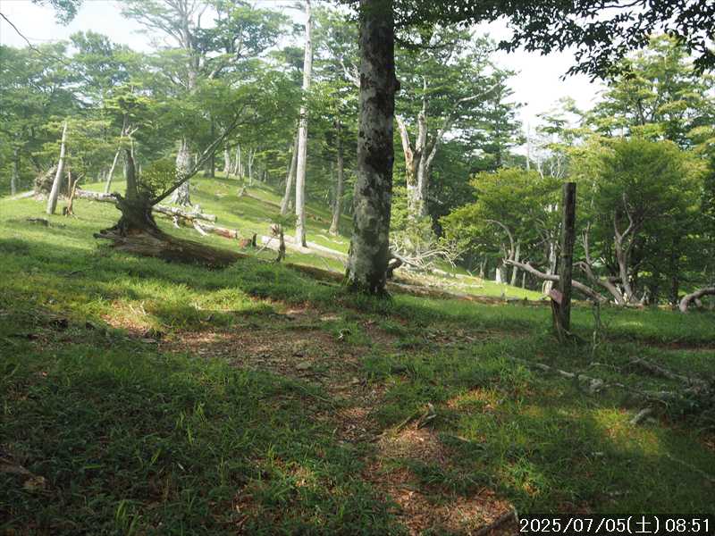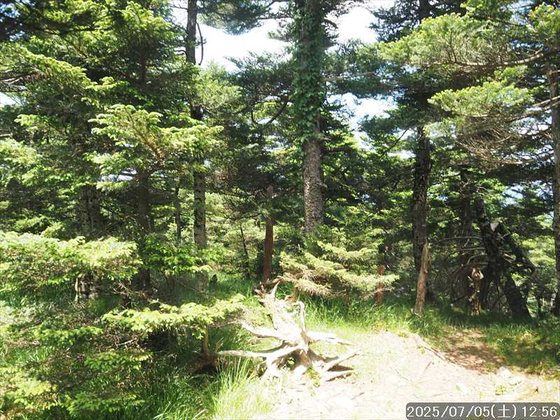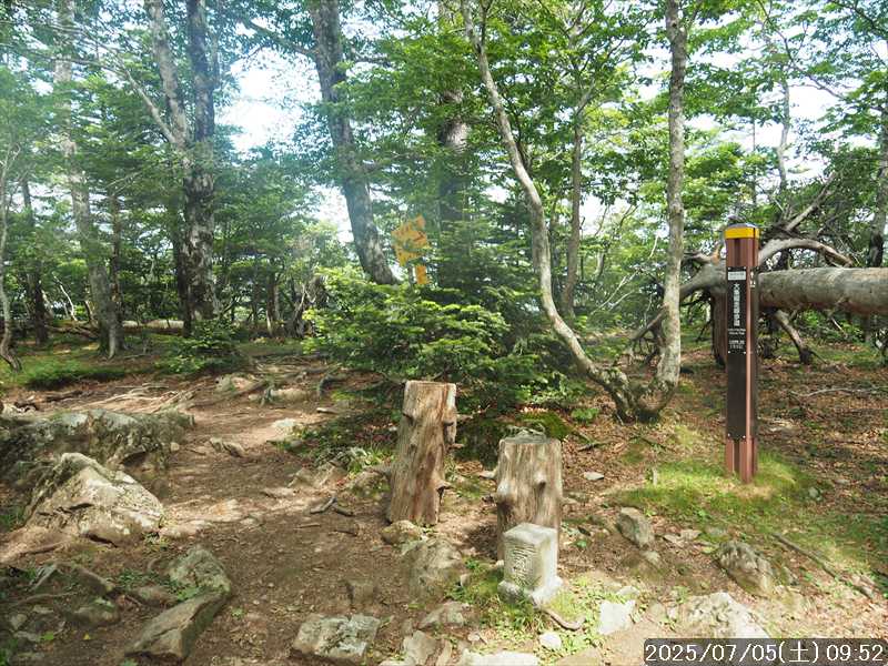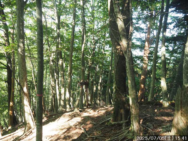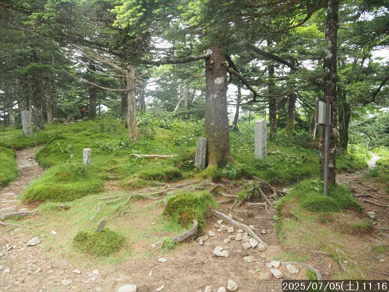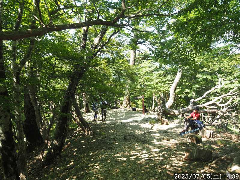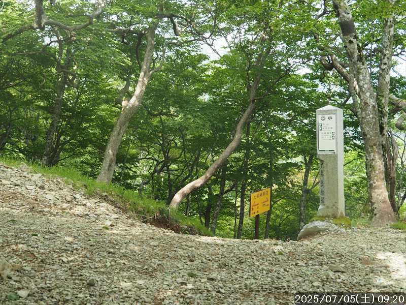 | 連日の猛暑日で暑い。 この暑さで山歩きは厳しいが何もしないと老化が加速するので、鞭打って出かける。 とは言っても低山では、とてもではないので、スタート地点が標高のある八経ヶ岳を目的地とした。4年前の 7/25に歩いた同じルートを、体力劣化による経年変化の測定も兼ねたい。 出来るだけ涼しいうちにスタートしたいので、いつもより 1時間早く起きて自宅をスタート。 休日(土曜)の早朝なので順調に走り、いつものスーパーに寄って、予定通り現地には 2:10' で到着。 行者還トンネル東口に停まっている車はなかった。この手前の 90番付近には 6~7台駐車していたが。 到着時の外気温は 22℃ 思ったよりも低い。若干風があるので暑くはなく丁度良い気温の感じ。思ったより暑くはないので気持ち良く歩けそうだ・・と思ったのだが。 トンネルの手前から林道に入る。 林道入口にはロープが張ってあったので、ロープを潜って林道に入ると、林道の崖側が 3カ所ほど崩落していた。ロープで進入禁止となっていたのはその崩落のため。 この林道は、以前に林道入口近くで全面崩壊して、歩いても通過できなくなっていたのが 4~5年前に完璧に修復され、入り口付近には車が数台駐車できるスペースも出来ていたのに、以前ほどでもないが再び崩壊してしまっていた。以前の崩壊と違って歩いて通過するには支障はないが。 そんな林道をダラダラと数分下って行くと論所ノ尾登山口。「一ノ垰→」の小さな案内があるのみ。 その登山口から入山。 入口付近の急登を上がると、その先からは山腹を巻きながら緩く登って行くルート。急な斜面ではないので危険はないが、落ち葉で埋もれてルートが分かりにくい部分があった。 尾根に巻きあがった所に分岐表示があり、そこからは論所ノ尾の尾根登り。踏み跡がハッキリしていない所もあったが明確な尾根で障害物もないので、上を目指して歩いて行くだけ。 山中は風がなく蒸した感があったので、登り始めると汗が出始めた。登るほどに傾斜が増してきたので汗が噴き出してくる。汗だくになって頑張るも体のシンドイ事。歩くペースは非常にユックリ。 何とか耐えながら歩き、スタートして 1:03' かかって奥駈稜線の一ノ垰に到着。ここまででかなり体力を消耗した。熱中症も怖いため水分休憩。休憩中に単独のトレラン者が八経ヶ岳方面に通過して行った。 一ノ垰からの奥駈道の稜線は風が通っていたので、その風が汗だくになった体を冷やしてくれるので凌ぎやすくなった。 そんな稜線を少し歩くと「上北山中学校前バス停」分岐。奥駈道はP1516をトラバースして行くので、山腹道に変わる。危険のないトラバース道だが小刻みにアップダウンがあるのでジワジワと足に来る。 一ノ垰から 23分で奥駈道出合に到着。西口からの登山者が多く休憩していた、テント装備の人も何組かいた。 そんな多くの人に交じってチョット一息のつもりで座ったら腰が落ち着いてしまい大休憩。 奥駈道出合から再スタートして、三角点のある弁天ノ森はそのまま通過して、一旦下って少し登り返すと聖宝ノ宿趾。そこもそのまま通過すると、その少し先で本格的な登りになった。弥山小屋まで高度差 300mの登りが始まる。 今日の予定は 4年前と同じで明星ヶ岳までのつもりだったが、一ノ垰までの登りだけで疲れてしまい明星ヶ岳まではとても無理な感じ。それどころか、聖宝ノ宿趾から始まった登りがキツく八経ヶ岳までも厳しそうなくらいに体がシンドイ。 体はシンドイが、時間的には問題ないので、なんとか八経ヶ岳までは と頑張る。 長い木製階段を登り切り C1770付近の尾根の展望地で、体がもたず木陰の岩に座り休憩。多くの人が一服して行く。 息を整えて再び歩き出すも、少し登った先で足が止まってしまい立ち休憩。呼吸を整えて何とか頑張ると弥山小屋に到着した。 弥山小屋で一服したい所だが、そこで休憩に入ると足が止まってしまいそうなので、そのまま八経ヶ岳に向かう。 鞍部までは下りなので、体は楽になったが、足は下りでも重たい感じ。 鞍部から八経ヶ岳への登りに変わった所で、オオヤマレンゲ等の保護のためネットフェンス内に入る。出入口が 2重になっていて、ネット内の保護場所が 2カ所に分かれてあった。 ネット内の保護場所にはオオヤマレンゲは見かけなかったが、時期的にまだ早いのだろうか。 八経ヶ岳への登り返しを何とかこなし、山頂にはスタートして 3:57' で到着した。 天気は良く日差しもあるが、空気が濁っているのか遠方までの景色はなかった。釈迦ヶ岳はギリギリ確認できる程度で、大普賢岳も薄くしか見えていなかった。 明星ヶ岳まで足を延ばしたかったが、気力は疾うになくなっていたので、八経ヶ岳山頂の展望場所で昼食にすることにした。 疲れが激しいので昼食休憩をユックリととり、明星ヶ岳は諦めたのでそこから引き返す。 弥山小屋まで引き返して、そのまま弥山神社のある弥山 山頂に向かう。 弥山神社で山歩き