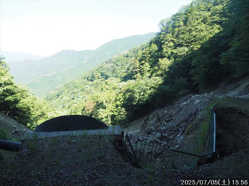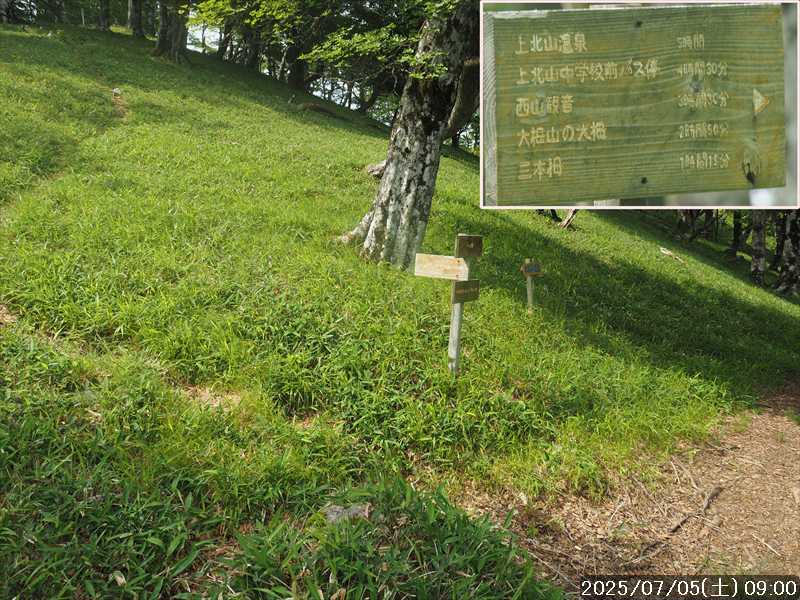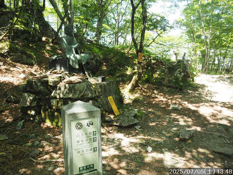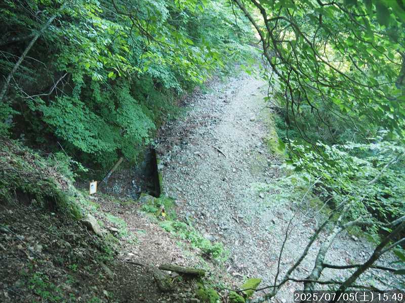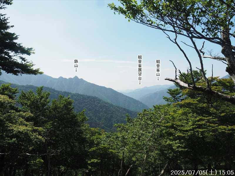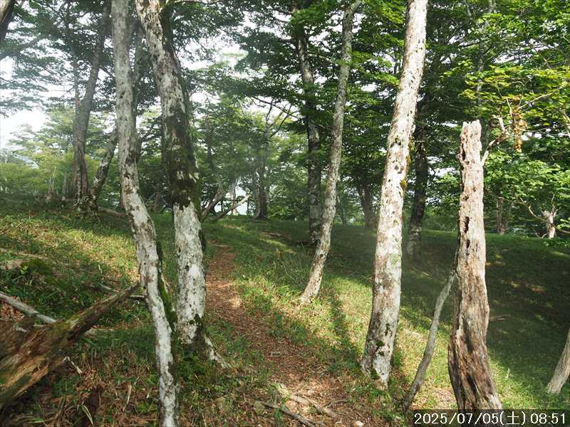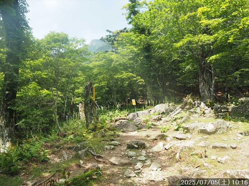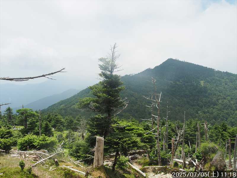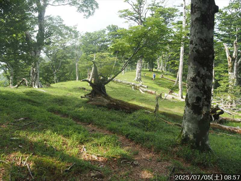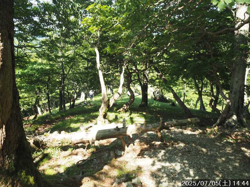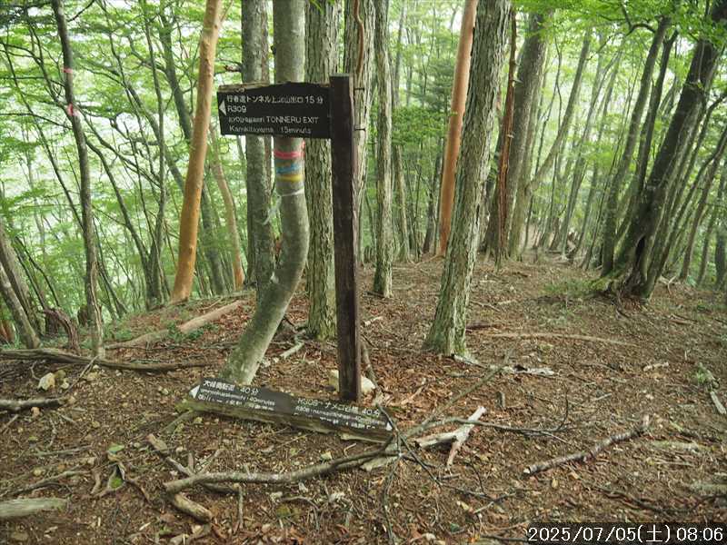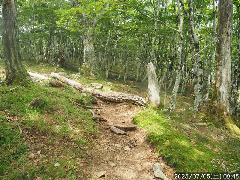| 連日の猛暑日で暑い。 この暑さで山歩きは厳しいが何もしないと老化が加速するので、鞭打って出かける。 とは言っても低山では、とてもではないので、スタート地点が標高のある八経ヶ岳を目的地とした。4年前の 7/25に歩いた同じルートを、体力劣化による経年変化の測定も兼ねたい。 出来るだけ涼しいうちにスタートしたいので、いつもより 1時間早く起きて自宅をスタート。 休日(土曜)の早朝なので順調に走り、いつものスーパーに寄って、予定通り現地には 2:10' で到着。 行者還トンネル東口に停まっている車はなかった。この手前の 90番付近には 6~7台駐車していたが。 到着時の外気温は 22℃ 思ったよりも低い。若干風があるので暑くはなく丁度良い気温の感じ。思ったより暑くはないので気持ち良く歩けそうだ・・と思ったのだが。 トンネルの手前から林道に入る。 林道入口にはロープが張ってあったので、ロープを潜って林道に入ると、林道の崖側が 3カ所ほど崩落していた。ロープで進入禁止となっていたのはその崩落のため。 この林道は、以前に林道入口近くで全面崩壊して、歩いても通過できなくなっていたのが 4~5年前に完璧に修復され、入り口付近には車が数台駐車できるスペースも出来ていたのに、以前ほどでもないが再び崩壊してしまっていた。以前の崩壊と違って歩いて通過するには支障はないが。 そんな林道をダラダラと数分下って行くと論所ノ尾登山口。「一ノ垰→」の小さな案内があるのみ。 その登山口から入山。 入口付近の急登を上がると、その先からは山腹を巻きながら緩く登って行くルート。急な斜面ではないので危険はないが、落ち葉で埋もれてルートが分かりにくい部分があった。 尾根に巻きあがった所に分岐表示があり、そこからは論所ノ尾の尾根登り。踏み跡がハッキリしていない所もあったが明確な尾根で障害物もないので、上を目指して歩いて行くだけ。 山中は風がなく蒸した感があったので、登り始めると汗が出始めた。登るほどに傾斜が増してきたので汗が噴き出してくる。汗だくになって頑張るも体のシンドイ事。歩くペースは非常にユックリ。 何とか耐えながら歩き、スタートして 1:03' かかって奥駈稜線の一ノ垰に到着。ここまででかなり体力を消耗した。熱中症も怖いため水分休憩。休憩中に単独のトレラン者が八経ヶ岳方面に通過して行った。 一ノ垰からの奥駈道の稜線は風が通っていたので、その風が汗だくになった体を冷やしてくれるので凌ぎやすくなった。 そんな稜線を少し歩くと「上北山中学校前バス停」分岐。奥駈道はP1516をトラバースして行くので、山腹道に変わる。危険のないトラバース道だが小刻みにアップダウンがあるのでジワジワと足に来る。 一ノ垰から 23分で奥駈道出合に到着。西口からの登山者が多く休憩していた、テント装備の人も何組かいた。 そんな多くの人に交じってチョット一息のつもりで座ったら腰が落ち着いてしまい大休憩。 奥駈道出合から再スタートして、三角点のある弁天ノ森はそのまま通過して、一旦下って少し登り返すと聖宝ノ宿趾。そこもそのまま通過すると、その少し先で本格的な登りになった。弥山小屋まで高度差 300mの登りが始まる。 今日の予定は 4年前と同じで明星ヶ岳までのつもりだったが、一ノ垰までの登りだけで疲れてしまい明星ヶ岳まではとても無理な感じ。それどころか、聖宝ノ宿趾から始まった登りがキツく八経ヶ岳までも厳しそうなくらいに体がシンドイ。 体はシンドイが、時間的には問題ないので、なんとか八経ヶ岳までは と頑張る。 長い木製階段を登り切り C1770付近の尾根の展望地で、体がもたず木陰の岩に座り休憩。多くの人が一服して行く。 息を整えて再び歩き出すも、少し登った先で足が止まってしまい立ち休憩。呼吸を整えて何とか頑張ると弥山小屋に到着した。 弥山小屋で一服したい所だが、そこで休憩に入ると足が止まってしまいそうなので、そのまま八経ヶ岳に向かう。 鞍部までは下りなので、体は楽になったが、足は下りでも重たい感じ。 鞍部から八経ヶ岳への登りに変わった所で、オオヤマレンゲ等の保護のためネットフェンス内に入る。出入口が 2重になっていて、ネット内の保護場所が 2カ所に分かれてあった。 ネット内の保護場所にはオオヤマレンゲは見かけなかったが、時期的にまだ早いのだろうか。 八経ヶ岳への登り返しを何とかこなし、山頂にはスタートして 3:57' で到着した。 天気は良く日差しもあるが、空気が濁っているのか遠方までの景色はなかった。釈迦ヶ岳はギリギリ確認できる程度で、大普賢岳も薄くしか見えていなかった。 明星ヶ岳まで足を延ばしたかったが、気力は疾うになくなっていたので、八経ヶ岳山頂の展望場所で昼食にすることにした。 疲れが激しいので昼食休憩をユックリととり、明星ヶ岳は諦めたのでそこから引き返す。 弥山小屋まで引き返して、そのまま弥山神社のある弥山 山頂に向かう。 弥山神社で山歩き