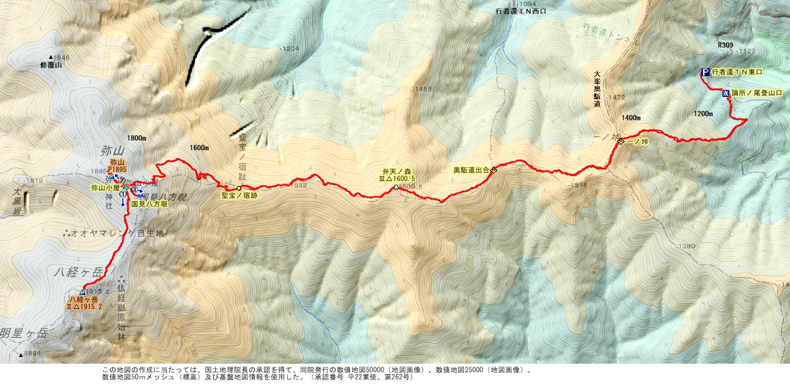 | P ⇔ 《論所ノ尾》 ⇔ 一ノ垰 ⇔ 奥駆道出合 ⇔ 弁天ノ森 ⇔ 聖宝ノ宿趾(理源大師像) ⇔ 弥山小屋(弥山⇔) ⇔ 八経ヶ岳 【往復】 ※ 弥山は帰路に登頂 |