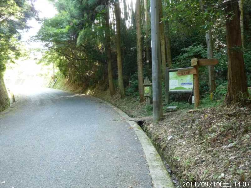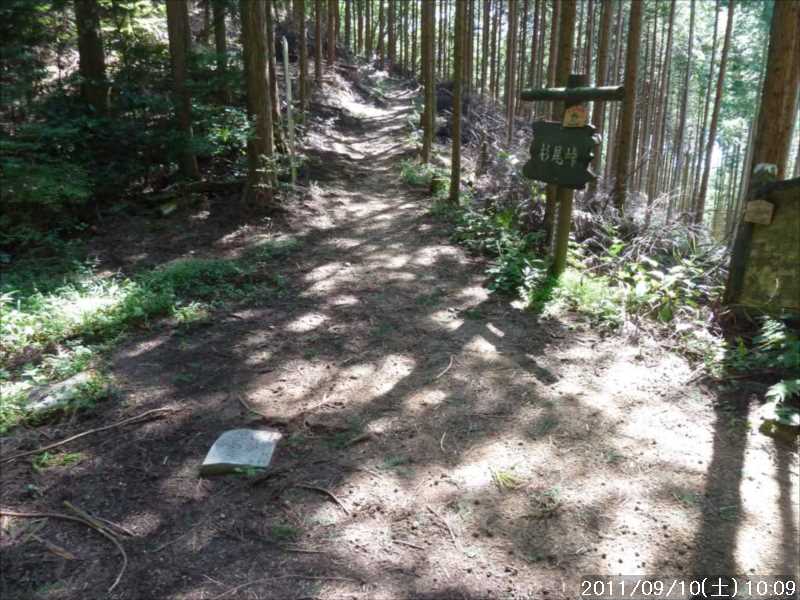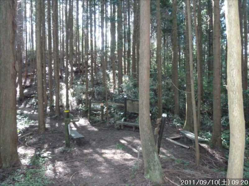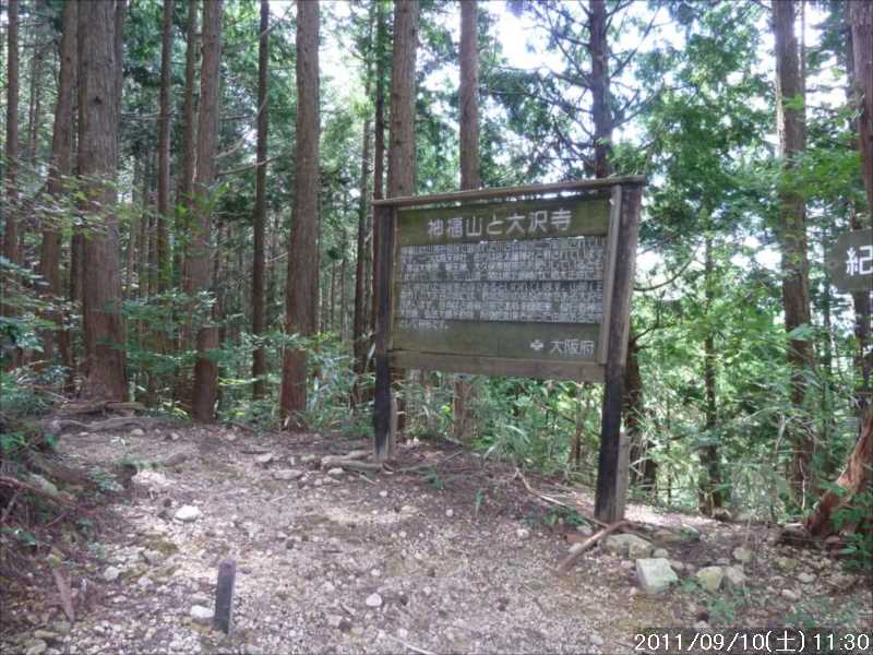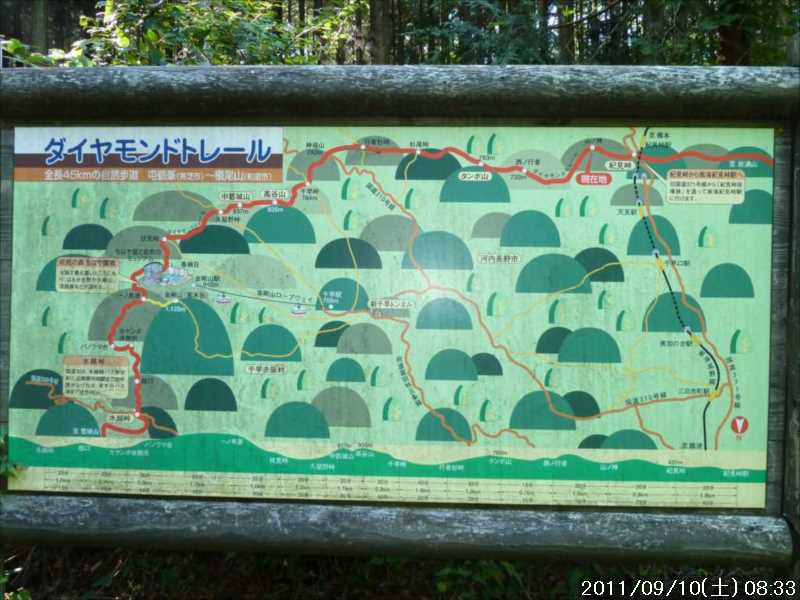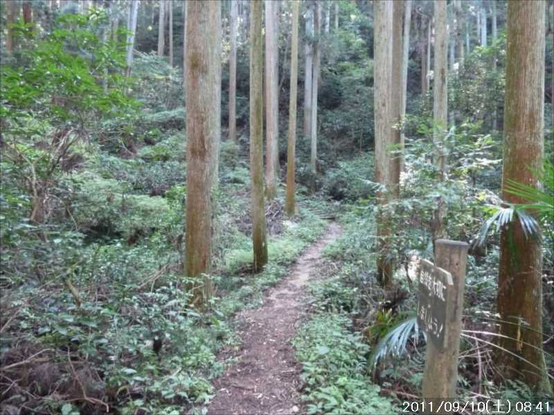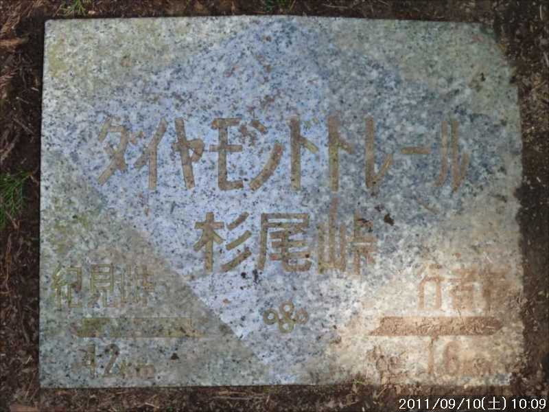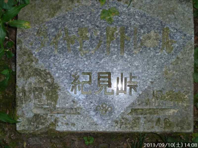 | 9月初めの週末土曜日(2011-9-3)の朝、台風12号が四国に上陸した。7月の台風6号に続き今年2つ目の台風上陸だ。 非常にゆっくりとした台風で、上陸前日の金曜日朝から奈良でも結構な強風にあおられていた。上陸後も時速15㎞程度の速度で岡山から中国地方を横断し日本海へ抜けていくのに丸一日かかり、翌日の日曜日も暴風圏内にあった。 台風の速度が遅い為、大雨が長時間続き災害を大きくもたらした。奈良県南部の十津川村・上北山村では観測史上最大の雨で、十津川村では降り始めからの雨量は年間雨量の7割に達し、1800㍉以上ととんでもない数値を記録している(雨量計が故障してそれ以上は計測できていない)。 十津川村は今年7月の台風6号でも、やはり大雨で被害を受けておりWパンチの被災だ。 奈良・和歌山・三重にまたがる紀伊半島南部での降雨量は半端ではなく、大きな爪跡を残した。また同地域を中心に100名以上の死者・行方不明者が出ている。100名以上の死者・行方不明者は1979年の台風20号以来とのこと、近年にない台風被害だ。 十津川沿いに走っているR168(五條新宮道路)はズタズタの模様だ。R168の他R309・R169(東熊野街道)の国道や、それらに接続している県道・林道も同様で,大塔・坪内など山歩きに良く出かけた場所でも相当な被害があるようだ。この台風の被害で大峰方面への山歩きは、当分難しくなりそうな雰囲気だ。 そんな訳で、先週は台風でお休みしたため2週間ぶりのお出かけだ。 行き先は奈良南部の大峰山地方面はアプローチ道路がズタズタで通行不可であり、他の地域も奥深いところは心配があるので、ダイトレの石版プレート確認の続きに行くことにした。 石板プレートは北の入口の屯鶴峯から久留野峠までは確認しているので、その続きで紀見峠から千早峠まで往復することにした。 このルートは以前に五万人の森公園から千早峠に上り、ダイトレを紀見峠まで歩き、そこから南海の紀見峠駅に下りJRを乗り継ぎ、出発点に戻ったことがある、そのときは一部で電車を利用した周回であったが、今回はダイトレのすぐ近くに駐車できる反対方向からの往復とした。 前回このルートを歩いたときは目的が石版プレートの確認ではなかったこともあり、一つも確認できていない。プレートは行者杉にあるのはわかっているが、他には何処にあるか? 長時間の山歩きではないので、普段より少しだけ早めに起きて出発。 大和高田バイパスからR24に下りた所で御所方面(南方面)からR24を北に向かっている自衛隊のトラックの車列に遭遇した。途切れ途切れの車列ではあったが合計で2~30台程度はいたか? 全てが同じ車種(市販のトラックではない形状)であり、つや消し深緑色の4トン程度のトラックだ。荷台の幌の横には災害派遣の横幕があった。 先週の台風12号で被害を受けた奈良南部の被災地への救援活動の帰りのようだ。 今年3月の東日本大震災でも自衛隊の災害救援活動は目覚しいものがあった。今回の自衛隊の救援活動も被災地にとっては非常に心強いことであったろう。現地で実際に救援活動をされた自衛隊の皆様ご苦労様ですと言いたい。 紀見峠方面に車で来るのは初めてだ。カーナビの案内で順調に現地到着。旧道の峠を過ぎて左右にダイトレの入口を見て、北に少し下った道路の路肩に駐車。峠の前から駐車している車は一台もない。ダイトレ入口にオフロードバイクを停めてなにやら辺りを探っている青年がいるのみだ。 旧紀見峠道からのダイトレ入口は、東方面(金剛)も西方面(岩湧山)も案内板が多くあり明確だ。 その入口から林道を十数分程度歩くと山ノ神だ。ここから林道を別れ左に進む、車は通行できないが、暫くはコンクリートで舗装された道が続く。その後川沿いの道となり暫く行くと、今度は長い丸太階段の登りが続く、帰りに数えたら 684段あった。そのあとにも丸太階段があり、そちらは 308段であった。 その後は尾根道を小さなアップダウンの繰り返しが続く、大きな登りはないが距離が長い分結構歩き応えがある。 途中タンポ山の表示の所で、地図を見ると三角点のマークがあったので、現在地と山の方向を確かめずに表示板の横にある小山がタンポ山と思い登るが、何もなかった。帰宅してGPSをカシミールにダウンロードして見ると、タンポ山の三角点は表示板の少し後ろ(西側)だった。地図と方向を確認すれば直ぐに分かった事なのに、目の前の小山に囚われ思い込んでしまった。 何事にも広い視野で見ることが出来ず、直ぐ思い込んでしまう性格が災いしたようだ、反省。 ダイトレのプレートであるが、行者杉の次はどこにあるのか調べずに来たが杉尾峠にあった。プレートに掘り込まれた文字を見ると前後は行者杉と紀見峠となっていた。紀見峠は来るときには見当たらなかったので、西の入口にあると思われるので帰りに確認しよう。 行者杉までは表示によると1.6㎞、この間のインターバルは短い。 その行者杉のプレートもすぐに見つかった。これで北か