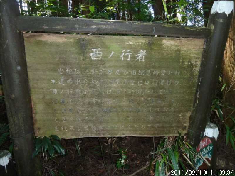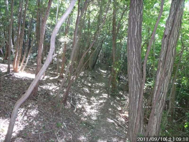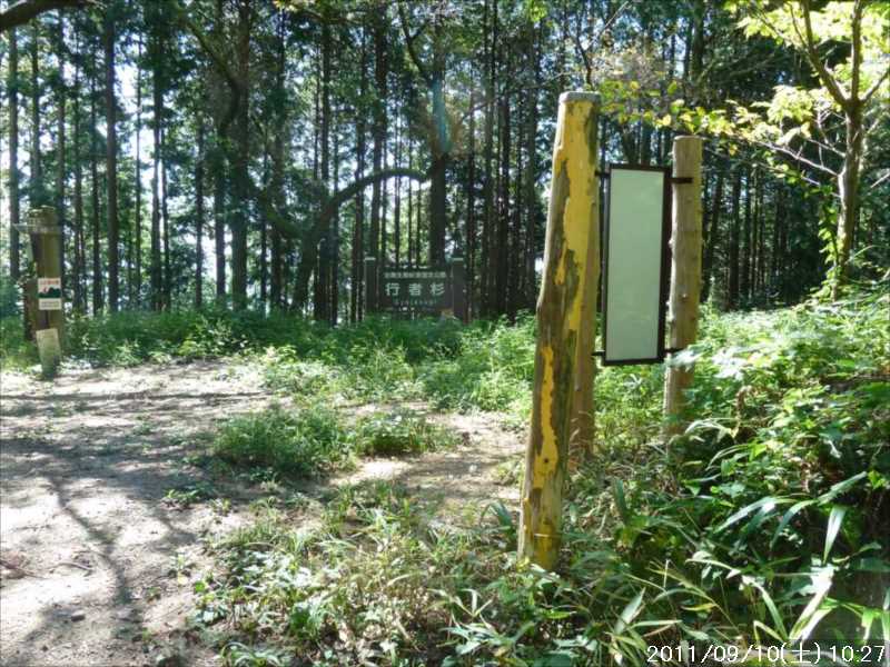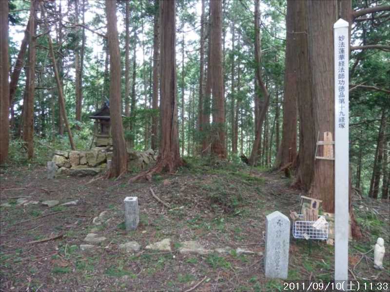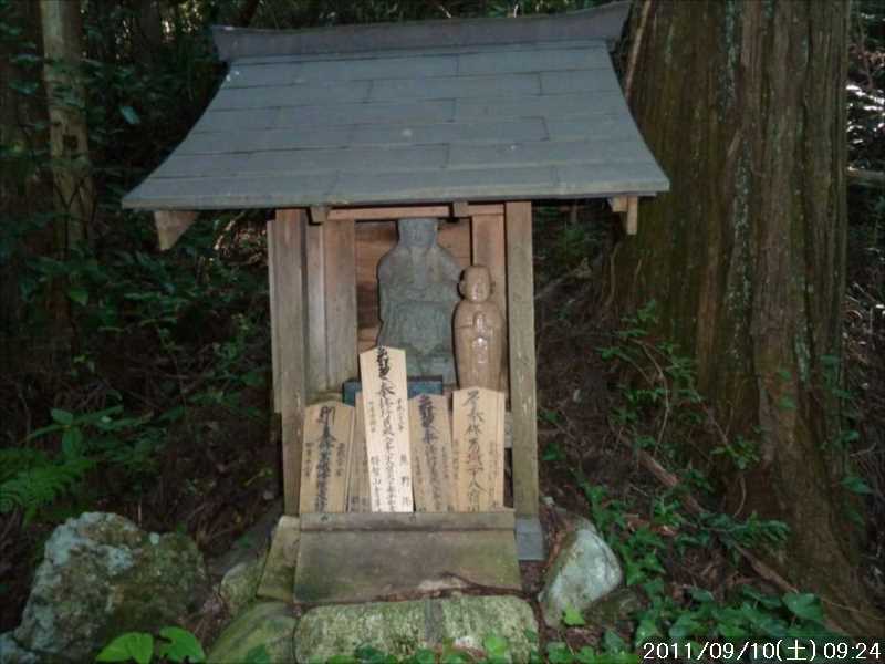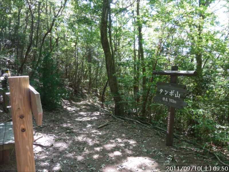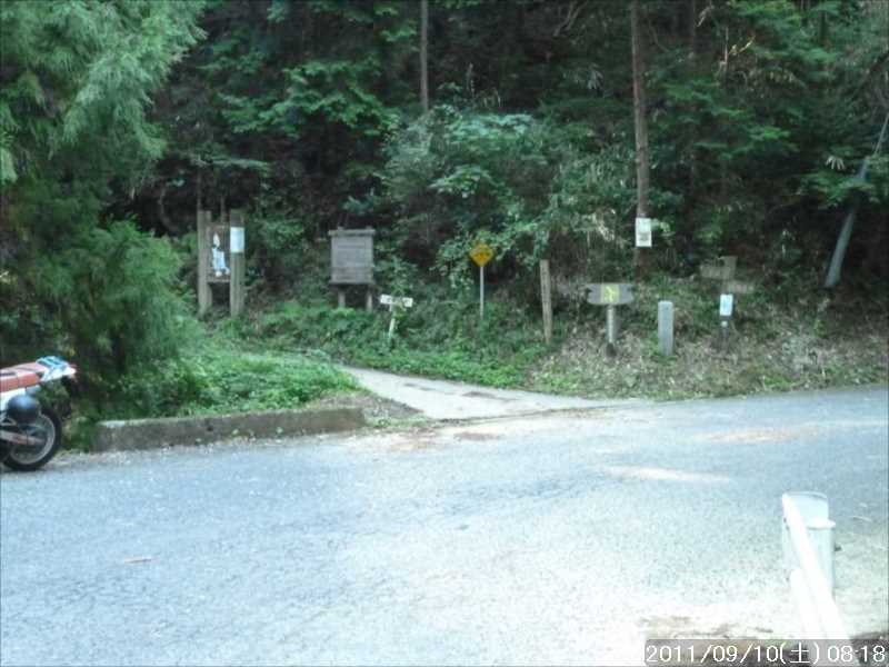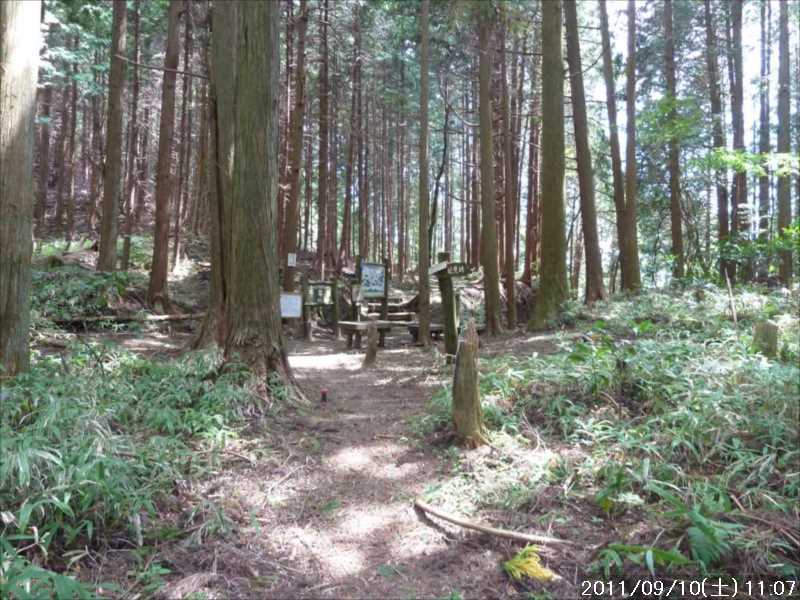 | 9月初めの週末土曜日(2011-9-3)の朝、台風12号が四国に上陸した。7月の台風6号に続き今年2つ目の台風上陸だ。 非常にゆっくりとした台風で、上陸前日の金曜日朝から奈良でも結構な強風にあおられていた。上陸後も時速15㎞程度の速度で岡山から中国地方を横断し日本海へ抜けていくのに丸一日かかり、翌日の日曜日も暴風圏内にあった。 台風の速度が遅い為、大雨が長時間続き災害を大きくもたらした。奈良県南部の十津川村・上北山村では観測史上最大の雨で、十津川村では降り始めからの雨量は年間雨量の7割に達し、1800㍉以上ととんでもない数値を記録している(雨量計が故障してそれ以上は計測できていない)。 十津川村は今年7月の台風6号でも、やはり大雨で被害を受けておりWパンチの被災だ。 奈良・和歌山・三重にまたがる紀伊半島南部での降雨量は半端ではなく、大きな爪跡を残した。また同地域を中心に100名以上の死者・行方不明者が出ている。100名以上の死者・行方不明者は1979年の台風20号以来とのこと、近年にない台風被害だ。 十津川沿いに走っているR168(五條新宮道路)はズタズタの模様だ。R168の他R309・R169(東熊野街道)の国道や、それらに接続している県道・林道も同様で,大塔・坪内など山歩きに良く出かけた場所でも相当な被害があるようだ。この台風の被害で大峰方面への山歩きは、当分難しくなりそうな雰囲気だ。 そんな訳で、先週は台風でお休みしたため2週間ぶりのお出かけだ。 行き先は奈良南部の大峰山地方面はアプローチ道路がズタズタで通行不可であり、他の地域も奥深いところは心配があるので、ダイトレの石版プレート確認の続きに行くことにした。 石板プレートは北の入口の屯鶴峯から久留野峠までは確認しているので、その続きで紀見峠から千早峠まで往復することにした。 このルートは以前に五万人の森公園から千早峠に上り、ダイトレを紀見峠まで歩き、そこから南海の紀見峠駅に下りJRを乗り継ぎ、出発点に戻ったことがある、そのときは一部で電車を利用した周回であったが、今回はダイトレのすぐ近くに駐車できる反対方向からの往復とした。 前回このルートを歩いたときは目的が石版プレートの確認ではなかったこともあり、一つも確認できていない。プレートは行者杉にあるのはわかっているが、他には何処にあるか? 長時間の山歩きではないので、普段より少しだけ早めに起きて出発。 大和高田バイパスからR24に下りた所で御所方面(南方面)からR24を北に向かっている自衛隊のトラックの車列に遭遇した。途切れ途切れの車列ではあったが合計で2~30台程度はいたか? 全てが同じ車種(市販のトラックではない形状)であり、つや消し深緑色の4トン程度のトラックだ。荷台の幌の横には災害派遣の横幕があった。 先週の台風12号で被害を受けた奈良南部の被災地への救援活動の帰りのようだ。 今年3月の東日本大震災でも自衛隊の災害救援活動は目覚しいものがあった。今回の自衛隊の救援活動も被災地にとっては非常に心強いことであったろう。現地で実際に救援活動をされた自衛隊の皆様ご苦労様ですと言いたい。 紀見峠方面に車で来るのは初めてだ。カーナビの案内で順調に現地到着。旧道の峠を過ぎて左右にダイトレの入口を見て、北に少し下った道路の路肩に駐車。峠の前から駐車している車は一台もない。ダイトレ入口にオフロードバイクを停めてなにやら辺りを探っている青年がいるのみだ。 旧紀見峠道からのダイトレ入口は、東方面(金剛)も西方面(岩湧山)も案内板が多くあり明確だ。 その入口から林道を十数分程度歩くと山ノ神だ。ここから林道を別れ左に進む、車は通行できないが、暫くはコンクリートで舗装された道が続く。その後川沿いの道となり暫く行くと、今度は長い丸太階段の登りが続く、帰りに数えたら 684段あった。そのあとにも丸太階段があり、そちらは 308段であった。 その後は尾根道を小さなアップダウンの繰り返しが続く、大きな登りはないが距離が長い分結構歩き応えがある。 途中タンポ山の表示の所で、地図を見ると三角点のマークがあったので、現在地と山の方向を確かめずに表示板の横にある小山がタンポ山と思い登るが、何もなかった。帰宅してGPSをカシミールにダウンロードして見ると、タンポ山の三角点は表示板の少し後ろ(西側)だった。地図と方向を確認すれば直ぐに分かった事なのに、目の前の小山に囚われ思い込んでしまった。 何事にも広い視野で見ることが出来ず、直ぐ思い込んでしまう性格が災いしたようだ、反省。 ダイトレのプレートであるが、行者杉の次はどこにあるのか調べずに来たが杉尾峠にあった。プレートに掘り込まれた文字を見ると前後は行者杉と紀見峠となっていた。紀見峠は来るときには見当たらなかったので、西の入口にあると思われるので帰りに確認しよう。 行者杉までは表示によると1.6㎞、この間のインターバルは短い。 その行者杉のプレートもすぐに見つかった。これで北か