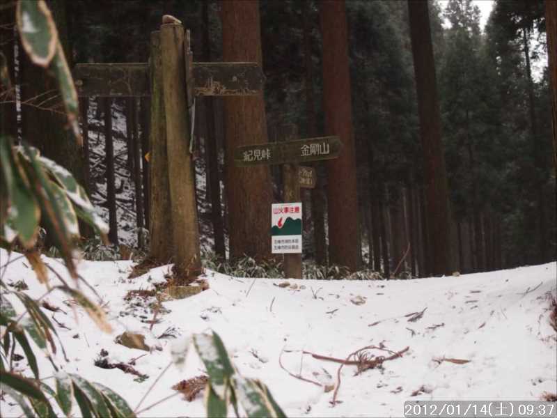 | 会社で週末の天気を確認すると、今夕(金曜日)より冬型の天気となり冷え込むらしい。 と言うことは、奥深いところは道路の凍結が心配されるので、いつもどおり近場の金剛山へ行くことにした。 ルートは、奈良側の五條より久留野峠超えをして、大阪側に一旦下り、タカハタ道で金剛に登り返し、久留野峠もしくは千早峠から出発点に戻る予定とした。 タカハタ道は、前回に青崩道のセトから大阪側に下ったときに、分岐から登山者が登って行くのを見て気になっていたルートだ。 確認のため、昭文社の地図を見ていたら、前回見たのはタカハタ道ではなくカトラ谷ルートの間違いであった。 そのどちらにしようかと迷ったが、今回は金剛登山口に近いタカハタ道を使うことにした。両ルートとも昭文社の地図では破線になっており、国土地理院の電子国土にはルートとしては載っていない。少し気になるが金剛は大勢の人が色々なルートから登っているので多分大丈夫であろう。 普段会社に行く時間よりも小一時間近く早く家を出る。駐車場を出たときはまだ暗かったが、直に明けてきた。朝靄か見通しが悪い。 天気予報では曇りであったが、やはり青空は見えない。京奈和道の高架から見る葛城・金剛もぼやけて見える。残念ながら今日の天気では展望はムリである。あとは霧氷と雪が期待であるが、昨日の天気予報と違い余り冷え込んだ様子はないので、さてどうであろうか? こちらに来る時にはいつも利用させてもらっている五万人の森公園の大駐車場に車を置き、久留野峠をめざす。天候はイマイチであるが風はない。体感温度はそんなに低く感じないが、一応防寒着を着て出発。 久留野林道の入口から林道を数分歩き、左にある登山口へ入る。霜や雪は全くない、直ぐに暑くなり防寒着を脱ぐ。 高度を上げてきたところで、小雪が舞い始めフリースが濡れてきたので、それを脱ぎ先ほど脱いだ防寒着を再び着る。 峠の少し手前では薄っすらと雪が冠り初めていた。ただ熊笹が山道を被い、笹の上に積もっている雪がズボンを濡らすので、しょっちゅう手で払い落とした。アイゼンは必要なかった。 久留野峠に出ると、反対方向より重アイゼンをはめ大きな荷物を背負った人が登ってきた。聞くと峠の直ぐ手前ぐらいからとの事なので、アイゼンははめずに、そのまま大阪側に下る。初めは慎重に下ったが、少し下ってから油断をしてしまい、一度尻餅をついてしまう。 大阪側の府道まで出ると、この天気でも多くの人がおり駐車場にも多くの車が駐車していた。金剛は冬季のほうが人気が高い。 長い府道歩きをし、金剛登山口バス停の先にある千早本道を右に見て、道なりに進むと橋の手前に車止めがある、その手前を右に行く。少し行った小さな橋の手前右がタカハタ道の入り口であるが、崖道が細いらしいので橋を渡った少し先の右にある水道施設をグルーと裏に回って戻るように進むと先ほどからの道に合流するが、水道施設を通り越して真っ直ぐ行ったり、水道施設の裏に回らずに横から登り始めたり、暫く迷ってしまう。 本ルートに合流してからは、よく歩かれているようで山道は明確だった。谷を進むので何度か渡渉を繰り返すが、明確なルートなので全く問題はない。 越折滝の少し先で、ベテランと思われる単独さんが早くも下りてこられ、上の滝は凍って綺麗ですよと教えてくれた。その直ぐ先で夫婦さんを追い抜いた、山頂手前の尾根に上がるまでに出会ったのは、その2組のみで、今日の賑わいの金剛の中で静かな山歩きであった。 今日は、タカハタ道を歩くつもりで来ていたが、腰折滝にあるらしい分岐に気がつかず、道なりに進んできたらツツジオ谷ルートに入ったみたいだ、こんなルートがあるとは知らず(昭文社の山地図にも載っていない)、家に帰ってGPSログをアップロードして初めて気がついた。てっきりタカハタ道を歩いたつもりでいた。 ただ、出会った単独さんの言われていたように、一番上にある滝(3つ目)は、水量は大したことはないが、落差がそこそこあり滝の両サイドには氷のツララが発達してきており、氷瀑の片鱗があらわれ見応えがあった。あとでネットで山の記録を見てみると冬場の記録が多く、その滝の写真がメインとなっていた。ルート間違いは逆に怪我の功名だったようだ。 ルート上に数ヶ所ある、岩場のロープ場は凍結で滑りやすい部分もあるが、足が滑っても大丈夫なように体勢を整えて超えれば、それほど危険ではない。 高度800mを超えた辺りでアイゼンを装着。年末に購入したワンタッチの6本アイゼンで先週に引続き2回目の使用だ。 尾根に出ると、そこはタカハタ道との合流点で、そこからは山頂までダラダラと登っていく道となっていた、途中3組ほどの下山者と出会う。 森閑とした山道の中で、アイゼンが締まった雪にザクッザクッと音を立て喰い込んでいく感触を味わいながら歩くのが気持ちいい。 山頂近くになると、前方より大勢の人の声が