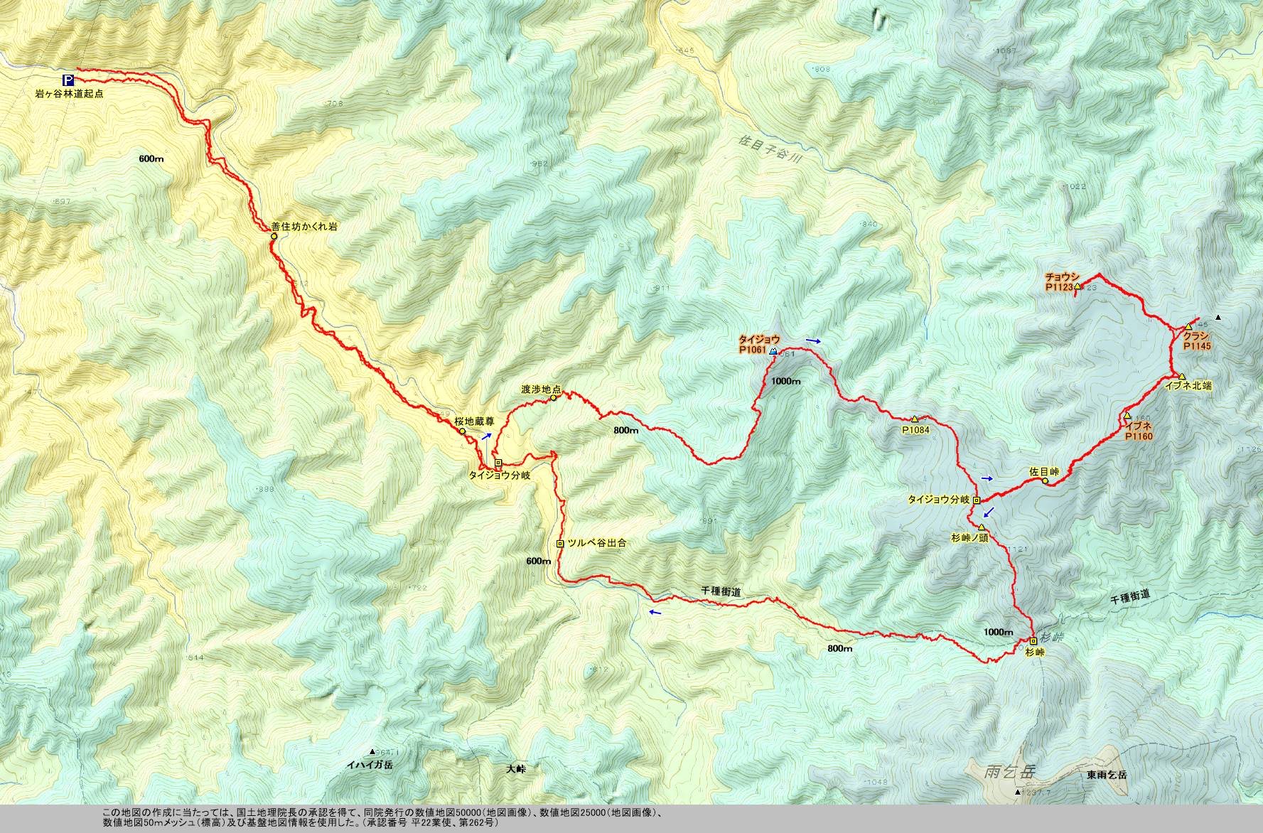| P → 《千種街道》 → タイジョウ分岐 → タイジョウ → 佐目峠 → イブネ → イブネ北端 → クラシ → チョウシ → イブネ → 佐目峠 → 杉峠ノ頭 → 杉峠 → 《千種街道》 → P | |