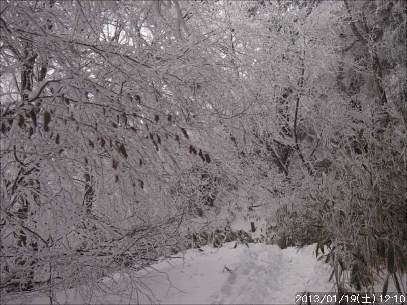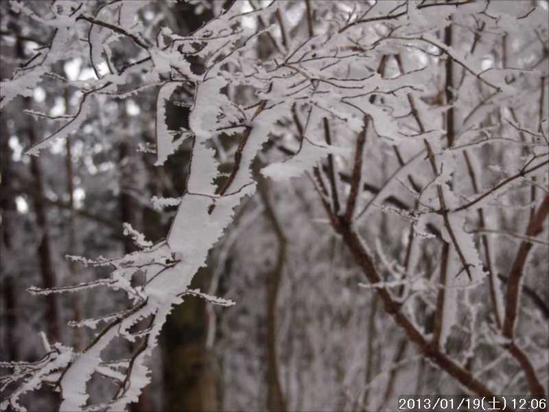 | 今週月曜日(14日 成人の日)は、関東地方では大雪が降った。都心の積雪は8㎝であったが、都市の交通機能は大きく乱れたとの報道。 関西も、一昨日(17日)から冷え込み、京都・滋賀の平地でも雪が降った。当初、綿向山に行こうかと思っていたが、今朝がたも、冷え込みが厳しいとの予報のため、北方面は道路の凍結が心配だ。 と云う事で、今回も身近な金剛に行くことにした。 出かける前に朝刊を見ていたら、今から行く予定の金剛山で、昨日(1/18)遭難騒ぎがあったとの記事が出ているではないか。 大阪のF高校の860名が金剛山頂に登り、水越峠への下山途中63名が道に迷って、110番通報したとの事、その後五條側で無事発見された。当日の積雪は山頂で50㎝、麓で20㎝あった との記事が出ていた。どのルートで迷ったのだろうか?、たとえどのルートに入っても1時間もあれば麓まで下ることが出来ると思うのだか・・ その新聞記事には、山頂で積雪50㎝とあった、今朝がたの冷え込みもあり霧氷も期待できる。天気もマアマアなので、たっぷりの雪と霧氷の冬山の山歩きが楽しめるか ルートは、五條(奈良側)から久留野峠を越えて大阪側に下り、タカハタ道で金剛山に登り返し、久留野峠もしくは千早峠からスタート地点に戻る予定とした。 タカハタ道は今回初めて。昨年のこの時期(2012-1-14)に今回のルートを歩くべく、出かけたが、腰折滝でツツジオ谷のルートに入ってしまったっため、今回改めてタカハタ道を目指すことにした。 千早峠・久留野峠から登るときに、いつも利用させてもらっている五万人の森公園の駐車場に車を置き出発。 駐車場から、県道261を東に向かう。3~400m進んだ鉄橋にあった表示板には気温がマイナス2°と出ていた、防寒着を着てはいるもののそれほど寒いとは感じない、風がないせいだろうか。 15分程度で久留野林道入り口に到着、この辺りに残雪は全くなし。林道入り口から数分で左に久留野峠への登山口がある。ここで林道を分れ山道に入り植林地の中を登って行く。山腹の九十九折れの道を登り一旦尾根に出て、今度は山腹を巻いて行く。その辺りから残雪が出てきた。 高度7~800m辺りまで来ると締まった雪からパウダー状の雪に変わり残雪の量も多くなってきた。前日以前に出来たトレースがかすかに残っている。 アイゼンは必要ないが、雪深くなってきたのでスパッツを付ける。 久留野峠に出ると、風が吹き抜けさすがに寒い。 登ってきた久留野道と違い、縦走路には多くの踏み跡があり、今から下る大阪方面にも踏み跡は多い。アイスバーンにはなっていないのでアイゼンは付けずに下って行く。踏み跡は多かったが麓の県道出合まで、登山者とはすれ違わなかった。 府道 富田林五條線に出て、大阪方面に下って行くと、途中多くの車が駐車しており、バスにも何台かすれ違う、冬の金剛山は人気の山だ。 金剛登山口のバス停を過ぎ、県道を分れ右に登って行く。登り詰めた突当たりを左に入る。右に行くと千早本道、ほとんどの人は右に行く。 その少し先の橋の手前を右の左岸沿いに行く、ここから地道。暫く行った小さな橋の手前右がタカハタ道への入り口。ガードレールの端にマジックで金剛山と書かれていた。 山道に入ってすぐ崖横に作られた細い道を、落っこちないように通過し、その先で渡渉し右岸沿いに登って行く、腰折滝の手前で滑り始めたのでアイゼンを装着、狭い場所で装着していたので後続者に迷惑をかけてしまった。そのすぐ先でタカハタ道への分岐があった、前回見逃した場所だ。 丸太橋を渡って真っすぐ川沿いに行くルートがツツジオ谷への道で、前回はそのルートしか目に入らず、突き進んだ。 丸太橋の手前左の谷に入るのがタカハタ道であるが、こちらの方が目立ちにくく、踏み跡も少ない。昭文社の地図にはタカハタ道は点線で出ているが、ツツジオ谷はルートの表示がない。現在、特に冬場は氷瀑が見られるツツジオ谷のルートの方が歩かれているようだ。 そのタカハタ道は初めは小さな谷の中を進んでいくが、谷沿いは荒れ気味であった。 谷を詰めた水場のあるところで谷を離れ山腹を尾根に登るようになると、急坂が始まる。雪にトレースがあるので外すことはないが、トレースがないと、少し分かりづらいのではないかと思われた。 喘ぎ喘ぎ登っていると、2組ほどとすれ違い、後続者が追いついてきた。 尾根端までたどり着くと、尾根先からの道と合流していた、そちらにもルートがあるようだ。ここからは尾根歩きで傾斜が緩やかになる。少し歩いたところで、ツツジオ谷道へ下る分岐があった。昨年はここから上がってきている。 タップリとある雪の中を登って行くと、霧氷が現れた。ここまで霧氷は全く見られなかったので、今日はダメかとあきらめていたが、高度のある吹きさらしの尾根に出ると、冬枯れした木々の小枝には、期待していた霧氷が付いていた。 六地蔵を右に見て、先日(2012-12-29)登ったカトラ谷からの道と合流し