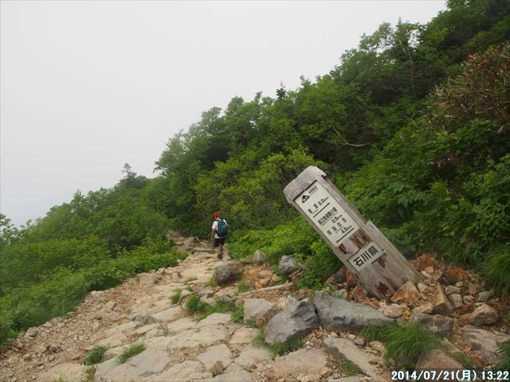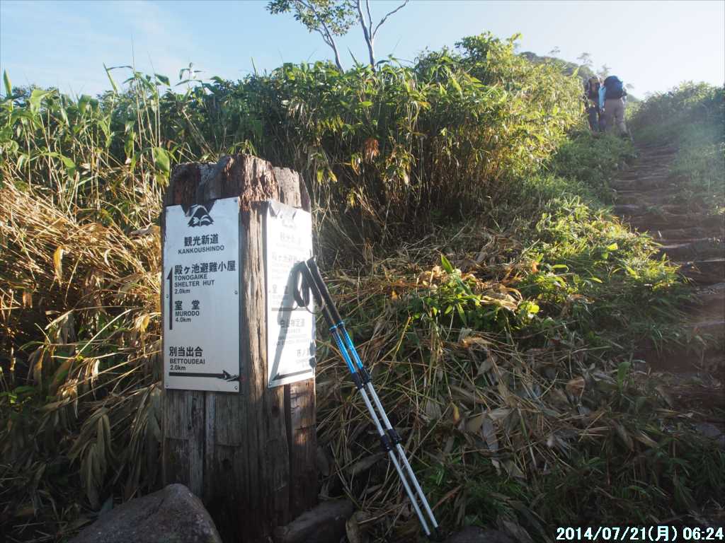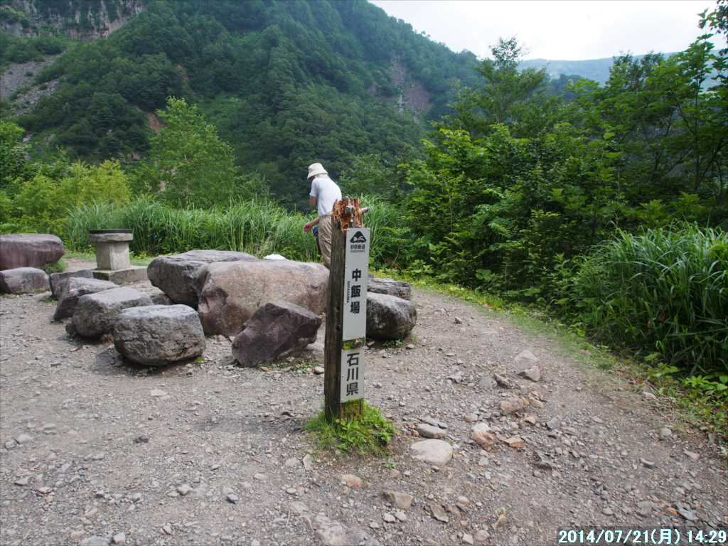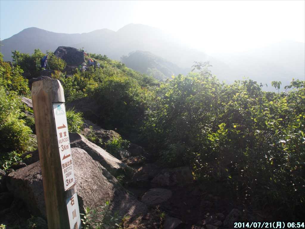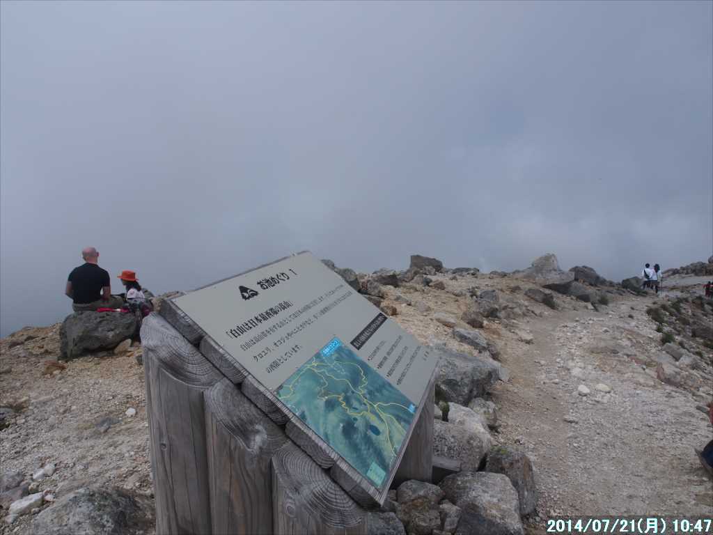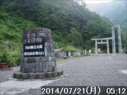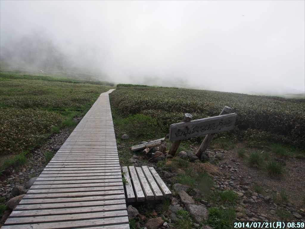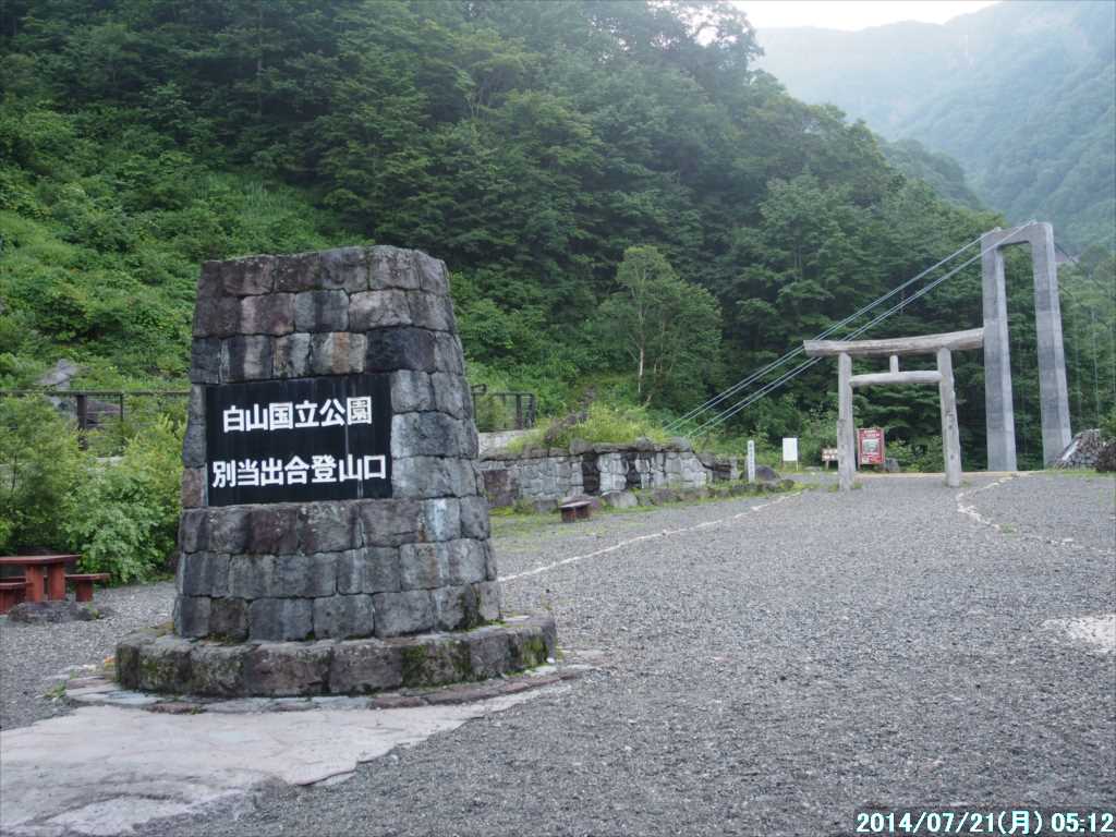 | 3連休(7/19~21)に入ったが、まだ梅雨は明けず不安定な天候が続いている。 連休初日と2日目は晴れていても突然にわか雨が降ったりした。 しかし、天気予報では連休の最終日(7/21)は全般的に好天になる模様との事 九州南部では既に今週半ば(7/16)に梅雨明けしており、近畿地方も梅雨明けとなるか? (その当日(7/21)に梅雨明けした) と言う事で、今年第一発目の長期遠征に出かける事にした。 目的地は「白山」。 3年前(2011-9-24)に登った経験があるが、今回は別ルートから登る事とした。 前回は大白川から平瀬道で往復したが、今回は別当出合からの往復だ。総上昇量は平瀬道と変わらないが、距離が短く白瀬道より初心者向けとの情報だ。 ただし、別当出合からのルートはシーズン中は市ノ瀬からバスでのアプローチとなる 奈良からは当日の出発は不可能なので、いつも通り前日の夕方に出発して車中泊だ。 車中泊の場所は高速のPA・SAからは現地まで遠いので、道の駅を探したが、行程の途中には残念ながらなかった。余分に十数キロ走る事になるが、「道の駅 瀬女」を利用させてもらう事とした。 夕方の5時に自宅を出発。近所のスーパーで食料を仕入れ現地へと向かう。 京滋パイパスの巨椋ICから高速に入り、途中の多賀SAで夕食を取る。北陸道の高山北ICで高速を降り、カーナビの案内に従い車中泊予定地の道の駅に向かう。途中コンビニに寄りスーパーになかったサンドイッチとおにぎりを調達。 高速をゆっくりと走った事もあり、現地の「道の駅 瀬女」に到着したのは10時になった。 駐車場はがら空きで、暗くてハッキリしなかったが停まっている車は2~3台程度。 運転中眠かったこともあり早速睡眠に入る。車がまだ熱を持っていおり少し暑く寝にくかったが、知らぬ間に寝てしまった。途中2~3度目が覚めたが、その間ほぼ熟睡出来た。 3時に起床予定であったが、少し前に目が覚めたのでそのまま起床とした。自販機でカップコーヒーを買おうとしたが、なかったので温かい缶コーヒーを購入しサンドイッチとパンの朝食を取る。 トイレをすまし ( 有難い事にウォッシュレットが実装されていた ) 、現地に出発。 「道の駅 瀬女」から 30分強で現地の市ノ瀬に到着。4時10分なのでまだ真っ暗。 途中で追いついた前の車に続いて第3駐車場に入ると入り口から見える範囲は満車状態。そのまま進むと係員がおり駐車位置を案内してくれた。奥の方はまだ余裕があった。(下山して市ノ瀬の第3駐車場を出て道路を戻って行くと、路駐した車が大分下の方にまで停まっていた、朝早く来て正解だった。) 朝一番のバスに乗るべく並んでいると、次第に列はドンドンと長くなっていった。 夜が明けてくると雲ひとつない青空が満天の空に広がっていた。この天気がお昼過ぎまで続き前回に引き続き大展望が望める事を期待したい。 連休の前半は天候が悪く、今日の好天を期待し満を持した登山者が一斉に訪れたようで、この賑わいになったようだ、聞くとこれだけの人出はやはり珍しいとの事であった。 5時10分ほど前に大型バスが3台到着した。今年から100円値上げされ片道500円になったバス代を支払い1台目のバスに乗車。当方は早く並んでいたので座れたが、通勤バスと同じく立っている人まで乗せ満車状態で定刻の数分前に出発。 10分程度で、スタート地点の別当出合に到着。 さて、「砂防新道」か「観光新道」か どちらから登るかで最後の最後まで迷う。 バス待ちの時に仕入れた情報では観光新道は、最初に厳しい道が続くが、展望は良くて花は多いとの事。一般的な砂防新道から登り、下りに観光新道を歩こうかと心にほぼ決めかけたが、鳥居を潜り分岐点まで来ると改めて迷いに迷う。 前回白山に登った時はもっと厳しいと言われる平瀬道から登っており、今はピーカンの天気であるが、下山時までこの天気が持つか分からないので、急遽ルートを変更し展望の良い観光新道の左に足を向ける。このルートに向かった登山者は1/3から1/4位で圧倒的に少なかった。 尾根出合の「別当坂分岐」まで、急傾斜の道が続く。 ルートはシッカリしているが傾斜か急なので足を大きく上にあげて一歩づつ体を押し上げて行く。このところバテバテの山歩きが続いていたので、ザックからツェルトなどを抜いて重量を軽くしてきたが、それでも急角度の登りでは体を持ち上げるのが重い。 「別当坂分岐」まで数組に追い抜かれる。大汗をかき「別当坂分岐」で一息ついていると、後からオバちゃんが涼しい顔で上がってきた。当方の体力不足を思い知らされる。 「別当坂分岐」からは尾根登りに変わるが、そこからも暫くの間は急傾斜が続いた。我慢して登るとやがて傾斜は緩やかになり、稜線歩きに変わり展望を見る余裕が出てきた、観光新道と名付けられている如く展望が良い。 暫く展望の良い小さな起伏の稜線を歩き、再び登りに変わり少し上がると、窪地に残雪があった。そのすぐ上が殿ヶ池避難小屋であるが、現在は建替え工事