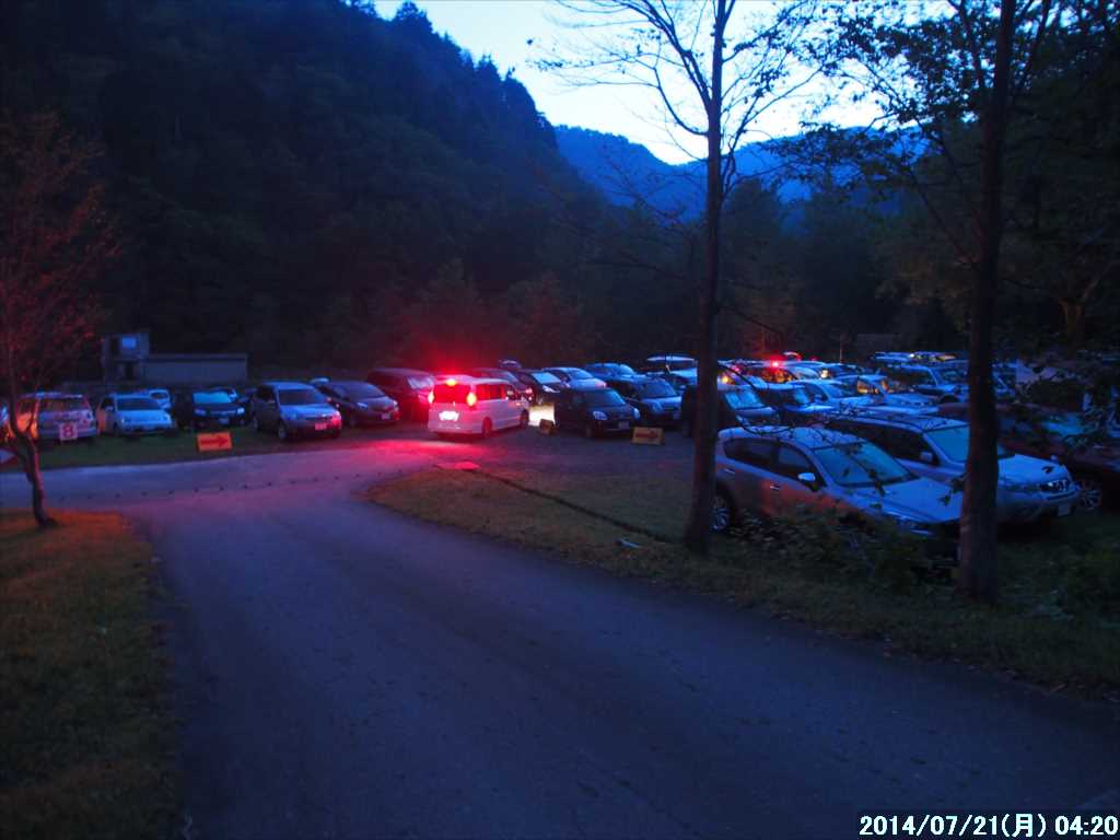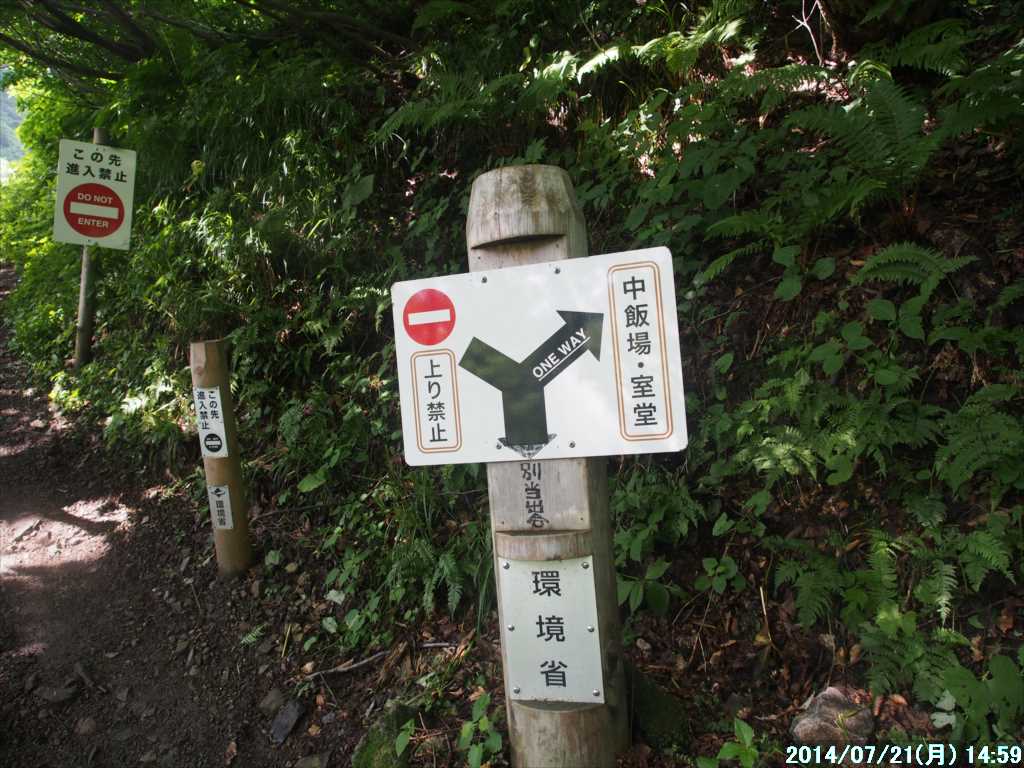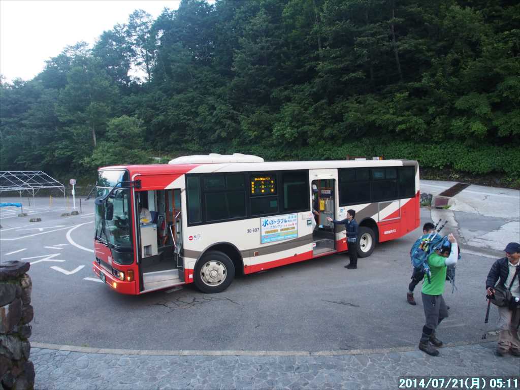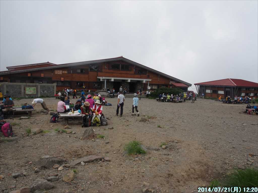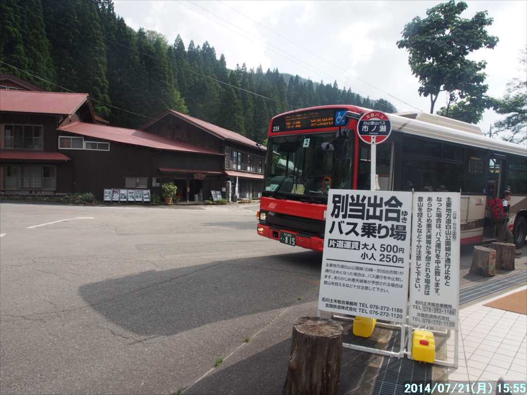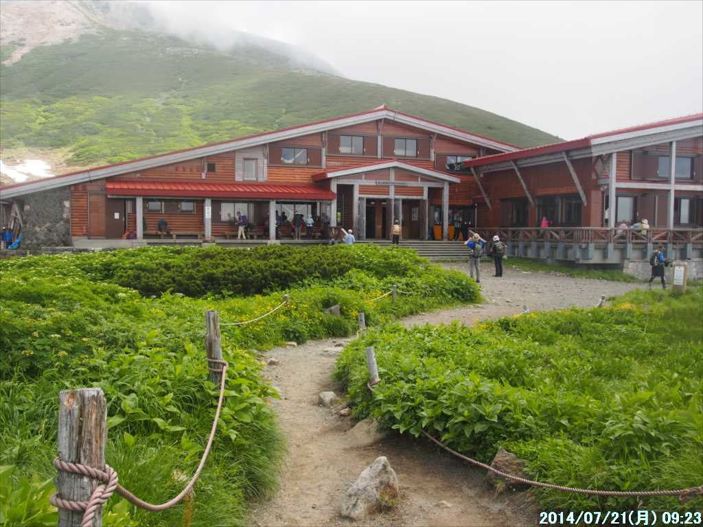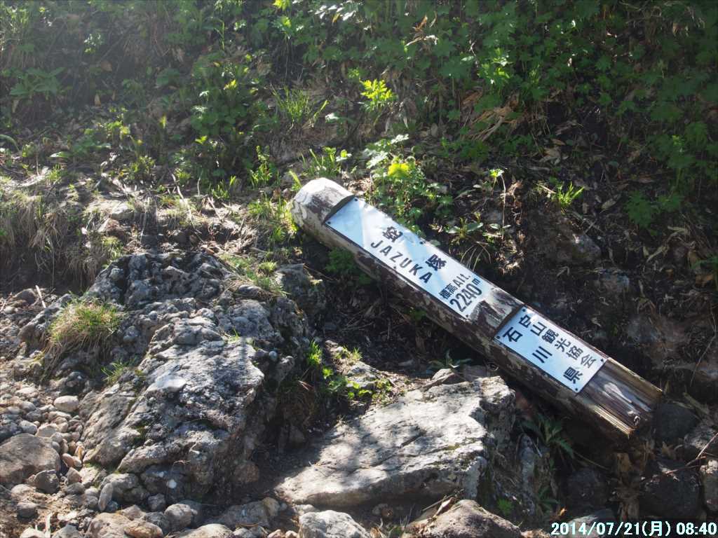 | 3連休(7/19~21)に入ったが、まだ梅雨は明けず不安定な天候が続いている。 連休初日と2日目は晴れていても突然にわか雨が降ったりした。 しかし、天気予報では連休の最終日(7/21)は全般的に好天になる模様との事 九州南部では既に今週半ば(7/16)に梅雨明けしており、近畿地方も梅雨明けとなるか? (その当日(7/21)に梅雨明けした) と言う事で、今年第一発目の長期遠征に出かける事にした。 目的地は「白山」。 3年前(2011-9-24)に登った経験があるが、今回は別ルートから登る事とした。 前回は大白川から平瀬道で往復したが、今回は別当出合からの往復だ。総上昇量は平瀬道と変わらないが、距離が短く白瀬道より初心者向けとの情報だ。 ただし、別当出合からのルートはシーズン中は市ノ瀬からバスでのアプローチとなる 奈良からは当日の出発は不可能なので、いつも通り前日の夕方に出発して車中泊だ。 車中泊の場所は高速のPA・SAからは現地まで遠いので、道の駅を探したが、行程の途中には残念ながらなかった。余分に十数キロ走る事になるが、「道の駅 瀬女」を利用させてもらう事とした。 夕方の5時に自宅を出発。近所のスーパーで食料を仕入れ現地へと向かう。 京滋パイパスの巨椋ICから高速に入り、途中の多賀SAで夕食を取る。北陸道の高山北ICで高速を降り、カーナビの案内に従い車中泊予定地の道の駅に向かう。途中コンビニに寄りスーパーになかったサンドイッチとおにぎりを調達。 高速をゆっくりと走った事もあり、現地の「道の駅 瀬女」に到着したのは10時になった。 駐車場はがら空きで、暗くてハッキリしなかったが停まっている車は2~3台程度。 運転中眠かったこともあり早速睡眠に入る。車がまだ熱を持っていおり少し暑く寝にくかったが、知らぬ間に寝てしまった。途中2~3度目が覚めたが、その間ほぼ熟睡出来た。 3時に起床予定であったが、少し前に目が覚めたのでそのまま起床とした。自販機でカップコーヒーを買おうとしたが、なかったので温かい缶コーヒーを購入しサンドイッチとパンの朝食を取る。 トイレをすまし ( 有難い事にウォッシュレットが実装されていた ) 、現地に出発。 「道の駅 瀬女」から 30分強で現地の市ノ瀬に到着。4時10分なのでまだ真っ暗。 途中で追いついた前の車に続いて第3駐車場に入ると入り口から見える範囲は満車状態。そのまま進むと係員がおり駐車位置を案内してくれた。奥の方はまだ余裕があった。(下山して市ノ瀬の第3駐車場を出て道路を戻って行くと、路駐した車が大分下の方にまで停まっていた、朝早く来て正解だった。) 朝一番のバスに乗るべく並んでいると、次第に列はドンドンと長くなっていった。 夜が明けてくると雲ひとつない青空が満天の空に広がっていた。この天気がお昼過ぎまで続き前回に引き続き大展望が望める事を期待したい。 連休の前半は天候が悪く、今日の好天を期待し満を持した登山者が一斉に訪れたようで、この賑わいになったようだ、聞くとこれだけの人出はやはり珍しいとの事であった。 5時10分ほど前に大型バスが3台到着した。今年から100円値上げされ片道500円になったバス代を支払い1台目のバスに乗車。当方は早く並んでいたので座れたが、通勤バスと同じく立っている人まで乗せ満車状態で定刻の数分前に出発。 10分程度で、スタート地点の別当出合に到着。 さて、「砂防新道」か「観光新道」か どちらから登るかで最後の最後まで迷う。 バス待ちの時に仕入れた情報では観光新道は、最初に厳しい道が続くが、展望は良くて花は多いとの事。一般的な砂防新道から登り、下りに観光新道を歩こうかと心にほぼ決めかけたが、鳥居を潜り分岐点まで来ると改めて迷いに迷う。 前回白山に登った時はもっと厳しいと言われる平瀬道から登っており、今はピーカンの天気であるが、下山時までこの天気が持つか分からないので、急遽ルートを変更し展望の良い観光新道の左に足を向ける。このルートに向かった登山者は1/3から1/4位で圧倒的に少なかった。 尾根出合の「別当坂分岐」まで、急傾斜の道が続く。 ルートはシッカリしているが傾斜か急なので足を大きく上にあげて一歩づつ体を押し上げて行く。このところバテバテの山歩きが続いていたので、ザックからツェルトなどを抜いて重量を軽くしてきたが、それでも急角度の登りでは体を持ち上げるのが重い。 「別当坂分岐」まで数組に追い抜かれる。大汗をかき「別当坂分岐」で一息ついていると、後からオバちゃんが涼しい顔で上がってきた。当方の体力不足を思い知らされる。 「別当坂分岐」からは尾根登りに変わるが、そこからも暫くの間は急傾斜が続いた。我慢して登るとやがて傾斜は緩やかになり、稜線歩きに変わり展望を見る余裕が出てきた、観光新道と名付けられている如く展望が良い。 暫く展望の良い小さな起伏の稜線を歩き、再び登りに変わり少し上がると、窪地に残雪があった。そのすぐ上が殿ヶ池避難小屋であるが、現在は建替え工事