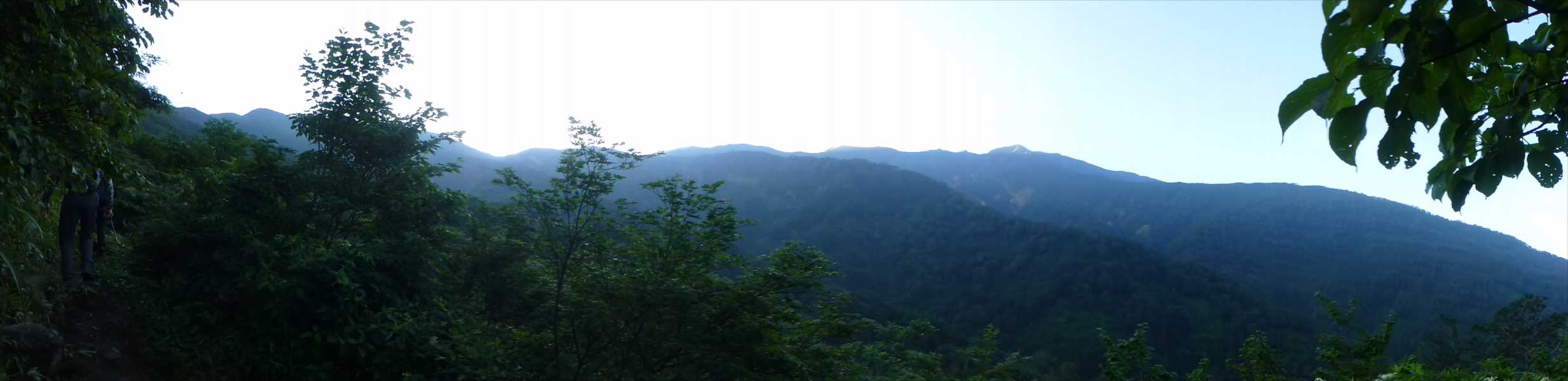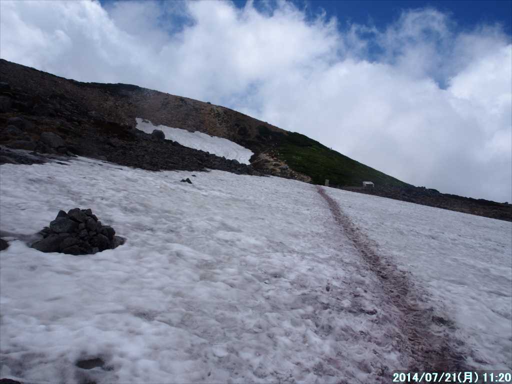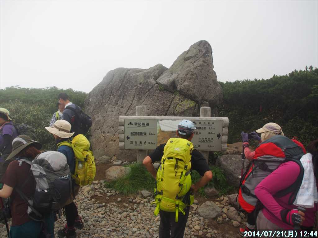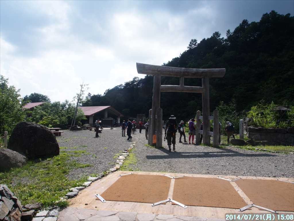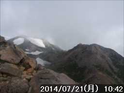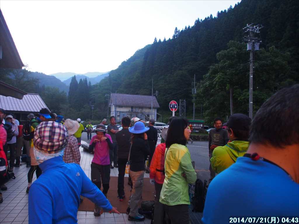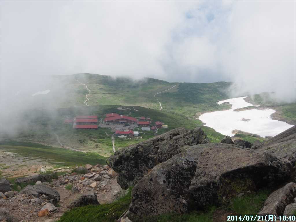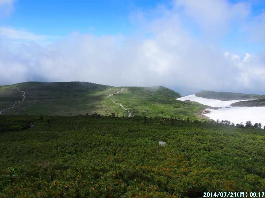 | 3連休(7/19~21)に入ったが、まだ梅雨は明けず不安定な天候が続いている。 連休初日と2日目は晴れていても突然にわか雨が降ったりした。 しかし、天気予報では連休の最終日(7/21)は全般的に好天になる模様との事 九州南部では既に今週半ば(7/16)に梅雨明けしており、近畿地方も梅雨明けとなるか? (その当日(7/21)に梅雨明けした) と言う事で、今年第一発目の長期遠征に出かける事にした。 目的地は「白山」。 3年前(2011-9-24)に登った経験があるが、今回は別ルートから登る事とした。 前回は大白川から平瀬道で往復したが、今回は別当出合からの往復だ。総上昇量は平瀬道と変わらないが、距離が短く白瀬道より初心者向けとの情報だ。 ただし、別当出合からのルートはシーズン中は市ノ瀬からバスでのアプローチとなる 奈良からは当日の出発は不可能なので、いつも通り前日の夕方に出発して車中泊だ。 車中泊の場所は高速のPA・SAからは現地まで遠いので、道の駅を探したが、行程の途中には残念ながらなかった。余分に十数キロ走る事になるが、「道の駅 瀬女」を利用させてもらう事とした。 夕方の5時に自宅を出発。近所のスーパーで食料を仕入れ現地へと向かう。 京滋パイパスの巨椋ICから高速に入り、途中の多賀SAで夕食を取る。北陸道の高山北ICで高速を降り、カーナビの案内に従い車中泊予定地の道の駅に向かう。途中コンビニに寄りスーパーになかったサンドイッチとおにぎりを調達。 高速をゆっくりと走った事もあり、現地の「道の駅 瀬女」に到着したのは10時になった。 駐車場はがら空きで、暗くてハッキリしなかったが停まっている車は2~3台程度。 運転中眠かったこともあり早速睡眠に入る。車がまだ熱を持っていおり少し暑く寝にくかったが、知らぬ間に寝てしまった。途中2~3度目が覚めたが、その間ほぼ熟睡出来た。 3時に起床予定であったが、少し前に目が覚めたのでそのまま起床とした。自販機でカップコーヒーを買おうとしたが、なかったので温かい缶コーヒーを購入しサンドイッチとパンの朝食を取る。 トイレをすまし ( 有難い事にウォッシュレットが実装されていた ) 、現地に出発。 「道の駅 瀬女」から 30分強で現地の市ノ瀬に到着。4時10分なのでまだ真っ暗。 途中で追いついた前の車に続いて第3駐車場に入ると入り口から見える範囲は満車状態。そのまま進むと係員がおり駐車位置を案内してくれた。奥の方はまだ余裕があった。(下山して市ノ瀬の第3駐車場を出て道路を戻って行くと、路駐した車が大分下の方にまで停まっていた、朝早く来て正解だった。) 朝一番のバスに乗るべく並んでいると、次第に列はドンドンと長くなっていった。 夜が明けてくると雲ひとつない青空が満天の空に広がっていた。この天気がお昼過ぎまで続き前回に引き続き大展望が望める事を期待したい。 連休の前半は天候が悪く、今日の好天を期待し満を持した登山者が一斉に訪れたようで、この賑わいになったようだ、聞くとこれだけの人出はやはり珍しいとの事であった。 5時10分ほど前に大型バスが3台到着した。今年から100円値上げされ片道500円になったバス代を支払い1台目のバスに乗車。当方は早く並んでいたので座れたが、通勤バスと同じく立っている人まで乗せ満車状態で定刻の数分前に出発。 10分程度で、スタート地点の別当出合に到着。 さて、「砂防新道」か「観光新道」か どちらから登るかで最後の最後まで迷う。 バス待ちの時に仕入れた情報では観光新道は、最初に厳しい道が続くが、展望は良くて花は多いとの事。一般的な砂防新道から登り、下りに観光新道を歩こうかと心にほぼ決めかけたが、鳥居を潜り分岐点まで来ると改めて迷いに迷う。 前回白山に登った時はもっと厳しいと言われる平瀬道から登っており、今はピーカンの天気であるが、下山時までこの天気が持つか分からないので、急遽ルートを変更し展望の良い観光新道の左に足を向ける。このルートに向かった登山者は1/3から1/4位で圧倒的に少なかった。 尾根出合の「別当坂分岐」まで、急傾斜の道が続く。 ルートはシッカリしているが傾斜か急なので足を大きく上にあげて一歩づつ体を押し上げて行く。このところバテバテの山歩きが続いていたので、ザックからツェルトなどを抜いて重量を軽くしてきたが、それでも急角度の登りでは体を持ち上げるのが重い。 「別当坂分岐」まで数組に追い抜かれる。大汗をかき「別当坂分岐」で一息ついていると、後からオバちゃんが涼しい顔で上がってきた。当方の体力不足を思い知らされる。 「別当坂分岐」からは尾根登りに変わるが、そこからも暫くの間は急傾斜が続いた。我慢して登るとやがて傾斜は緩やかになり、稜線歩きに変わり展望を見る余裕が出てきた、観光新道と名付けられている如く展望が良い。 暫く展望の良い小さな起伏の稜線を歩き、再び登りに変わり少し上がると、窪地に残雪があった。そのすぐ上が殿ヶ池避難小屋であるが、現在は建替え工事