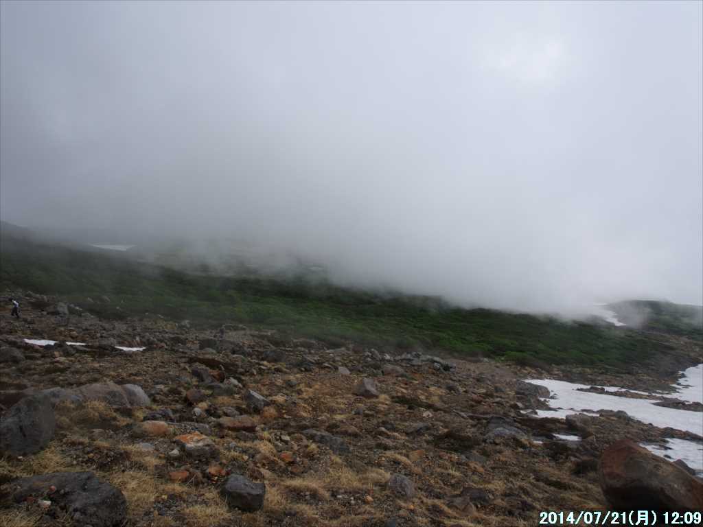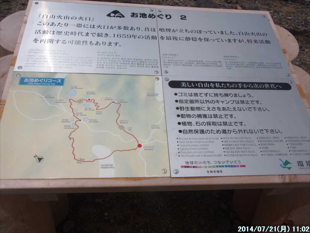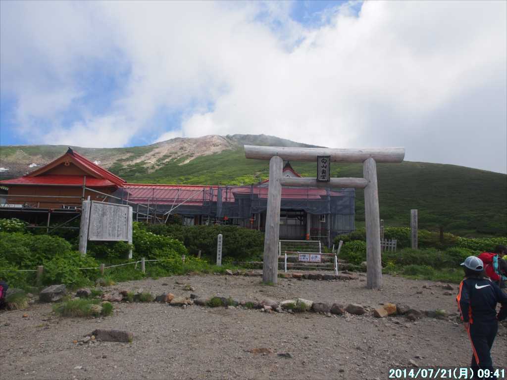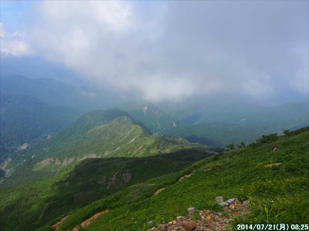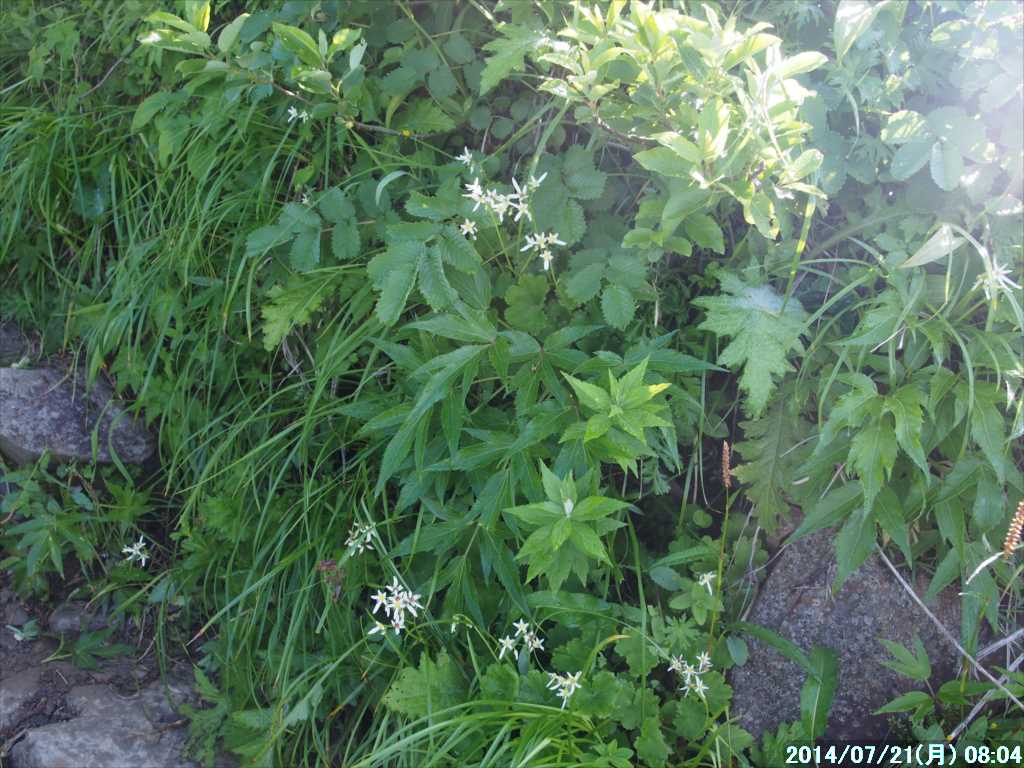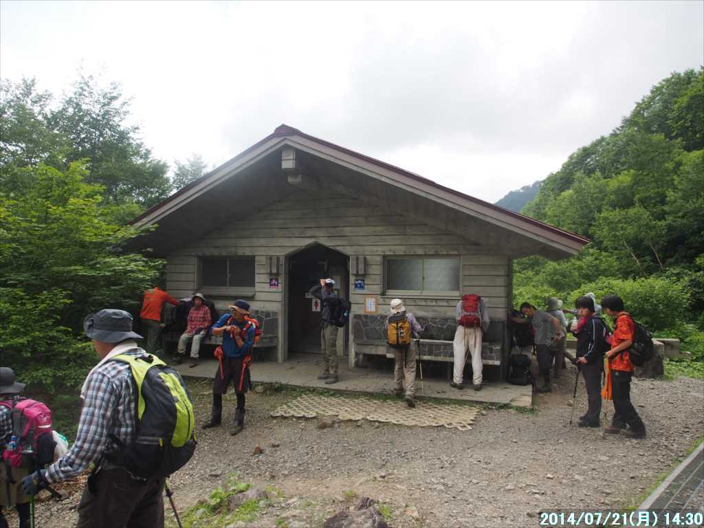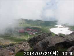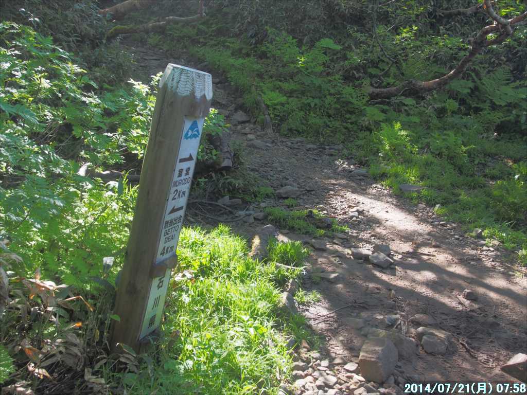 | 3連休(7/19~21)に入ったが、まだ梅雨は明けず不安定な天候が続いている。 連休初日と2日目は晴れていても突然にわか雨が降ったりした。 しかし、天気予報では連休の最終日(7/21)は全般的に好天になる模様との事 九州南部では既に今週半ば(7/16)に梅雨明けしており、近畿地方も梅雨明けとなるか? (その当日(7/21)に梅雨明けした) と言う事で、今年第一発目の長期遠征に出かける事にした。 目的地は「白山」。 3年前(2011-9-24)に登った経験があるが、今回は別ルートから登る事とした。 前回は大白川から平瀬道で往復したが、今回は別当出合からの往復だ。総上昇量は平瀬道と変わらないが、距離が短く白瀬道より初心者向けとの情報だ。 ただし、別当出合からのルートはシーズン中は市ノ瀬からバスでのアプローチとなる 奈良からは当日の出発は不可能なので、いつも通り前日の夕方に出発して車中泊だ。 車中泊の場所は高速のPA・SAからは現地まで遠いので、道の駅を探したが、行程の途中には残念ながらなかった。余分に十数キロ走る事になるが、「道の駅 瀬女」を利用させてもらう事とした。 夕方の5時に自宅を出発。近所のスーパーで食料を仕入れ現地へと向かう。 京滋パイパスの巨椋ICから高速に入り、途中の多賀SAで夕食を取る。北陸道の高山北ICで高速を降り、カーナビの案内に従い車中泊予定地の道の駅に向かう。途中コンビニに寄りスーパーになかったサンドイッチとおにぎりを調達。 高速をゆっくりと走った事もあり、現地の「道の駅 瀬女」に到着したのは10時になった。 駐車場はがら空きで、暗くてハッキリしなかったが停まっている車は2~3台程度。 運転中眠かったこともあり早速睡眠に入る。車がまだ熱を持っていおり少し暑く寝にくかったが、知らぬ間に寝てしまった。途中2~3度目が覚めたが、その間ほぼ熟睡出来た。 3時に起床予定であったが、少し前に目が覚めたのでそのまま起床とした。自販機でカップコーヒーを買おうとしたが、なかったので温かい缶コーヒーを購入しサンドイッチとパンの朝食を取る。 トイレをすまし ( 有難い事にウォッシュレットが実装されていた ) 、現地に出発。 「道の駅 瀬女」から 30分強で現地の市ノ瀬に到着。4時10分なのでまだ真っ暗。 途中で追いついた前の車に続いて第3駐車場に入ると入り口から見える範囲は満車状態。そのまま進むと係員がおり駐車位置を案内してくれた。奥の方はまだ余裕があった。(下山して市ノ瀬の第3駐車場を出て道路を戻って行くと、路駐した車が大分下の方にまで停まっていた、朝早く来て正解だった。) 朝一番のバスに乗るべく並んでいると、次第に列はドンドンと長くなっていった。 夜が明けてくると雲ひとつない青空が満天の空に広がっていた。この天気がお昼過ぎまで続き前回に引き続き大展望が望める事を期待したい。 連休の前半は天候が悪く、今日の好天を期待し満を持した登山者が一斉に訪れたようで、この賑わいになったようだ、聞くとこれだけの人出はやはり珍しいとの事であった。 5時10分ほど前に大型バスが3台到着した。今年から100円値上げされ片道500円になったバス代を支払い1台目のバスに乗車。当方は早く並んでいたので座れたが、通勤バスと同じく立っている人まで乗せ満車状態で定刻の数分前に出発。 10分程度で、スタート地点の別当出合に到着。 さて、「砂防新道」か「観光新道」か どちらから登るかで最後の最後まで迷う。 バス待ちの時に仕入れた情報では観光新道は、最初に厳しい道が続くが、展望は良くて花は多いとの事。一般的な砂防新道から登り、下りに観光新道を歩こうかと心にほぼ決めかけたが、鳥居を潜り分岐点まで来ると改めて迷いに迷う。 前回白山に登った時はもっと厳しいと言われる平瀬道から登っており、今はピーカンの天気であるが、下山時までこの天気が持つか分からないので、急遽ルートを変更し展望の良い観光新道の左に足を向ける。このルートに向かった登山者は1/3から1/4位で圧倒的に少なかった。 尾根出合の「別当坂分岐」まで、急傾斜の道が続く。 ルートはシッカリしているが傾斜か急なので足を大きく上にあげて一歩づつ体を押し上げて行く。このところバテバテの山歩きが続いていたので、ザックからツェルトなどを抜いて重量を軽くしてきたが、それでも急角度の登りでは体を持ち上げるのが重い。 「別当坂分岐」まで数組に追い抜かれる。大汗をかき「別当坂分岐」で一息ついていると、後からオバちゃんが涼しい顔で上がってきた。当方の体力不足を思い知らされる。 「別当坂分岐」からは尾根登りに変わるが、そこからも暫くの間は急傾斜が続いた。我慢して登るとやがて傾斜は緩やかになり、稜線歩きに変わり展望を見る余裕が出てきた、観光新道と名付けられている如く展望が良い。 暫く展望の良い小さな起伏の稜線を歩き、再び登りに変わり少し上がると、窪地に残雪があった。そのすぐ上が殿ヶ池避難小屋であるが、現在は建替え工事