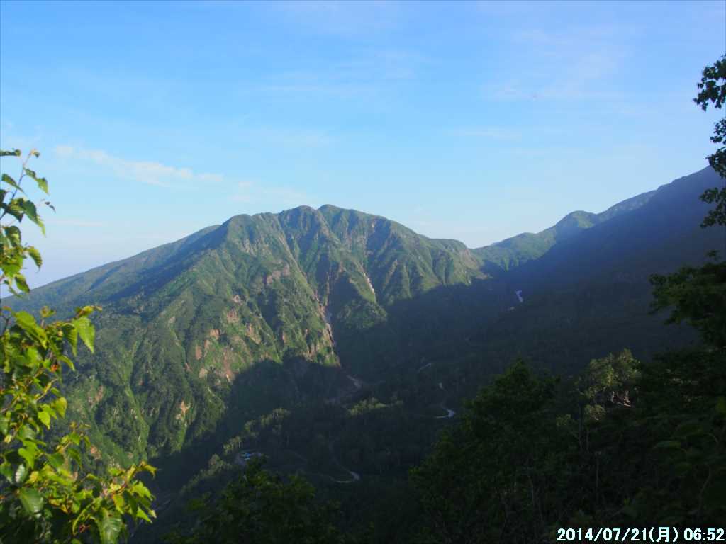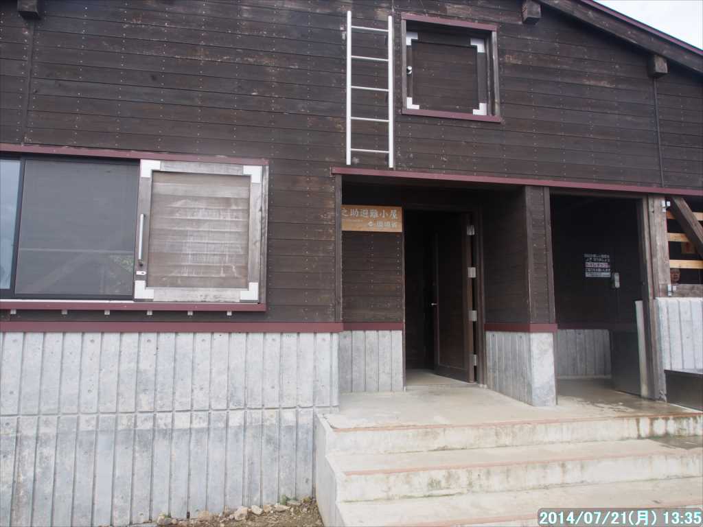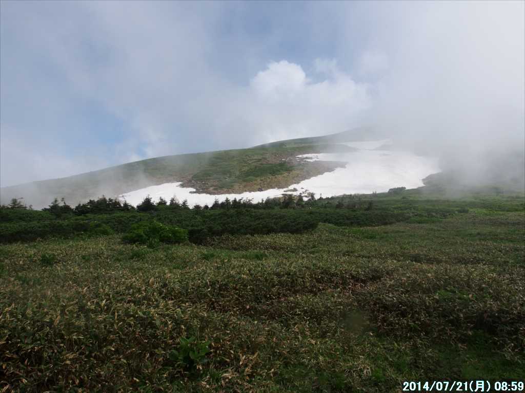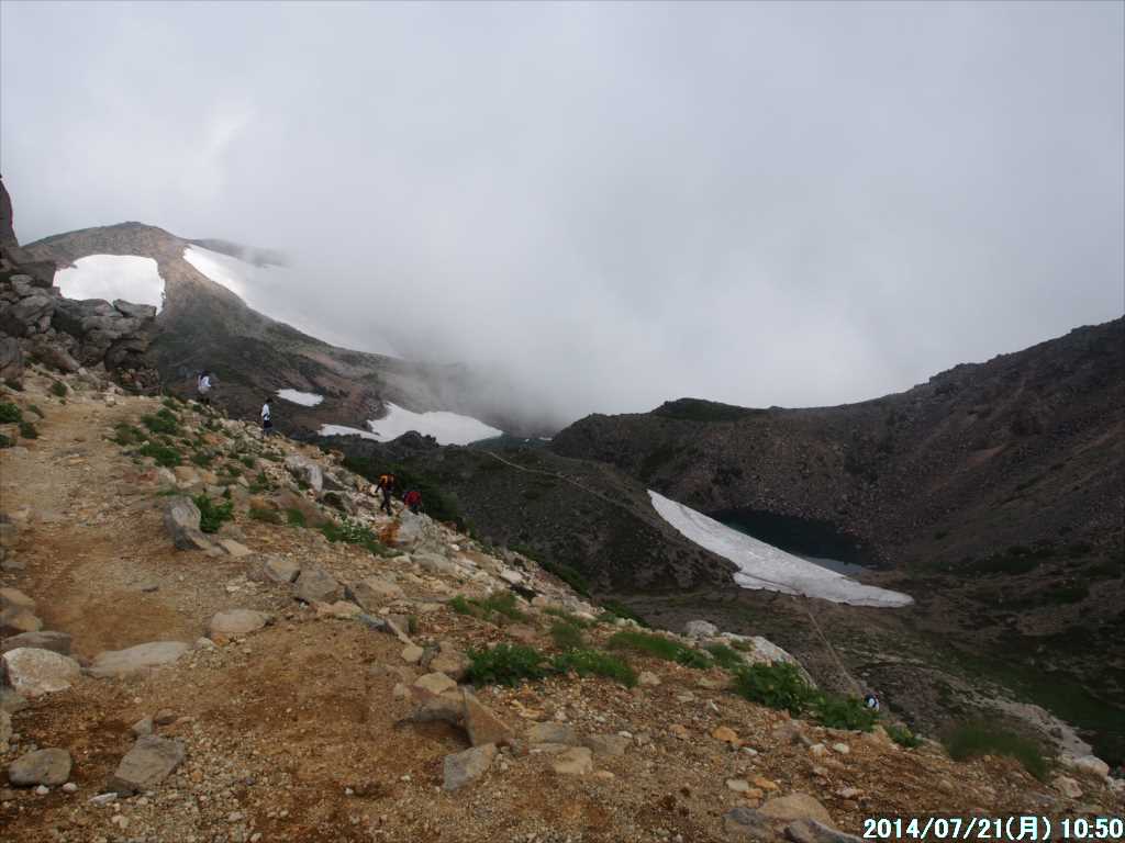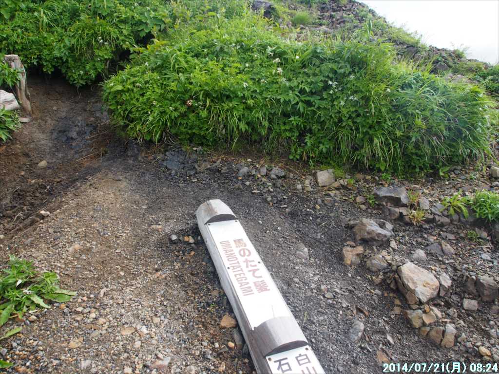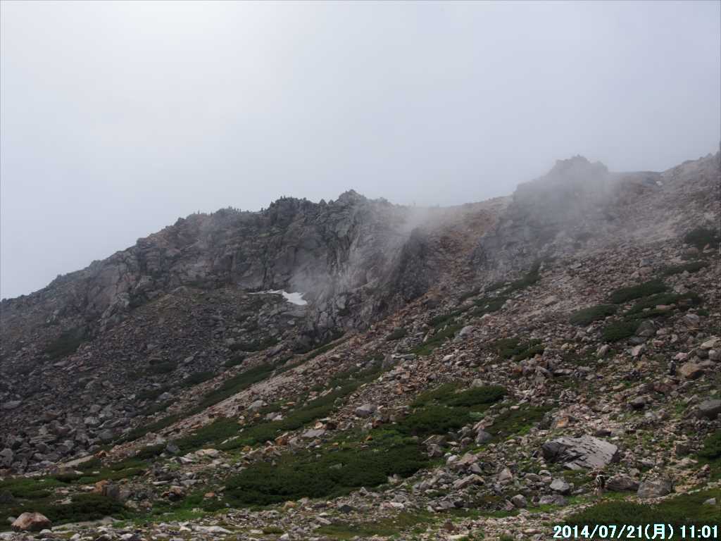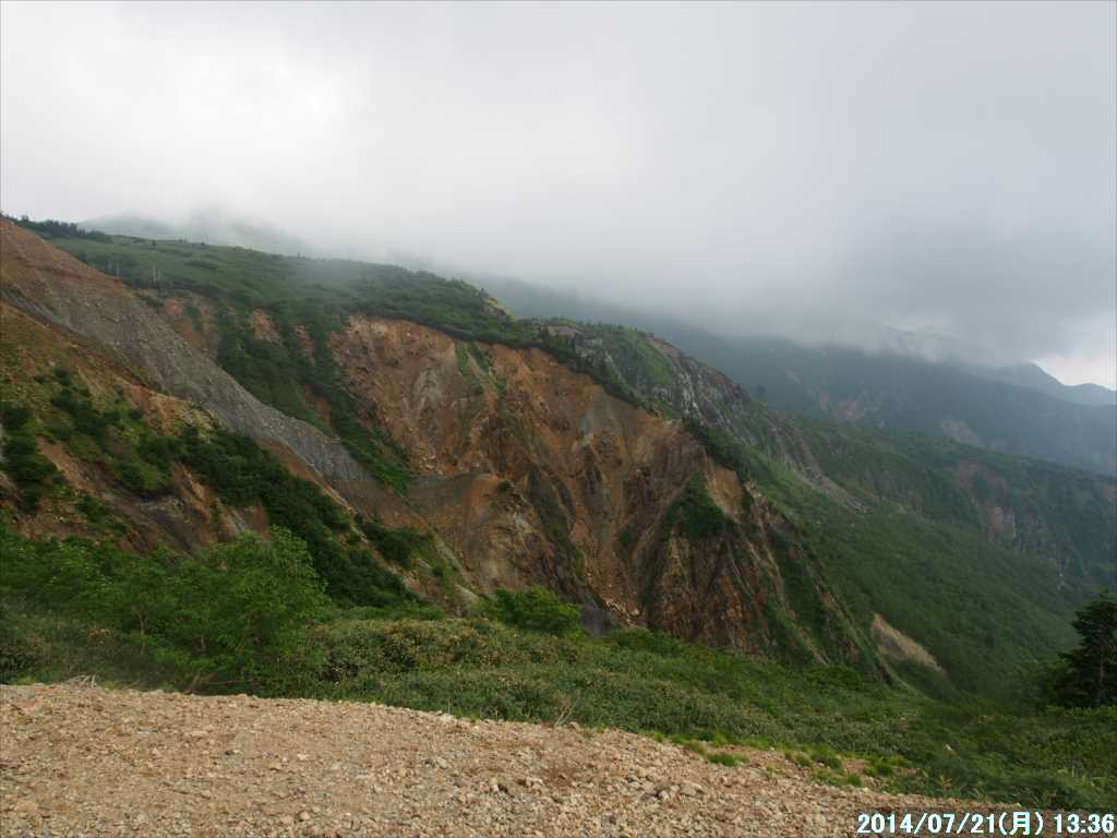 | 3連休(7/19~21)に入ったが、まだ梅雨は明けず不安定な天候が続いている。 連休初日と2日目は晴れていても突然にわか雨が降ったりした。 しかし、天気予報では連休の最終日(7/21)は全般的に好天になる模様との事 九州南部では既に今週半ば(7/16)に梅雨明けしており、近畿地方も梅雨明けとなるか? (その当日(7/21)に梅雨明けした) と言う事で、今年第一発目の長期遠征に出かける事にした。 目的地は「白山」。 3年前(2011-9-24)に登った経験があるが、今回は別ルートから登る事とした。 前回は大白川から平瀬道で往復したが、今回は別当出合からの往復だ。総上昇量は平瀬道と変わらないが、距離が短く白瀬道より初心者向けとの情報だ。 ただし、別当出合からのルートはシーズン中は市ノ瀬からバスでのアプローチとなる 奈良からは当日の出発は不可能なので、いつも通り前日の夕方に出発して車中泊だ。 車中泊の場所は高速のPA・SAからは現地まで遠いので、道の駅を探したが、行程の途中には残念ながらなかった。余分に十数キロ走る事になるが、「道の駅 瀬女」を利用させてもらう事とした。 夕方の5時に自宅を出発。近所のスーパーで食料を仕入れ現地へと向かう。 京滋パイパスの巨椋ICから高速に入り、途中の多賀SAで夕食を取る。北陸道の高山北ICで高速を降り、カーナビの案内に従い車中泊予定地の道の駅に向かう。途中コンビニに寄りスーパーになかったサンドイッチとおにぎりを調達。 高速をゆっくりと走った事もあり、現地の「道の駅 瀬女」に到着したのは10時になった。 駐車場はがら空きで、暗くてハッキリしなかったが停まっている車は2~3台程度。 運転中眠かったこともあり早速睡眠に入る。車がまだ熱を持っていおり少し暑く寝にくかったが、知らぬ間に寝てしまった。途中2~3度目が覚めたが、その間ほぼ熟睡出来た。 3時に起床予定であったが、少し前に目が覚めたのでそのまま起床とした。自販機でカップコーヒーを買おうとしたが、なかったので温かい缶コーヒーを購入しサンドイッチとパンの朝食を取る。 トイレをすまし ( 有難い事にウォッシュレットが実装されていた ) 、現地に出発。 「道の駅 瀬女」から 30分強で現地の市ノ瀬に到着。4時10分なのでまだ真っ暗。 途中で追いついた前の車に続いて第3駐車場に入ると入り口から見える範囲は満車状態。そのまま進むと係員がおり駐車位置を案内してくれた。奥の方はまだ余裕があった。(下山して市ノ瀬の第3駐車場を出て道路を戻って行くと、路駐した車が大分下の方にまで停まっていた、朝早く来て正解だった。) 朝一番のバスに乗るべく並んでいると、次第に列はドンドンと長くなっていった。 夜が明けてくると雲ひとつない青空が満天の空に広がっていた。この天気がお昼過ぎまで続き前回に引き続き大展望が望める事を期待したい。 連休の前半は天候が悪く、今日の好天を期待し満を持した登山者が一斉に訪れたようで、この賑わいになったようだ、聞くとこれだけの人出はやはり珍しいとの事であった。 5時10分ほど前に大型バスが3台到着した。今年から100円値上げされ片道500円になったバス代を支払い1台目のバスに乗車。当方は早く並んでいたので座れたが、通勤バスと同じく立っている人まで乗せ満車状態で定刻の数分前に出発。 10分程度で、スタート地点の別当出合に到着。 さて、「砂防新道」か「観光新道」か どちらから登るかで最後の最後まで迷う。 バス待ちの時に仕入れた情報では観光新道は、最初に厳しい道が続くが、展望は良くて花は多いとの事。一般的な砂防新道から登り、下りに観光新道を歩こうかと心にほぼ決めかけたが、鳥居を潜り分岐点まで来ると改めて迷いに迷う。 前回白山に登った時はもっと厳しいと言われる平瀬道から登っており、今はピーカンの天気であるが、下山時までこの天気が持つか分からないので、急遽ルートを変更し展望の良い観光新道の左に足を向ける。このルートに向かった登山者は1/3から1/4位で圧倒的に少なかった。 尾根出合の「別当坂分岐」まで、急傾斜の道が続く。 ルートはシッカリしているが傾斜か急なので足を大きく上にあげて一歩づつ体を押し上げて行く。このところバテバテの山歩きが続いていたので、ザックからツェルトなどを抜いて重量を軽くしてきたが、それでも急角度の登りでは体を持ち上げるのが重い。 「別当坂分岐」まで数組に追い抜かれる。大汗をかき「別当坂分岐」で一息ついていると、後からオバちゃんが涼しい顔で上がってきた。当方の体力不足を思い知らされる。 「別当坂分岐」からは尾根登りに変わるが、そこからも暫くの間は急傾斜が続いた。我慢して登るとやがて傾斜は緩やかになり、稜線歩きに変わり展望を見る余裕が出てきた、観光新道と名付けられている如く展望が良い。 暫く展望の良い小さな起伏の稜線を歩き、再び登りに変わり少し上がると、窪地に残雪があった。そのすぐ上が殿ヶ池避難小屋であるが、現在は建替え工事