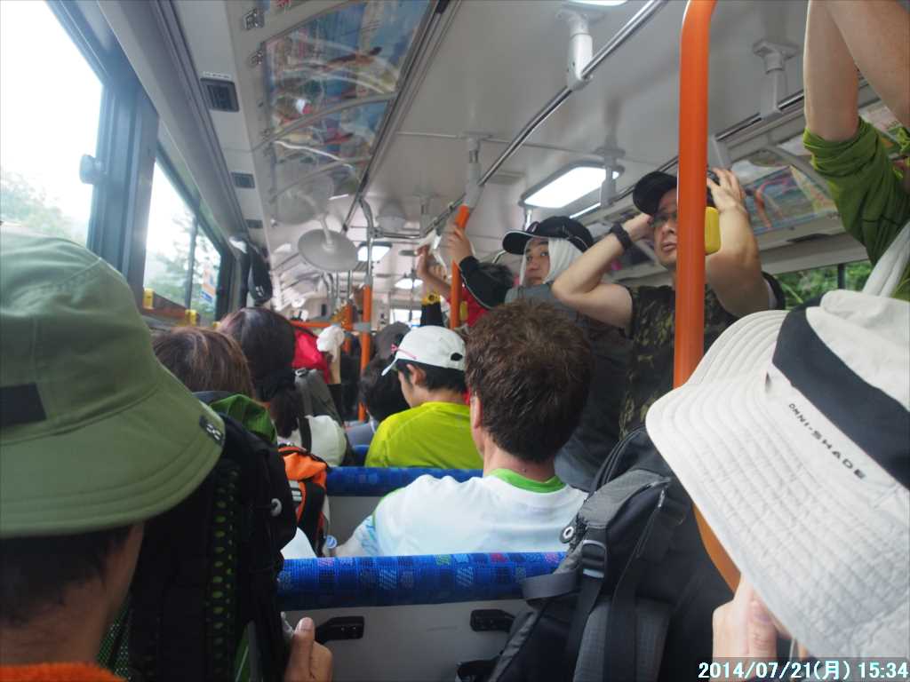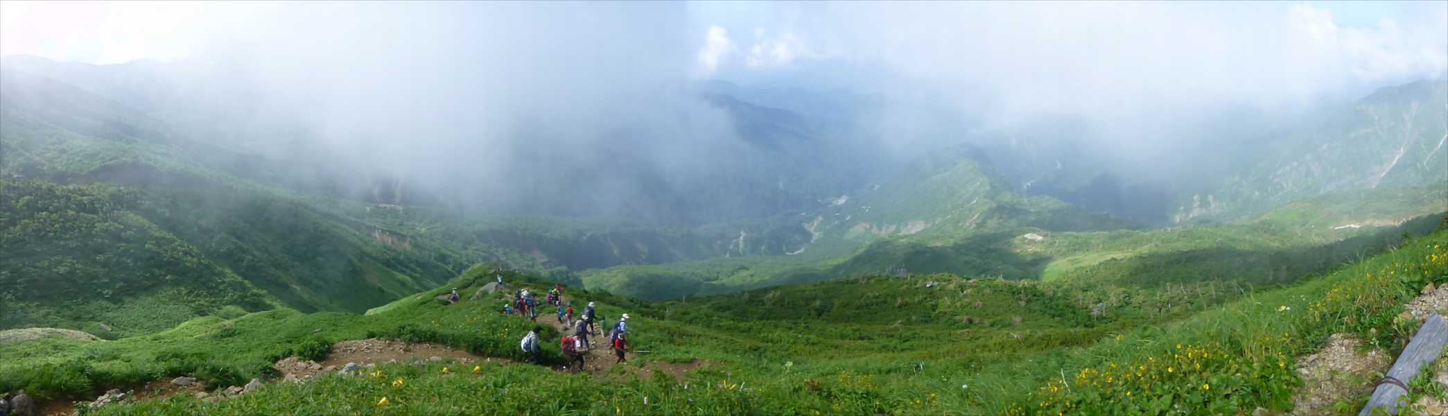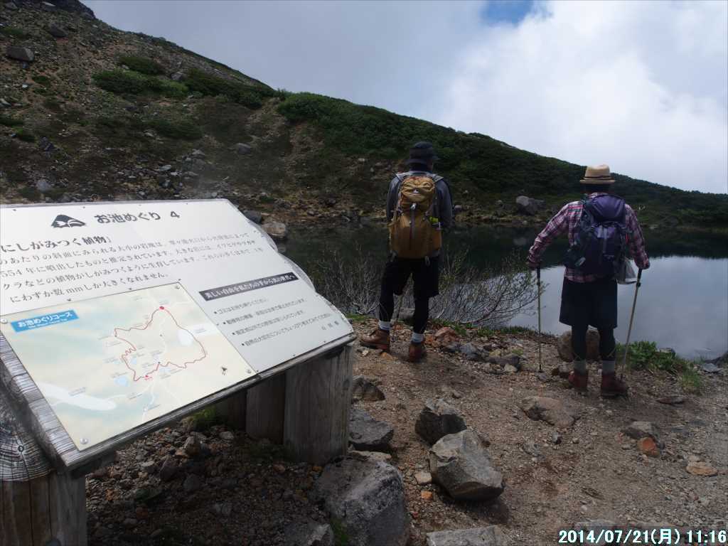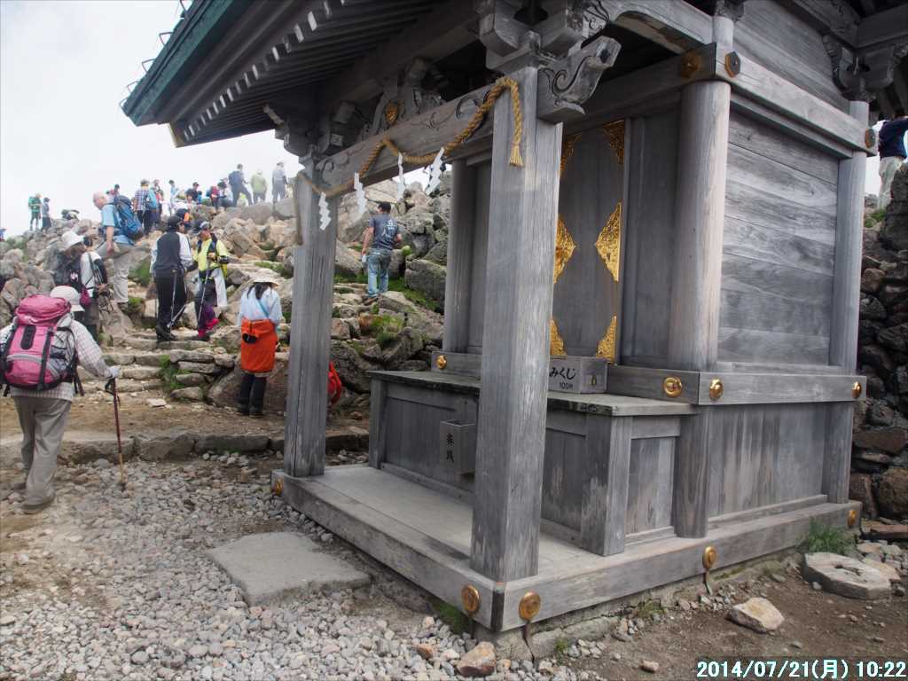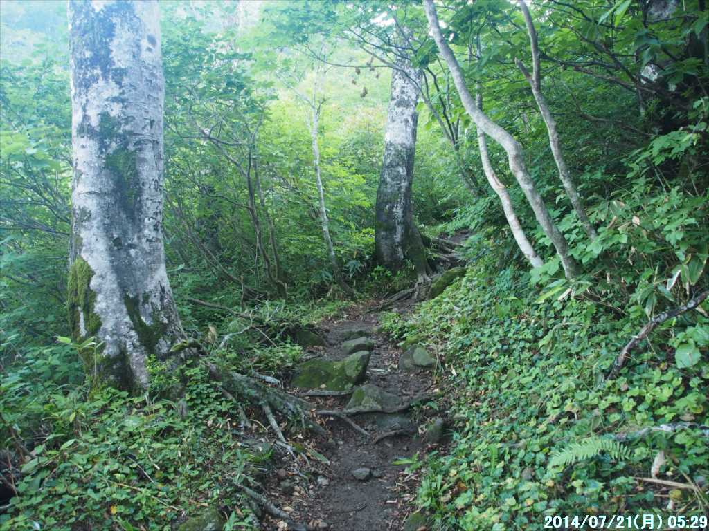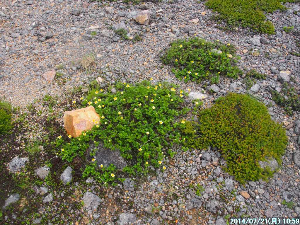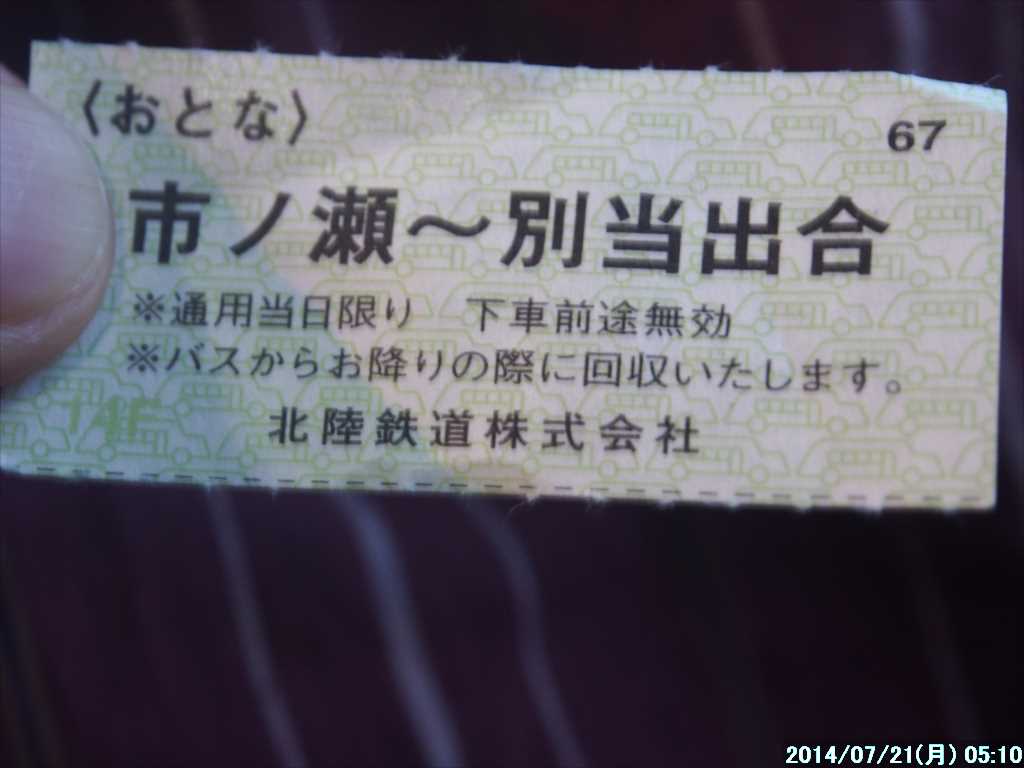| 3連休(7/19~21)に入ったが、まだ梅雨は明けず不安定な天候が続いている。 連休初日と2日目は晴れていても突然にわか雨が降ったりした。 しかし、天気予報では連休の最終日(7/21)は全般的に好天になる模様との事 九州南部では既に今週半ば(7/16)に梅雨明けしており、近畿地方も梅雨明けとなるか? (その当日(7/21)に梅雨明けした) と言う事で、今年第一発目の長期遠征に出かける事にした。 目的地は「白山」。 3年前(2011-9-24)に登った経験があるが、今回は別ルートから登る事とした。 前回は大白川から平瀬道で往復したが、今回は別当出合からの往復だ。総上昇量は平瀬道と変わらないが、距離が短く白瀬道より初心者向けとの情報だ。 ただし、別当出合からのルートはシーズン中は市ノ瀬からバスでのアプローチとなる 奈良からは当日の出発は不可能なので、いつも通り前日の夕方に出発して車中泊だ。 車中泊の場所は高速のPA・SAからは現地まで遠いので、道の駅を探したが、行程の途中には残念ながらなかった。余分に十数キロ走る事になるが、「道の駅 瀬女」を利用させてもらう事とした。 夕方の5時に自宅を出発。近所のスーパーで食料を仕入れ現地へと向かう。 京滋パイパスの巨椋ICから高速に入り、途中の多賀SAで夕食を取る。北陸道の高山北ICで高速を降り、カーナビの案内に従い車中泊予定地の道の駅に向かう。途中コンビニに寄りスーパーになかったサンドイッチとおにぎりを調達。 高速をゆっくりと走った事もあり、現地の「道の駅 瀬女」に到着したのは10時になった。 駐車場はがら空きで、暗くてハッキリしなかったが停まっている車は2~3台程度。 運転中眠かったこともあり早速睡眠に入る。車がまだ熱を持っていおり少し暑く寝にくかったが、知らぬ間に寝てしまった。途中2~3度目が覚めたが、その間ほぼ熟睡出来た。 3時に起床予定であったが、少し前に目が覚めたのでそのまま起床とした。自販機でカップコーヒーを買おうとしたが、なかったので温かい缶コーヒーを購入しサンドイッチとパンの朝食を取る。 トイレをすまし ( 有難い事にウォッシュレットが実装されていた ) 、現地に出発。 「道の駅 瀬女」から 30分強で現地の市ノ瀬に到着。4時10分なのでまだ真っ暗。 途中で追いついた前の車に続いて第3駐車場に入ると入り口から見える範囲は満車状態。そのまま進むと係員がおり駐車位置を案内してくれた。奥の方はまだ余裕があった。(下山して市ノ瀬の第3駐車場を出て道路を戻って行くと、路駐した車が大分下の方にまで停まっていた、朝早く来て正解だった。) 朝一番のバスに乗るべく並んでいると、次第に列はドンドンと長くなっていった。 夜が明けてくると雲ひとつない青空が満天の空に広がっていた。この天気がお昼過ぎまで続き前回に引き続き大展望が望める事を期待したい。 連休の前半は天候が悪く、今日の好天を期待し満を持した登山者が一斉に訪れたようで、この賑わいになったようだ、聞くとこれだけの人出はやはり珍しいとの事であった。 5時10分ほど前に大型バスが3台到着した。今年から100円値上げされ片道500円になったバス代を支払い1台目のバスに乗車。当方は早く並んでいたので座れたが、通勤バスと同じく立っている人まで乗せ満車状態で定刻の数分前に出発。 10分程度で、スタート地点の別当出合に到着。 さて、「砂防新道」か「観光新道」か どちらから登るかで最後の最後まで迷う。 バス待ちの時に仕入れた情報では観光新道は、最初に厳しい道が続くが、展望は良くて花は多いとの事。一般的な砂防新道から登り、下りに観光新道を歩こうかと心にほぼ決めかけたが、鳥居を潜り分岐点まで来ると改めて迷いに迷う。 前回白山に登った時はもっと厳しいと言われる平瀬道から登っており、今はピーカンの天気であるが、下山時までこの天気が持つか分からないので、急遽ルートを変更し展望の良い観光新道の左に足を向ける。このルートに向かった登山者は1/3から1/4位で圧倒的に少なかった。 尾根出合の「別当坂分岐」まで、急傾斜の道が続く。 ルートはシッカリしているが傾斜か急なので足を大きく上にあげて一歩づつ体を押し上げて行く。このところバテバテの山歩きが続いていたので、ザックからツェルトなどを抜いて重量を軽くしてきたが、それでも急角度の登りでは体を持ち上げるのが重い。 「別当坂分岐」まで数組に追い抜かれる。大汗をかき「別当坂分岐」で一息ついていると、後からオバちゃんが涼しい顔で上がってきた。当方の体力不足を思い知らされる。 「別当坂分岐」からは尾根登りに変わるが、そこからも暫くの間は急傾斜が続いた。我慢して登るとやがて傾斜は緩やかになり、稜線歩きに変わり展望を見る余裕が出てきた、観光新道と名付けられている如く展望が良い。 暫く展望の良い小さな起伏の稜線を歩き、再び登りに変わり少し上がると、窪地に残雪があった。そのすぐ上が殿ヶ池避難小屋であるが、現在は建替え工事
