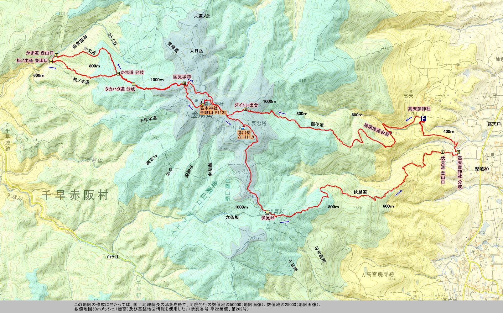 P → 《郵便道》 → ダイトレ出合 → 葛木神社(金剛山 最高点) → 国見城跡 → 《かま道》 → 黒栂林道 → 《松ノ木道》 → 国見城跡 → 湧出岳 → 伏見峠 → 《伏見道》 → P