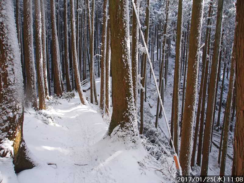 アイゼンが良く効き滑る事もなく、少し下ると林道に交差した。新しく林道が出来たようだ。その林道経由で下れるかと思うも、左右どちらが下りなのか判別がつかない。谷は下に向かっているので、林道を横断して下れそうな所から谷に入ると、山道に繋がった。そのままドンドン下ると、黒栂林道に着地。