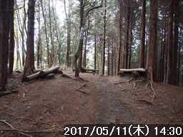 どちらに行こうか迷ったが、登りになる左を選択、少し登ると右からの山道の合流した。そのまま進むと、先ほど入った広い道のすぐ上で山頂への道に合流した。約 20分ほどの道草だったが、明確な踏み跡があり分岐(合流)もあるが、作業道だろうか?
