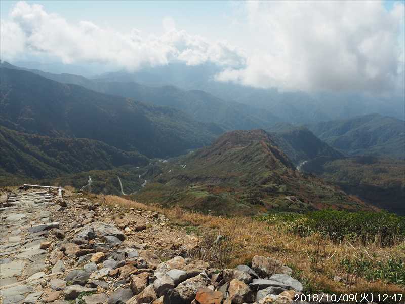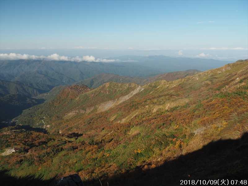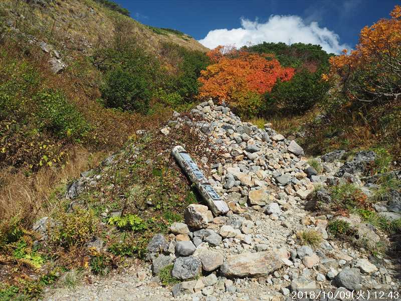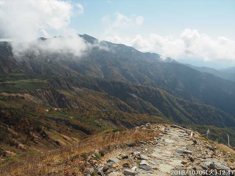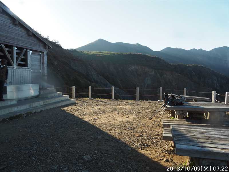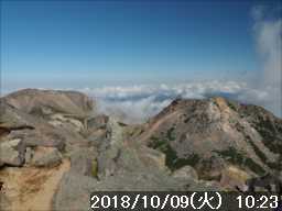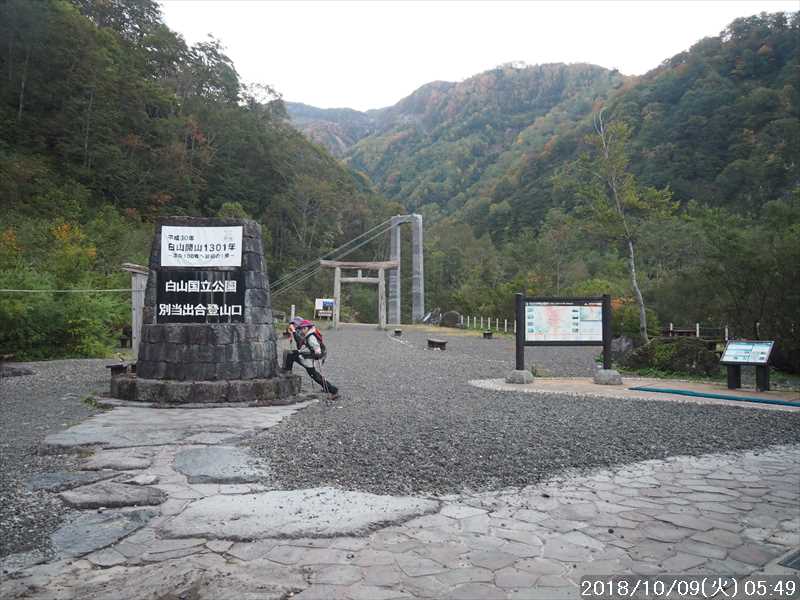 | 異常に暑かった夏も終わり、いつの間にか 10月に入ってしまった。 アルプスなどの高い山々はもう紅葉の季節に入ったと思われる。 天気の良い日を狙って、その紅葉見物だ。 3連休(10/6~8)の最終日の体育の日(月)が、一番天気が良い模様であるが 3連休の最終日で、山も道路も込みそう。連休明けの 9日(火)も天気は良さそうなのでその日に決行。 行先は奈良から比較的近い白山。 とは言っても、当日の日帰りはムリなので、いつも通りに車中泊しての登山だ。 つい 11日前に隣りの荒島岳に行ったばかりで、同じ道を走る。 自宅近くのショッピングモールで、パンを仕入れ、ガソリンを満タンにして奈良をスタート。 年金生活者なので高速代節約のため、地道で現地に向かう。 平日の夕方の為、京都を抜けるまで渋滞にあったが、湖西道路に入ると、その先は渋滞ゼロ。 遅れを取り戻し、福井手前で夕食を取り、車中泊予定地の 「道の駅 禅の里」には、ほぼ予定通り到着。 いままで、白山や別山に来る時には、車中泊地は 「道の駅 瀬女」を利用していたが、今回は道中に新しく出来た 「道の駅 禅の里」を利用することにした。一昨年(2016年3月)に開駅したばかりの新しい道の駅だ。国道横にある施設だが、静かで比較的すいていた。 到着後に、車内をベッドメーキングして睡眠に入る。今回、車中泊用に以前より大きめの板で空間をブリッジするように加工したので。快適度は増した。 時間が早い事もありなかなか寝付かれなかったが、そのうち睡眠。2時ころ目が覚めたが、暫く車中ベッドで頑張り、3時過ぎに起床した。 その道の駅には休憩施設もあったので、カップコーヒーを購入し、そこに備えられていたパンフレットなどを見ながら、ユックリと朝食。 小規模の施設のためか、トイレの個室は 2個しかない、しかもうち 1個は和式。とは言っても洋式にはウォシュレットが実装されているので有難い。 その洋式を利用させてもらい、現地に向かう。 道の駅から現地(別当出合)まで少し距離があるが(52㎞)、早朝なので 1時間強で到着。 現地の少し手前から道路上には路駐車がポチポチと。駐車場は満車かと一旦慌てたが、一般車通行止めの手前の県道横の駐車地は、歯抜けの状態で空いていたのでそこに駐車。 路駐車があったという事は駐車場が満車になった為と思われるが、マイカーは連休最終日の昨日の午前中まで市ノ瀬から通行規制中のはずだったので、何故か不思議だ。 到着時はまだ真っ暗だったので、社内で待機。 暫くして、空が白み始め何とか見えるようになってから支度をしてスタート。そんな人が駐車していた車から何組か出てきた。 駐車地から、別当出合まで県道を 500m強歩く。途中右下に駐車場が見えていた。当方が停めた県道横の駐車地から別当出合まで、その駐車場より高低差はないが、距離は長い。どちらが楽かな。 別当出合から、吊橋を渡る砂防新道に入る。 展望はないが歩きやすい道なので、黙々と登って行く。途中休憩処の中飯場はそのまま通過して、甚之助避難小屋で水分補給のみして、先に進む。 甚之助避難小屋より登る事 20分弱で、南龍分岐に到着。ココまで駐車場をスタートしてジャスト 2時間、マアマアのペースかな。 そこで砂防新道を別れ、右の南龍道に入る。 南龍道は、ほぼ平行道の歩きやすい道だったと記憶していたが、分岐からの暫くは崩壊場所を迂回するようなアップダウンで滑りやすく、少し危険を感じるような道だった。 前からそんなんだったかな。そこを超えると、あとは平穏な道に変わった。 途中の展望地では、以前に別山に向かう途中でそこを通過した時にガスっていて何も見えなかったのを思い出し、改めてそこからの景色を眺める。 今日はピーカンの天気。別山・チブリ尾根・甚之助避難小屋・下りで歩く予定の観光新道の尾根などの大展望が広がっていた。 南龍山荘のあるトンビ岩コース分岐で、そのトンビ岩コースに入る。始めて歩くコースだ。 道は明白であるが、岩の多い所を登って行くので歩きにくいコースだ。森林限界に入っており廻りは開けているので、前方の斜面を眺めながらひたすら頑張るだけ。 振り向くと、正面に別山・下方には南龍などの展望があるので、時々振り返りなから登って行く。 上方の台地らしき所に上がると、表示があり「トンビ岩」とあった。 横に、トンビに似ているかは別として、小ぶりではあるが台地に目立つ岩があった。トンビ岩コースのトンビ岩とは、その事と初めて知る。 裏側に回れる踏み跡があったので行ってみると、そこからは大展望が広がっていた。 その先、ダラダラと登って行くと室堂センターに到着。 トンビ岩コースは、少しハードなコースだったかな。小腹もすいてシンドかったのでセンターの前のベンチで、正面に白山(御前峰)を眺めながらサンドイッチを食べて休息。 息を整えて、御前峰への登りに掛かる。正面から登るのは、今回で 3回目。前回・前々回とも、御前峰への登