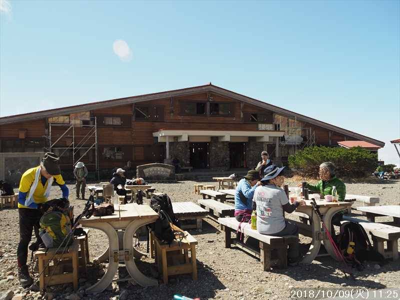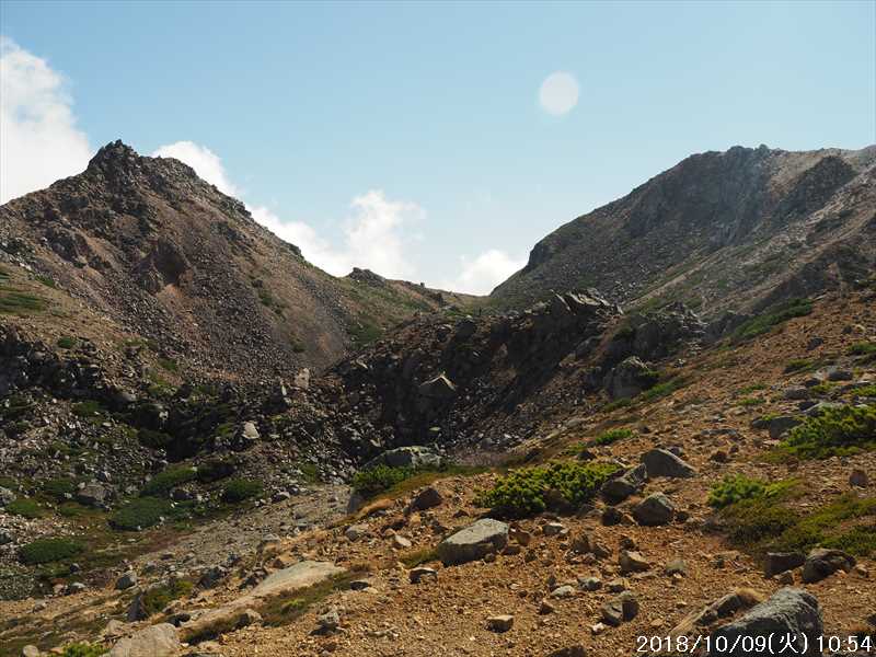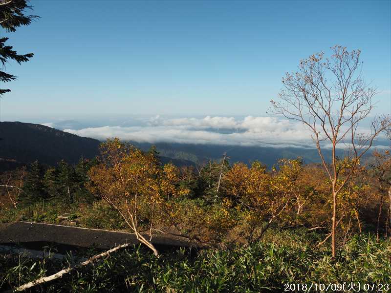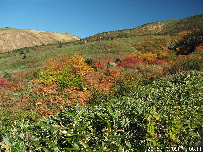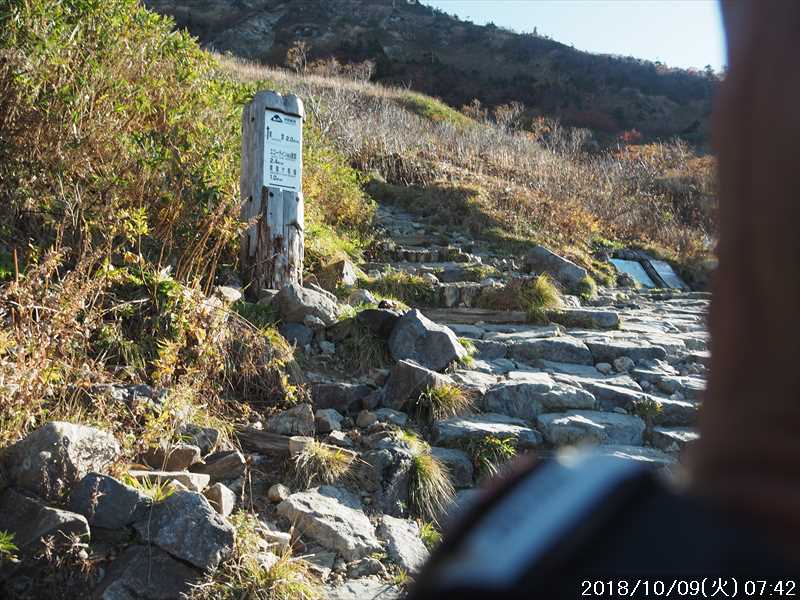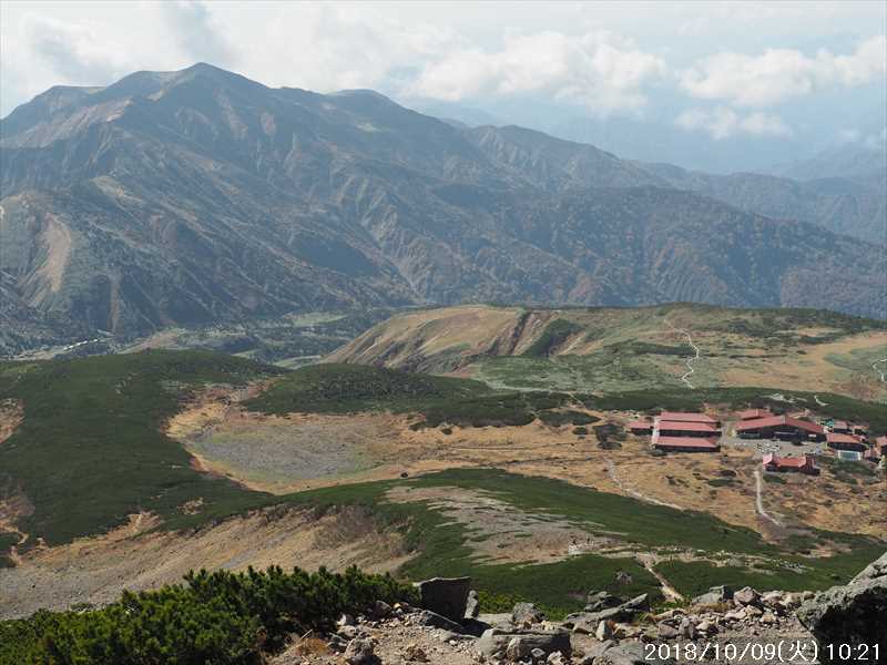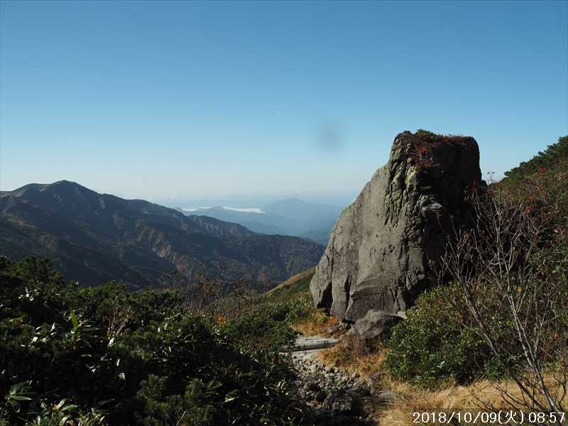 | 異常に暑かった夏も終わり、いつの間にか 10月に入ってしまった。 アルプスなどの高い山々はもう紅葉の季節に入ったと思われる。 天気の良い日を狙って、その紅葉見物だ。 3連休(10/6~8)の最終日の体育の日(月)が、一番天気が良い模様であるが 3連休の最終日で、山も道路も込みそう。連休明けの 9日(火)も天気は良さそうなのでその日に決行。 行先は奈良から比較的近い白山。 とは言っても、当日の日帰りはムリなので、いつも通りに車中泊しての登山だ。 つい 11日前に隣りの荒島岳に行ったばかりで、同じ道を走る。 自宅近くのショッピングモールで、パンを仕入れ、ガソリンを満タンにして奈良をスタート。 年金生活者なので高速代節約のため、地道で現地に向かう。 平日の夕方の為、京都を抜けるまで渋滞にあったが、湖西道路に入ると、その先は渋滞ゼロ。 遅れを取り戻し、福井手前で夕食を取り、車中泊予定地の 「道の駅 禅の里」には、ほぼ予定通り到着。 いままで、白山や別山に来る時には、車中泊地は 「道の駅 瀬女」を利用していたが、今回は道中に新しく出来た 「道の駅 禅の里」を利用することにした。一昨年(2016年3月)に開駅したばかりの新しい道の駅だ。国道横にある施設だが、静かで比較的すいていた。 到着後に、車内をベッドメーキングして睡眠に入る。今回、車中泊用に以前より大きめの板で空間をブリッジするように加工したので。快適度は増した。 時間が早い事もありなかなか寝付かれなかったが、そのうち睡眠。2時ころ目が覚めたが、暫く車中ベッドで頑張り、3時過ぎに起床した。 その道の駅には休憩施設もあったので、カップコーヒーを購入し、そこに備えられていたパンフレットなどを見ながら、ユックリと朝食。 小規模の施設のためか、トイレの個室は 2個しかない、しかもうち 1個は和式。とは言っても洋式にはウォシュレットが実装されているので有難い。 その洋式を利用させてもらい、現地に向かう。 道の駅から現地(別当出合)まで少し距離があるが(52㎞)、早朝なので 1時間強で到着。 現地の少し手前から道路上には路駐車がポチポチと。駐車場は満車かと一旦慌てたが、一般車通行止めの手前の県道横の駐車地は、歯抜けの状態で空いていたのでそこに駐車。 路駐車があったという事は駐車場が満車になった為と思われるが、マイカーは連休最終日の昨日の午前中まで市ノ瀬から通行規制中のはずだったので、何故か不思議だ。 到着時はまだ真っ暗だったので、社内で待機。 暫くして、空が白み始め何とか見えるようになってから支度をしてスタート。そんな人が駐車していた車から何組か出てきた。 駐車地から、別当出合まで県道を 500m強歩く。途中右下に駐車場が見えていた。当方が停めた県道横の駐車地から別当出合まで、その駐車場より高低差はないが、距離は長い。どちらが楽かな。 別当出合から、吊橋を渡る砂防新道に入る。 展望はないが歩きやすい道なので、黙々と登って行く。途中休憩処の中飯場はそのまま通過して、甚之助避難小屋で水分補給のみして、先に進む。 甚之助避難小屋より登る事 20分弱で、南龍分岐に到着。ココまで駐車場をスタートしてジャスト 2時間、マアマアのペースかな。 そこで砂防新道を別れ、右の南龍道に入る。 南龍道は、ほぼ平行道の歩きやすい道だったと記憶していたが、分岐からの暫くは崩壊場所を迂回するようなアップダウンで滑りやすく、少し危険を感じるような道だった。 前からそんなんだったかな。そこを超えると、あとは平穏な道に変わった。 途中の展望地では、以前に別山に向かう途中でそこを通過した時にガスっていて何も見えなかったのを思い出し、改めてそこからの景色を眺める。 今日はピーカンの天気。別山・チブリ尾根・甚之助避難小屋・下りで歩く予定の観光新道の尾根などの大展望が広がっていた。 南龍山荘のあるトンビ岩コース分岐で、そのトンビ岩コースに入る。始めて歩くコースだ。 道は明白であるが、岩の多い所を登って行くので歩きにくいコースだ。森林限界に入っており廻りは開けているので、前方の斜面を眺めながらひたすら頑張るだけ。 振り向くと、正面に別山・下方には南龍などの展望があるので、時々振り返りなから登って行く。 上方の台地らしき所に上がると、表示があり「トンビ岩」とあった。 横に、トンビに似ているかは別として、小ぶりではあるが台地に目立つ岩があった。トンビ岩コースのトンビ岩とは、その事と初めて知る。 裏側に回れる踏み跡があったので行ってみると、そこからは大展望が広がっていた。 その先、ダラダラと登って行くと室堂センターに到着。 トンビ岩コースは、少しハードなコースだったかな。小腹もすいてシンドかったのでセンターの前のベンチで、正面に白山(御前峰)を眺めながらサンドイッチを食べて休息。 息を整えて、御前峰への登りに掛かる。正面から登るのは、今回で 3回目。前回・前々回とも、御前峰への登