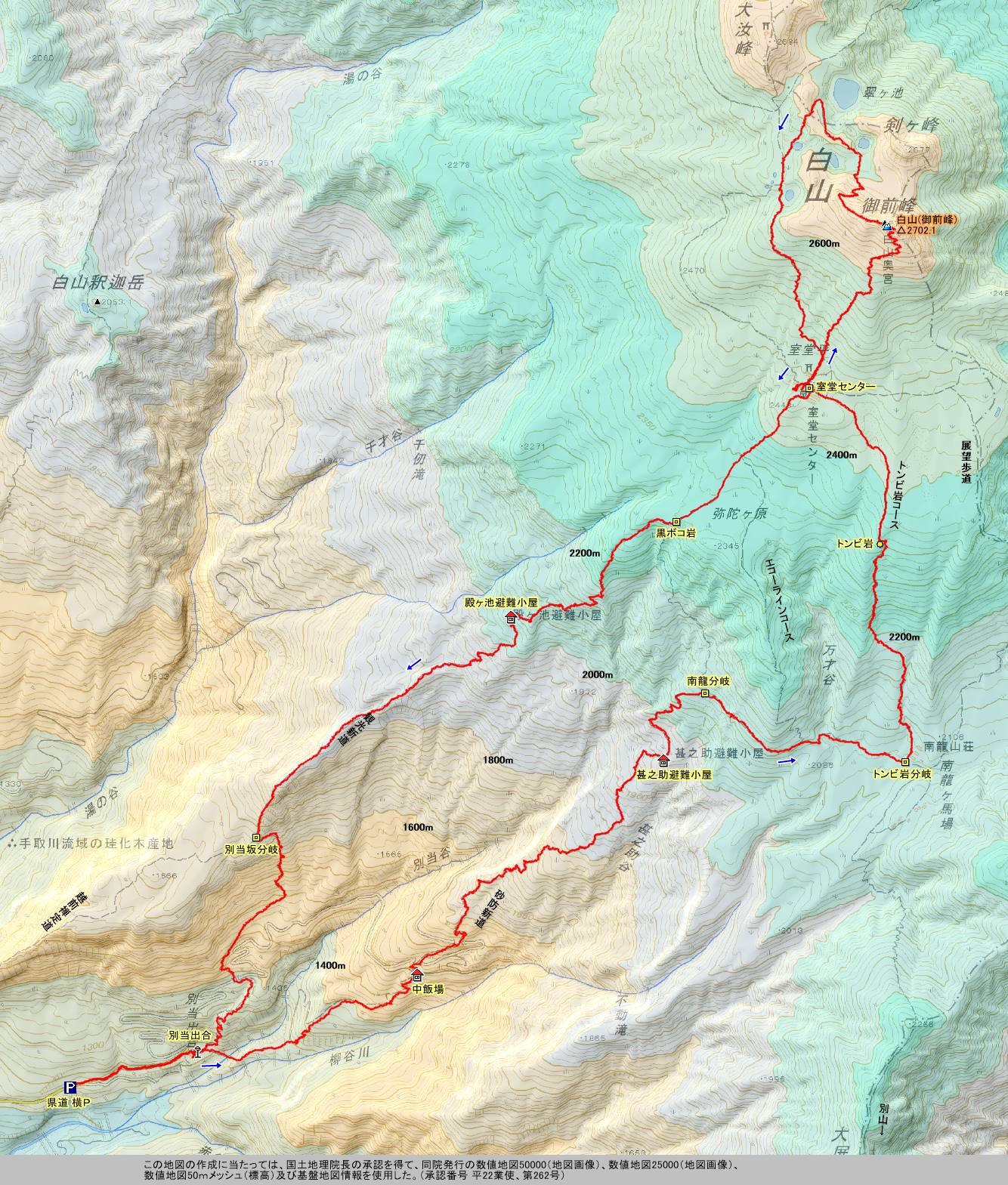 | P → 別当出合 → 《砂防新道》 → 南龍分岐 → 《南龍道》 → 南龍山荘 → 《トンビ岩コース》 → 室堂 → 白山(御前峰) → 《お池めぐり》 → 室堂 → 黒ボコ岩 → 《観光新道》 → 別当出合 → P | |