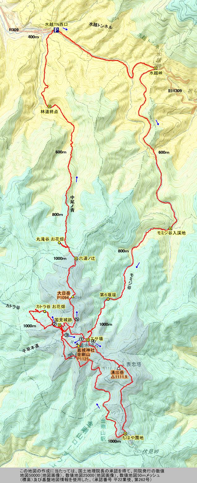 P → 水越峠 → モミジ谷入渓地 → 《モミジ谷》 → エサ場 → 葛城神社(金剛山) → カトラ谷お花畑 → クリンソウ群生地 → 国見城跡 → 湧出岳 → ちはや園地 → 《金剛山遊歩道》 → 国見城跡 → 大日岳 → 六道ノ辻 → 丸滝谷お花畑 → 《中尾ノ背》 → P