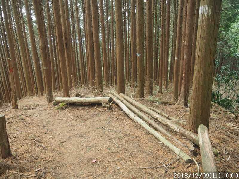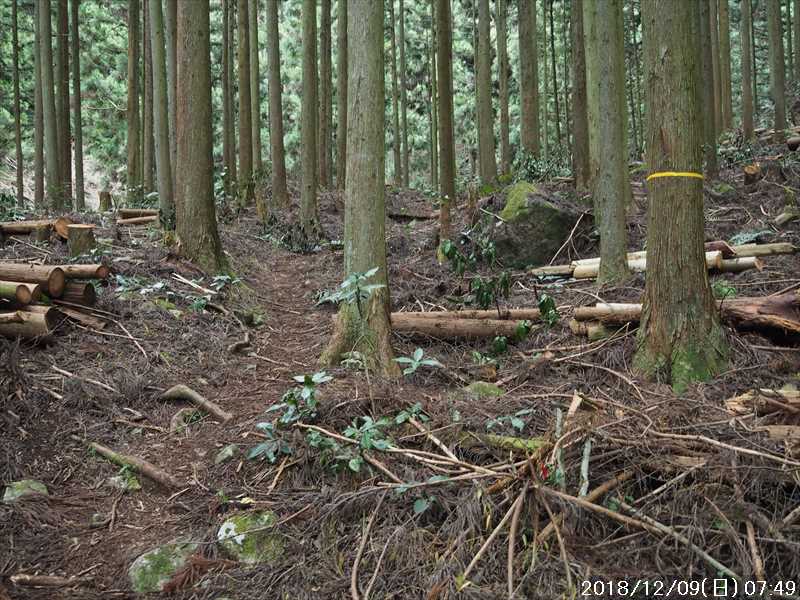 しばらく下って、尾根を左に折れる松ノ木道から、尾根をそのまま下って行く薄い踏み跡の「かま道」に入る。かま道は推奨されていないルートだろうか、分岐には丸太があり、いかにも通行止めのようになっていた。
