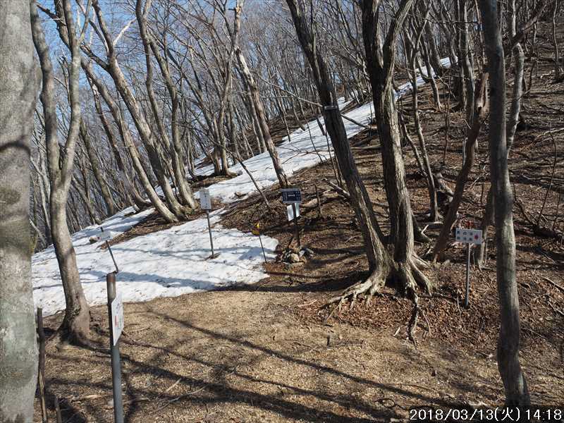 トラバース道に残雪が無くなった所でアイゼンを外し、木和田尾の頭陀ヶ平・白瀬峠の分岐に到着。