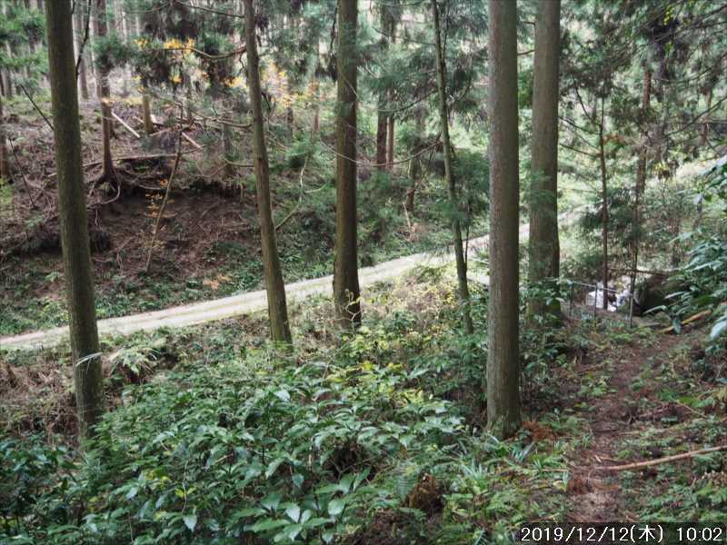 折り返す様に分岐に折れるとそこからは激下り。落ち葉と粘土質の土で滑りやすい激坂を慎重に下って行く。100mほど高度を下げ鞍部手前で水音が聞こえ、右下を見ると林道が平行していた。鞍部まで下り、すぐ下に見える林道への右の道に折れる。