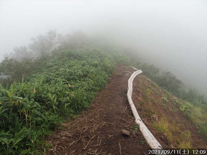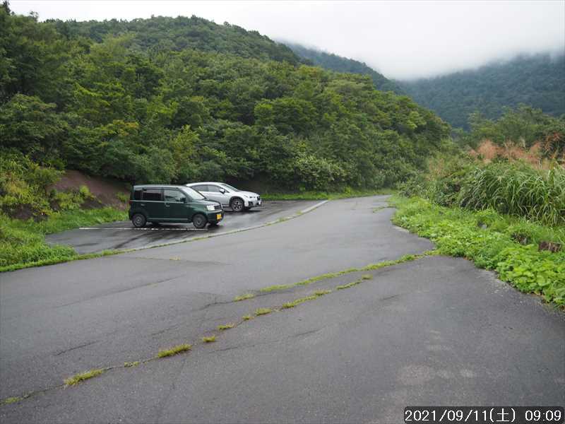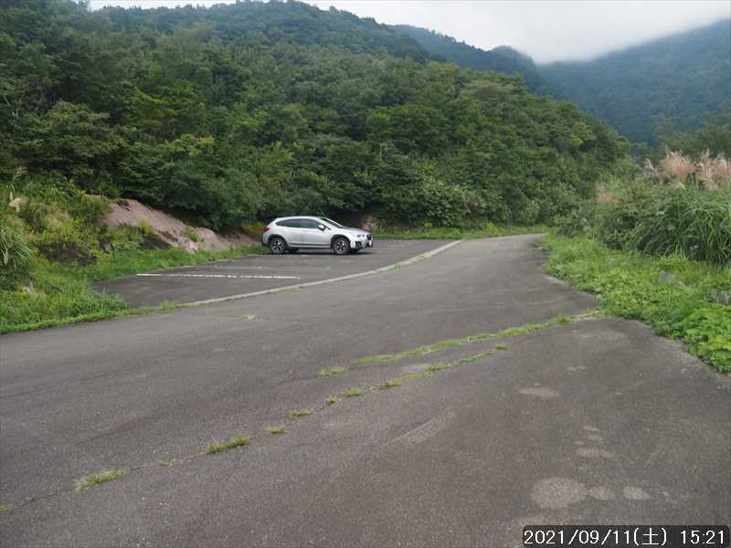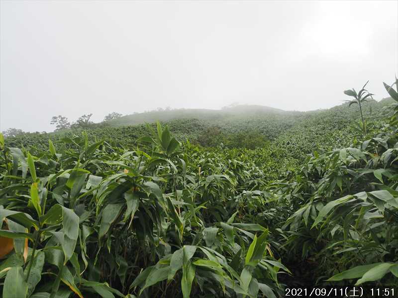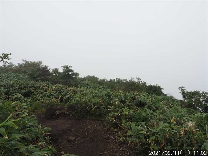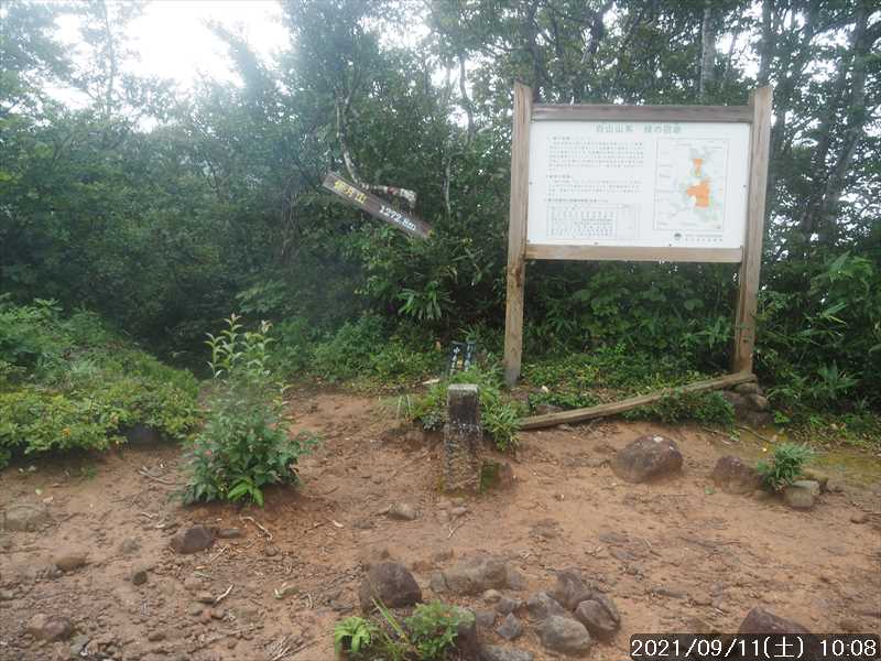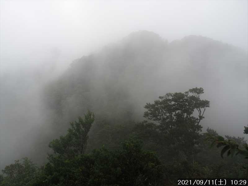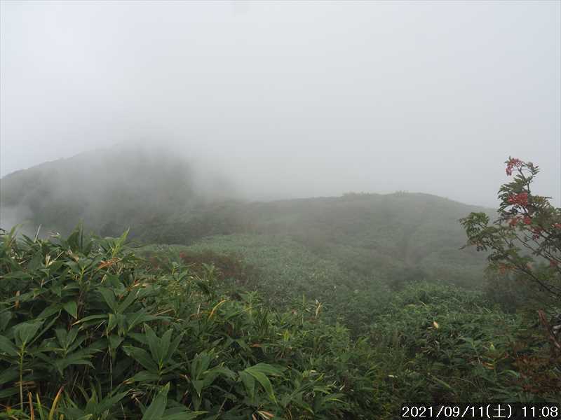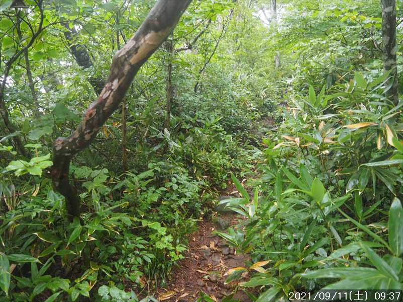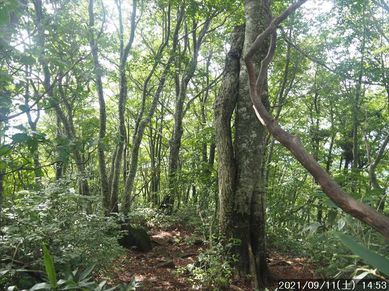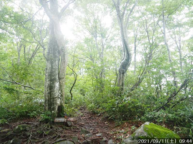 遠征 2日目、自宅を出てからは 3日目 ⇒ 1日目の記録 「白山」 は こちら 4時起きを予定していたが、早く目が覚めたので車内ベットで暫くウダウダしていて 3:55に起床。 車内で朝食を取っていたら、フロントガラスにポツリポツリと雨が落ちてきた。 5時前には、洗面・トイレもすまし現地に向かっての準備を終えたが、雨は降り続いたまま。雨雲レーダーで確認すると、数時間ほどで雨雲は通過して行く。 このまま雨が続くようなら、山はあきらめて帰宅してしまうのだが、ビミョー。 しばらく様子見で、そのまま道の駅で待機する。 かなり長い時間ボーッとしていて、再び雨雲レーダーを確認すると、9時ころには雨雲は通過していく。 狭い車内でこれ以上ボーッとして時間を潰すのはシンドイので、とりあえず現地まで行ってみる事にする。 ナビに従って行くと、県道を別れて細い道に折れるのを指示された。事前調べでは、入口に林道の表示があったが見当たらない。普通ならナビに指示に従ってそのまま行ってしまうところだが、細い道で行き詰まったら引返すのが大変。 スマホのグーグルマップで確認すると、ナビで案内された道は途中で途切れている。目的の法恩寺林道はもう少し先に入口がある。 その法恩寺林道は県道入口に林道の案内があるのをレポを見ていたので、そのまま県道を先に進む。 案内が見つからないままかなり先まで行って、おかしいと思い、再びスマホを確認すると、とうの昔に行き過ぎていた。 今度は位置を確認しておいて引返す。その位置に到着すると、林道入口に表示があった。反対側からは見えない位置にあったので、表示を頼りに走ってきたので通り過ぎてしまった。 その法恩寺林道に折れると、後は一本道。全線舗装道で、道も細くはないが両端から草が伸びて来ている場所もあるので狭く感じる部分もある。所々に落石もあるが、降りて排除するような落石はなかった。 道路を横断している側溝のグレーチング蓋の部分に段差があるので、スピードを緩めては通過していく。 暫く登りつめた先に、軽が 1台停まっている駐車場があった、銚子ヶ口展望駐車場だ。その向こうの道路横には展望台が見えていた、グーグルマップに経ヶ岳登山口展望台とある所だ。銚子ヶ口展望・経ヶ岳登山口展望、正式名称はどちらだろうか。 その駐車場に停める。先着の車の中には単独さんがいて、雨が止むのを待機しといる模様だ。 到着時には、雨は小雨になっていたものの止んではいない。当方も車内でそのまま待機する。 ほぼ雨が上がりかけたころ、待機していた軽の単独さんがスタートしていった。 当方は、完全に雨が上がってからスタートの準備を始める。到着してからほぼ 1時間待機していた。 今日のルートは、当初経ヶ岳から法恩寺山へ周回する予定であったが、スタートが 3時間遅れたので、周回はあきらめ、経ヶ岳へのピストンに変更だ。 雨上がりなのでスパッツを着用してスタート。 駐車場の斜め前の展望台で、展望を望むもガスっていて下界に大野の市街地が少し見える程度。 その先の林道を少し下った所に登山口があった。入口には「アダムとイブまで862m」・「保月頂上まで1420m」の案内が少し目立っていたが、経ヶ岳の案内は右の木に隠れて分かりにくかった。 入り口部分の段差を上がり暫くの間緩い傾斜の所を進み、尾根に上がる所から本格的な登りにかかる。 雨上がりなのでスパッツを着けて来たが、ササなどの下草は結構腰高なのですぐにズボンはビショ濡れになってしまった。 歩き始めは、昨日の疲れは余り残っていないかな と感じていたが、本格的な登りにかかるとたちまち息切れがして、足も重たい。 そんなんでシンドクなってきたころ、「アダムとイブ」の木に到着。さぞ立派な木かと想像していたが、何の変哲もない木。普通のブナの木に小ぶりのナラの木(?)が絡んでいるだけ。ルートの通路上にあるので、言われてみれば目立つかな、という程度。多分、誰かが勝手に命名して、ネットのレポ等で取り上げられるのを見て、一人ほくそ笑んでいるのでは、と想像する。 最初のピークの保月山までスタート地点から高度差 380m、コースタイム 60分なので、普段なら通過地点程度であるが、今日はシンドかった。途中、最低限 保月山までは と頑張ってきたくらいだ。 チョコレート菓子でエネルギー補給して大休憩を取り、とりあえず行ける所まで頑張ってみる事にして先に進む。 保月山から下り始めると、ガスのベールの向こうに大きな山塊が立ちはだかっているのが見えた。保月山と釈氏ヶ岳の間にある地形図のヤヤコシイ部分だ。釈氏ヶ岳はその山塊を超えたまだ先だ。 木製階段をいくつか登って、先ほど見えた山塊の上に上がると今度はヤセ尾根上の岩稜を通過していく。さざれ石状の岩稜なので滑る事はないので危険は感じないが、足を引っかけて転倒しない様にして無事通過。 そのまま緊張した勢いで釈氏ヶ岳への登りを頑張り、山頂