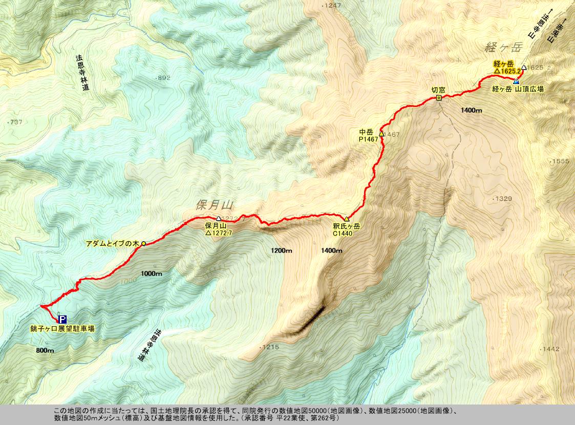| P ⇔ 経ヶ岳 林道登山口 ⇔ 保月山 ⇔ 釈氏ヶ岳(杓子岳) ⇔ 中岳 ⇔ 切窓 ⇔ 経ヶ岳 【往復】 |