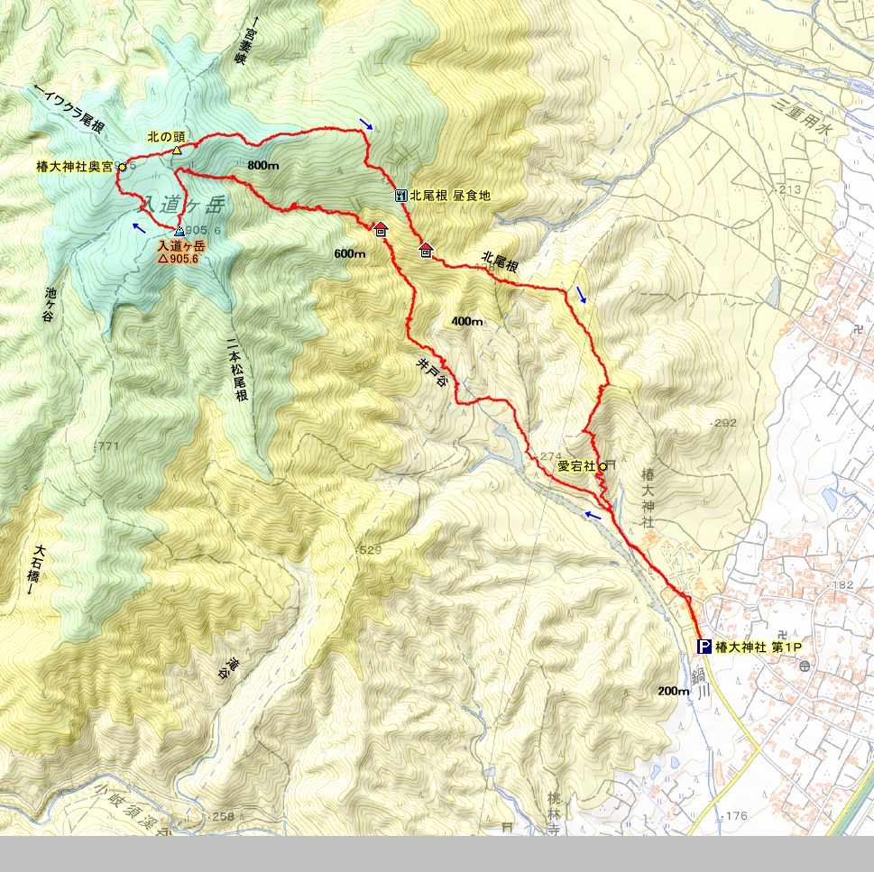 | P → 《井戸谷コース》 → 入道ヶ岳 → 椿大神社奥宮 → 北の頭 → 《北尾根》 → P | |