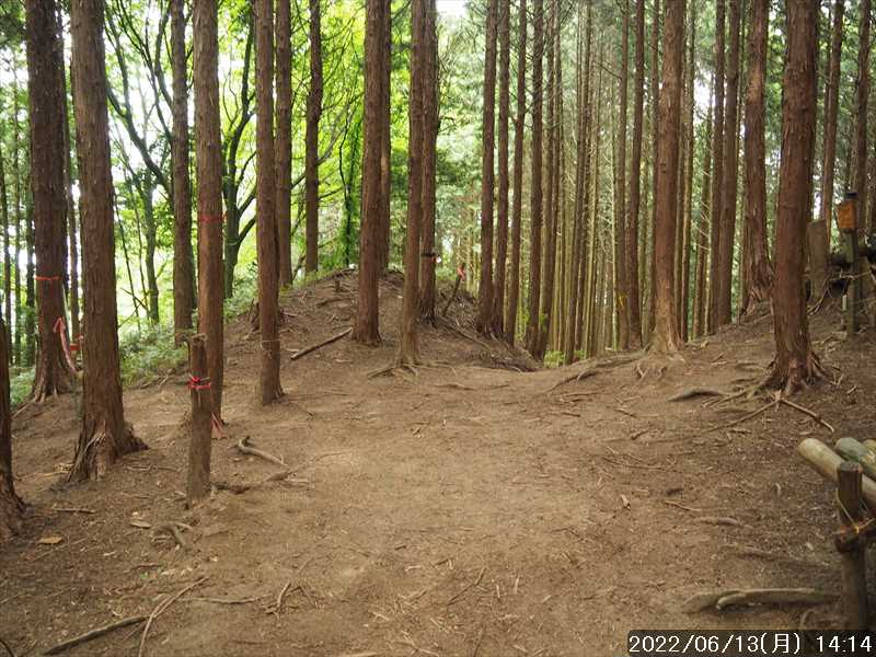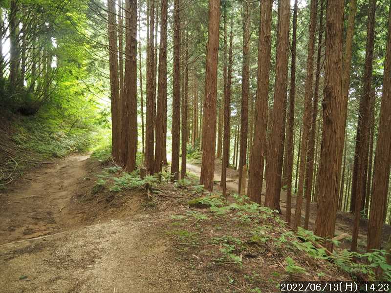 | 関東・甲信越が先に梅雨入り(6/6)していたが、近畿地方も明日(6/14)から梅雨入りの模様。 梅雨に入り後は暫く愚図ついた天気になりそうなので、曇がちな天気ではあるが雨の心配のない今日出かけることにした。 行先はホームグラウンドの金剛山。今年初めてだ。 ルートはまだ歩いたことのない狼谷の西側の谷から大日岳の北側に上がるルートだ。 狼谷の本ルートは 6年前(2016/9/10)に歩いたことがある。その頃は本ルートも踏み跡は薄く、途中で分かれる西側のルート分岐などなかった。しかし最近はよく歩かれているらしい。 通勤渋滞に会わないように少しは早めに自宅を出る。奈良市内は順調に抜けたものの京奈和道を一旦降りた橿原付近でプチ渋滞にあったので現地には少し時間がかかって到着。 水越トンネルを抜けて旧道に折り返すと、それなりに路駐している車があったので、水越川駐車場に停められるか気になったが、駐車場は半分も埋まっていない状態だった。 スタート時の外気温は 13℃。天気がイマイチの事もあり少し肌寒いくらい。山歩きには丁度良いか。 バスの駐車場まで上がると、以前はその先から通行止めになっていたが、いつの間にか解除されていた。 水越峠手前の金剛山登山口のガンドガコバ林道入口まで来ると、路駐している車があった。今日は下りも水越峠に下ってくる予定なので、通行止が解除されたことを知っていれば、その付近に路駐すれば楽だったかも。 林道入口から 林道を黙々と 32分歩き、ダイトレ分岐のあるカヤンボの少し先にある「モミジ谷」への入口に到着。林道は右に大きく折り返しながら登っていくが、モミジ谷へは直進。林道は草ぼうぼうで中央に踏み跡がある程度なのに比べて、モミジ谷への入渓路は踏み跡が濃かった。 以前は分岐から直ぐの所で横の沢に下りていたが、現在の踏み跡は分岐から直進してそのまま沢を右岸側に渡渉して遡って行く。踏み跡は濃く国道並だ。 第1・第2・第3堰堤と続けて左(右岸)側から超えて、第3堰堤の上に上がった所で左岸側に戻り、そのまま暫く遡っていくと、分岐点にぶつかった。 狼谷への分岐点だ。6年前に来たときは左側に直進するモミジ谷への踏み跡しかなかったが、右に折れていく狼谷への踏み跡も出来ていて、しかも濃い踏み跡だった。下手をすると本流のモミジ谷と間違えるくらいだ。しかもその分岐から右手の狼谷方面を見ると数メートル先に大きなケルンが見えていて、そのケルンの左右にも道が分かれているのでなおさらだ。 その濃くなった狼谷に折れる。モミジ谷が国道なら狼谷は県道並みだ、踏み跡のあるルートに変遷していた。その踏み跡を追って余り傾斜のない沢沿いの道を遡って行く。谷に多くの倒木が落ちてきているが、歩くルートは確保されており、大きく屈んだり苦労して超えていく場面もなく、ほぼ普通に通過できる。 やがて流れている水が途絶えて涸れ沢になり、少し傾斜のある場所ではロープ場も出て来たが、足元はシッカリしていて滑らないのでロープは下りでも不要なくらい。 モミジ谷を別れてから 20分強で、今回の目的の狼谷西ルートの分岐に到着。6年前はそんな分岐に気づいていなかったので見落とさないように注意していたが、踏み跡の分かれたた明確な分岐が出来ていた。手作りの案内表示があり右側の先にはロープも見えていた。見ようによっては右側が本ルートに見えるくらいだ。 その右に折れる。そこからは始めて歩くルート。 狭い谷で、えぐれた細いガレ場を登って行く。傾斜はそれほどキツイ程でもない。ガレは安定していないので登りでは問題ないが下りでは足首を傷めないように要注意だ。 太尾の尾根近くまで上がると広い場所になり、踏み跡を辿って大日岳の北側で太尾に合流。モミジ谷の分岐から 40分ジャストだった。 太尾に合流した尾根も広い所なので、下山に使う場合は分岐が分かりにくい所だ。大日岳から急坂を下り傾斜が緩むと踏み跡が別れるので右(東)側を歩いていないと気付きにくい。 その合流地点から数分で大日岳に上がり、反対側に少し下ると左(東)側に狼谷・狼尾への分岐がある。踏み跡の濃い分岐であるが土手越えになっており以前あった分岐表示やテープがないので、そこも案外に気づきにくい。 大日岳から下った鞍部の青崩道分岐の四辻で、左側から金剛山に向かう。正面からのほうが金剛山には近いが、金剛山最高点の葛木神社に先に行きたいので神社裏手の巻道に繋がる左から登って行く。 一段上がった四辻で、そのまま神社裏手の巻道に向かう正面の道に入る。その四つ辻は左に下るとモミジ谷、右に折れるとすぐ先で先ほどの青崩道分岐からの道と合流し山頂売店へと繋がる道だ。 山腹の並行道を少し進むと、モミジ谷の尾根道にぶつかり、山側に折れると、今度は神社裏側の巻道にぶつかり、左側へ進むと神社の裏参道の入口付近に出た。 裏参道から葛木神社に上がり、いつも通り山歩きの無事を祈願。 まだ時間