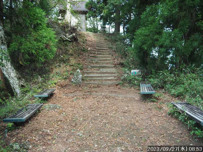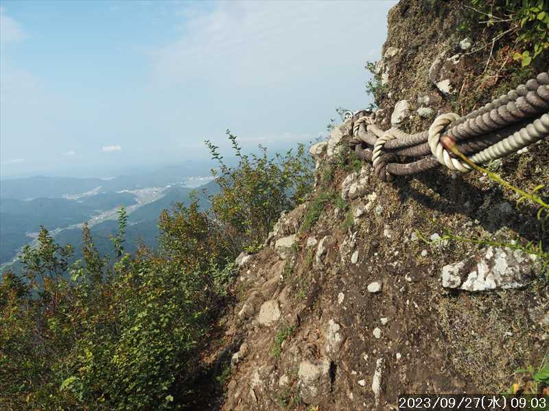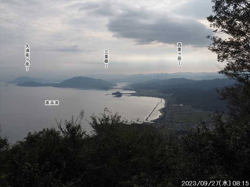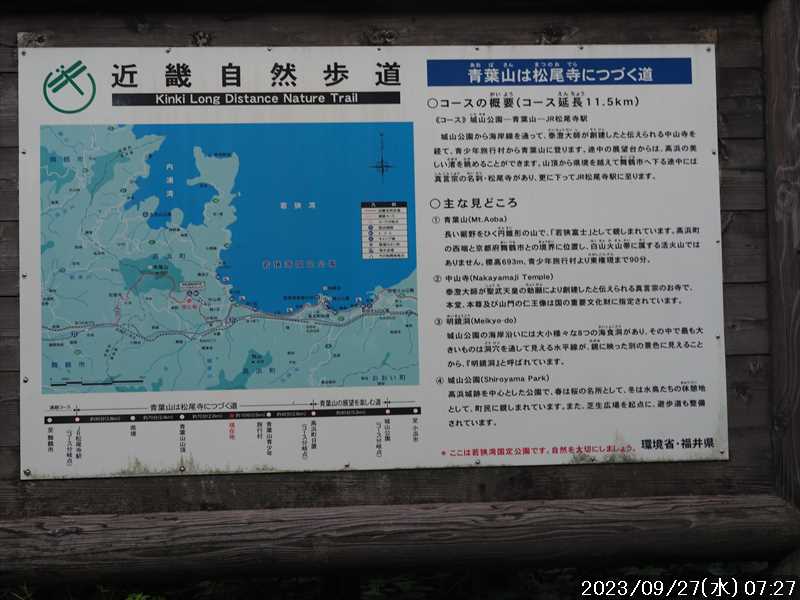 | 遠征 2日目、自宅を出てからは 3日目 ⇒ 1日目の記録 「白山」 は こちら 車中泊した「道の駅:若狭 美浜はまびより」で目が覚めたら 4時40分、チョウドよい時間だったので起床。夜中にトイレに起きてから目覚めることなくよく眠れた感じ。 昨日寝るときは少し暑く感じたが、車が熱を持っていた感じで時間がたつとそれほど暑くは感じなくなった。 それでもシュラフに入らずお腹に掛けておいただけで十分だった。厚手の毛布も持ってきていたが全く不要だった。起きた時の外気温も昨夜と変わらない 25℃だった。 昨日スーパーで購入したパン・オニギリで朝食を取り、今年 6月に開駅したばかりの道の駅なのでメチャキレイなトイレで事をすまし、遠征も今日までなので車内ベットを片付け、現地に向かう。空はすっかり明るくなっていた。 国道を走っていると、次第に車の数が増えてきて、多くの信号に引っかかった。国道から県道21に折れる所では、高浜原発に向かうバスや車でプチ渋滞。 登山口横の駐車場には 07:10に到着。軽トラが 1台停まっていたが時間調整していたみたいで準備中に出て行った。 登山口に移動し案内板を読んでいたら、車の音がして駐車場に入った。後着者が来た模様。 入山して暫くは緩い登り。そんな場面でも丸太止めで階段としており、登山道は整備されている感じ。 少し上がった所から斜面を大きく折り返しながらジグザグに登って行く。するとチリンチリンと鈴の音、折り返しの上方から下方に単独さんが追ってきているのが見えた。 ベンチが短いスパンで適当な所に設置してあり 3つ目のベンチ場で一服。 特に休憩は必要なかったが後ろのチリンチリンが気になるので、先に行ってもらう為だ。ついでに昨日スーパーで購入したオニギリを腹に入れる。昨日スーパーで間違ってオニギリを余分に買い、賞味時間が過ぎていたので早く食べたかったこともある。車ではアイスボックスに氷と一緒に入れていたので、少々の賞味時間タイムオーバーは問題ない と思う。 通過して行った壮年の単独さんに少し遅れて再び歩き出し、少し登った所で突然展望台が出てきた。事前知識がなく知っていれば、先ほどのベンチでなくその展望台で一服した方が良かったのだが。 展望台に上ると高浜湾方面が一望、海岸沿いの高浜市の市街地も眼下に見えていたが、空には厚い雲がかかっていたので景色の見栄えはイマイチ。 湾の先、音海の方にある高浜原発は山の陰になっていたが、発電した電気を送り出す鉄塔が山陰から半分出ていた。 展望台から先に進み、金毘羅大権現のベンチ場を過ぎると次は馬の背。10mほどの細い岩稜だったが、特に危険は感じなかった、とは言っても落っこちたら多分お陀仏。岩場の上からは南方面に展望があった。 スタートして 1:22’で青葉山の東峰に到着。 青葉山は双耳の山で東峰の方が西峰より 1mだけ高い。地理院の地図には東峰の場所に青葉山の文字があり、青葉神社も東峰にある。本峰は東峰のようだ。 しかし山頂部分には小さな青葉神社があるだけで山頂部分は狭く展望もない。一段下がった所に広場があるのみ。 見るべきものはなく、休憩するほどでもなかったのでそのまま通過。 反対側から下りかけると、短い鉄階段・長い鉄階段が出てきて、その次に岩壁をロープで横這い移動の場面。安全は確保されているがややこしい場面だ。 その先、稜線上のややこしい岩場を過ぎ、もう一つ長い鉄階段を下り、東峰・西峰の鞍部から登りかけると、ルートの先に大岩。行き止まりかと思ったが、横の下から大岩を潜っていた。多分そこが「大師洞」。 下ってきた東峰の西斜面は距離は短いもののややこしく厳しい下りだったが、反対側の西峰への登りは平穏で一頑張りで西峰に到着。 青葉山(西峰)には神社と避難小屋があり、本峰の東峰の神社(青葉神社)より西峰の神社(西権現)の方が立派な感じがした。 その神社の裏側に岩場のピークがあり山名表示が見えた。登れるようなので、神社の裏手に回ると岩場にステップ・手摺があり安全に上がれた。 ピークからは北と南に展望があったが、天気がハッキリしていないので見栄えはイマイチだった。 狭いピークだったが誰もいないので、パンで小腹ごしらえ。 一段下の神社前に戻り、登ってきた反対側に下る。 少し下った所に「←今寺林道口」・「松尾寺口→」の分岐表示。正面の松尾寺口方面に向かう。その分岐から直ぐの所に広場があり、灯籠の上に大きな自然石を乗せたのが下と上に 2ツあったが、登山口の案内表示には表示はなかった。 その広場から急坂を下っていく。シッカリと踏まれたルートでジグザグに下っている。傾斜のキツイ所は鉄階段・ロープが設置してある。 登ってきた中山からのルートと違い、途中に休憩場所もなく、ひたすら下って行く。 やがて傾斜が緩みフラットな場所に出ると、崩落した石の鳥居があり、その少し先で緩い下りに変わり、やがて舗装道路に着地。道標があり、