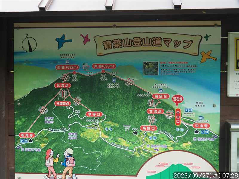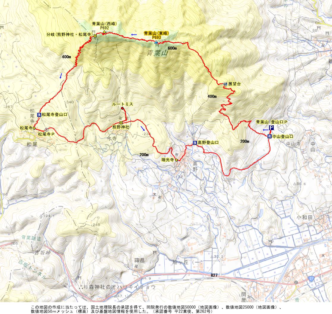 | P → 中山登山口 → 青葉山(東峰) → 青葉山(西峰) → 松尾寺 → 熊野神社 → 高野登山口 → 中山登山口 → P |