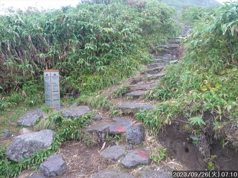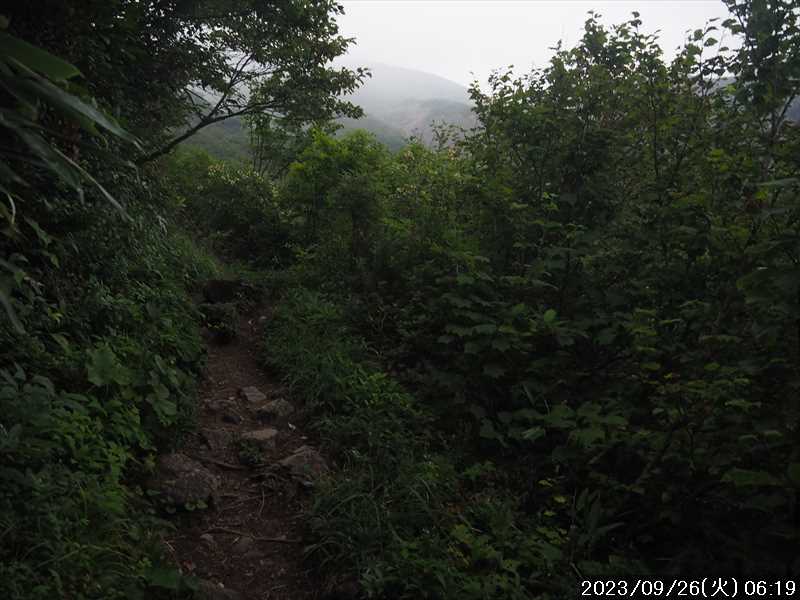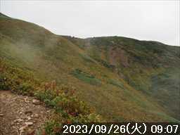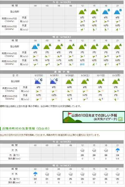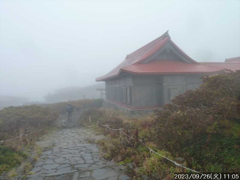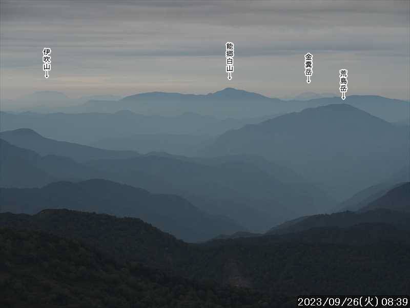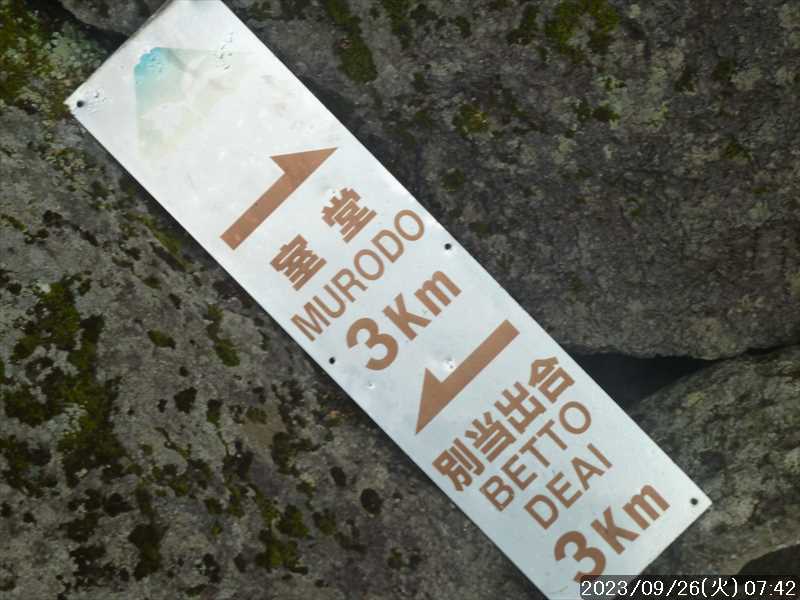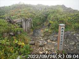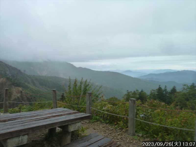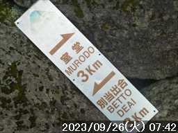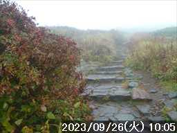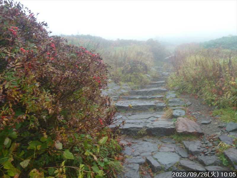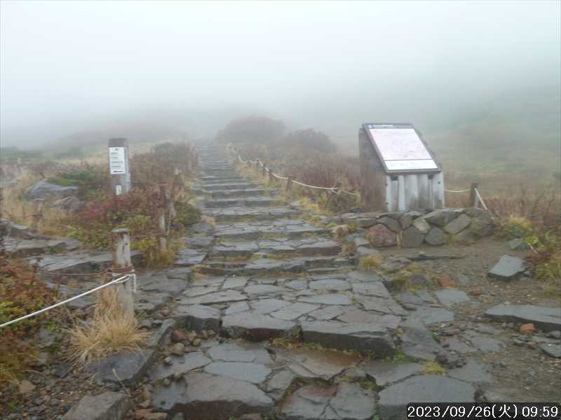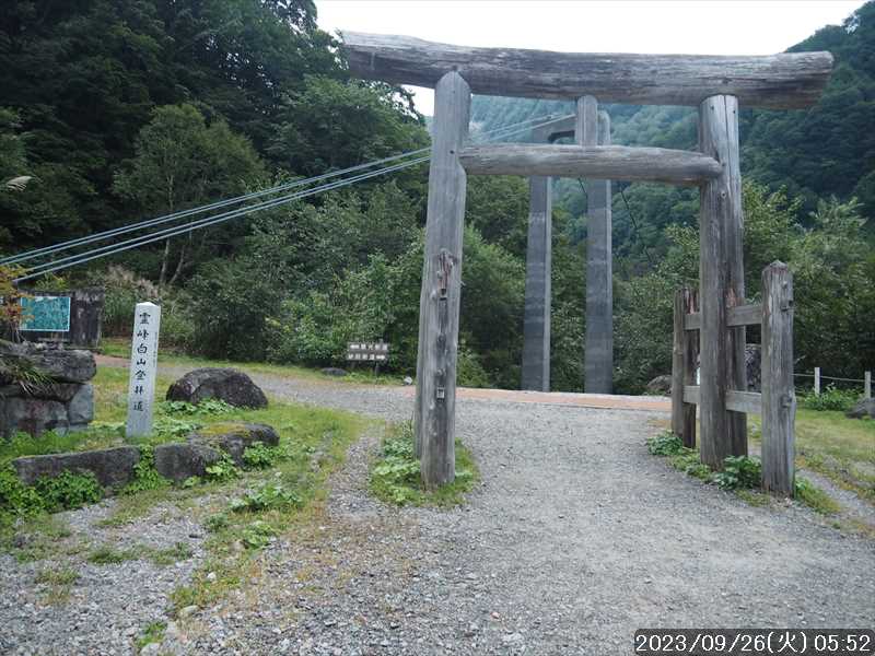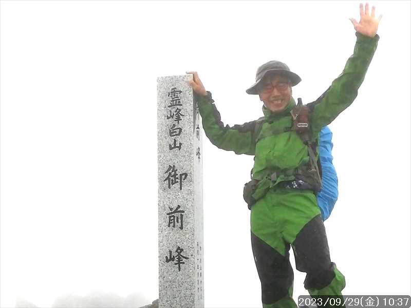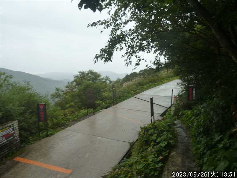 | 今シーズン 5回目の遠征 車中泊 2泊で、毎年恒例となった白山と、帰路に寄り道をして青葉山へ登る予定。 白山は、高速を利用しなくても行けるので 5年前から毎年行くようになった。テント泊も出来るので 1シーズンに 2回行ったことも 2度ある。 登山口からの標高差は 1500m、距離も 15㎞ほどあるので、当方の足で限界に近い山である、いつまで登頂可能か指標になる。 2日目は、いつも通り疲れた足でも負担にならない山ということで、昨年に引き続き若狭の山の青葉山を選択した。低山だが別名が若狭富士、近畿・関西 100名山である。 【前日(移動日) 9月25日(月)】 車中泊地の勝山までオール下道で 5時間くらい。近くのガソリンスタンドで満タンにして 14時に奈良をスタート。 なお、ガソリン価格は政府補助が上がったことにより、前回(13日前)より 6円/㍑下がっていた。 京都の手前の城陽から渋滞気味になり、京都を抜け湖西道路に入るまで渋滞が続いた。3~40分は余分にかかった感じ。 しかしその後は順調に流れ、いつも通り高島のスーパーで、夕食と明日の朝食の食材を仕入れ、その先も順調にに走り、暗くなった「道の駅:河野」でスーパーで購入したソバ・イナリの夕食。のど越しがいいので最近のパターンだ。 福井市内も渋滞に引っかかることはなく、車中泊地の「道の駅:恐竜 渓谷かつやま」には 19:40に到着。自宅から 210.7㎞ 5:40’で走って来た。 広い駐車場に駐車している車は 数台、トイレに近い端っこに駐車した。3年前に出来た新しい道の駅で、勝山ICに近く、この道の駅ができてからは白山に行くときにはここを利用するようになった。 時間は早かったが、することもなく運転疲れもあるので車内ベットを設え、明日 3時半起床として横になる。 厚手の毛布とシュラフを持参してきたが外気温は 23℃だったので、シュラフに下半身入った状態で十分だった。夜中にトイレに起きた時、少し冷えを感じたのでシュラフを胸元までかけ直した。 いつも通り寝つきは悪かったが、いつの間にか寝ていた 【1日目 9月26日(火) 自宅を出てからは 2日目】 トイレに起きて次に目覚めたのが 3時過ぎ。起きるにはまだ早いので少しベットの中でグズグズしてから起床。マァーマァー寝れた感じだった。 昨日、スーパーで購入したオニギリ・パンの朝食。今までは道の駅の自販機で缶コーヒー等を購入していたが節約のためスーパーでコーヒーも購入してきた。道の駅に貢献できなくて申し訳ない感じだが、節約が一番だ。 道の駅正面のコンビニで、昼食の食材を購入して、登山口に向かう。 現地には 05:20に到着。道の駅から 45.2㎞ 1:10’で走ってきた。スタート時は真っ暗だったが、現地に近づくにつれ空は白み始め、到着時は日の出前だがもう明るくなってきていた。 登山口に出来るだけ近くということで、県道横の駐車地の先まで行って駐車しかけたが、後部が草ボウボウで、車のフロントが道路にはみ出してしまうので、そこでの駐車をあきらめ、少し戻った舗装された駐車地に駐車。 隣のワンボックスは後ろのドアにマウンテンバイクを乗せていた。ナンバーを見ると札幌ナンバー、はるばる北海道からの大遠征みたい。 到着時の気温は 16℃。明けてきた空は曇空。昨日確認した「てんくら」の天気予報も曇りだったが、登山指数は「A」が並んでいた。 Tシャツに長袖のシャツを着てスタート。9月も終わりの時期になったので薄手の上着を持ってこようと思っていたのに忘れてきたが、今日は上着がなくても問題ない気温。 駐車地から 600mほどを 7~8分歩き別当出合に到着。 毎回思うのだが下の大駐車場と比べてどちらが楽だろうか。下の駐車場は、登山口までの距離は半分ほどだが県道横の路肩Pに比べ地道の登りが 50mほどある。 別当出合には、2組ほどしか見かけなかった。準備中に数台ほど車が通過して行ったので、平日の今日でもそれなりの登山者がいるかと思ったのだが。 鳥居をくぐり、砂防新道の吊橋に向かわず、今回は左の観光新道から登る事にした。観光新道を登りで使うのは 7年ぶり 3回目だ。最近は楽な砂防新道ばかりだった。 入山したすぐ先から急登が始まるが、石畳等で道が整備されているので比較的歩きやすい。足元は濡れているが登りなので滑ることはない。 観光新道に入って、キツイ坂を一生懸命に登って高度を上げていくと次第に霧が濃くなり霧雨模様になってきた。今年新調したザックは防水が効いていないのでザックカバーをする。雨具は迷ったが、軽い霧雨程度だったので着用しなかった。 今までに見た記憶のない喜市郎坂の標識の所を過ぎると、霧雨模様から小雨模様に変わってきたので、雨具の上下を着用した。雨具のズボンを履くと足サバキが窮屈になるが、靴の中に雨が染みこみ濡れるのを防ぐため致し方ない。結果的にこの先下山するまで上下とも着用しいたままだった。入山早々から下山まで雨具を着用したのは初めての経験。 駐車場をスタートして 1:27’、別当出
