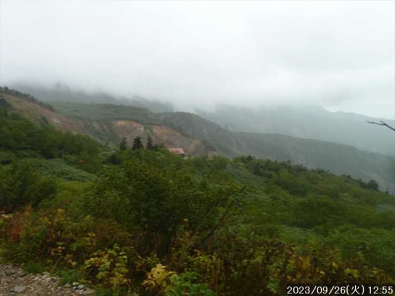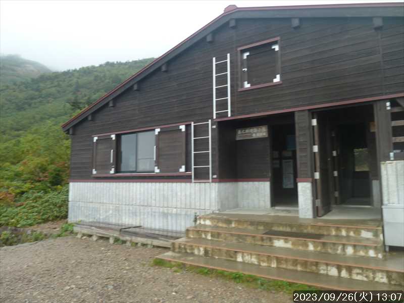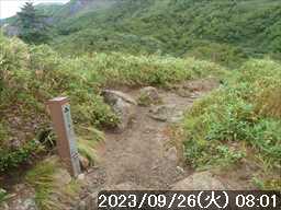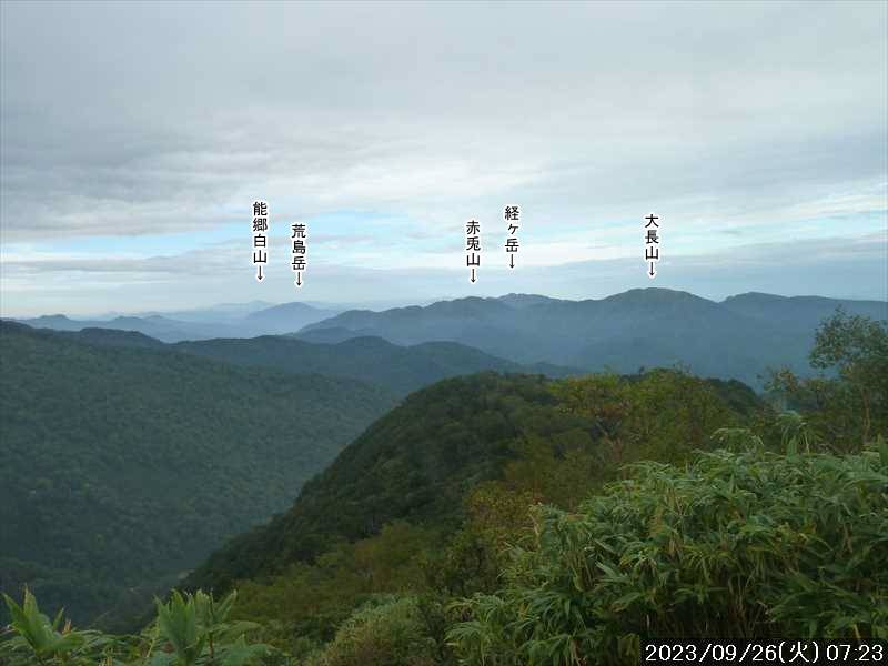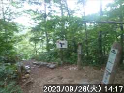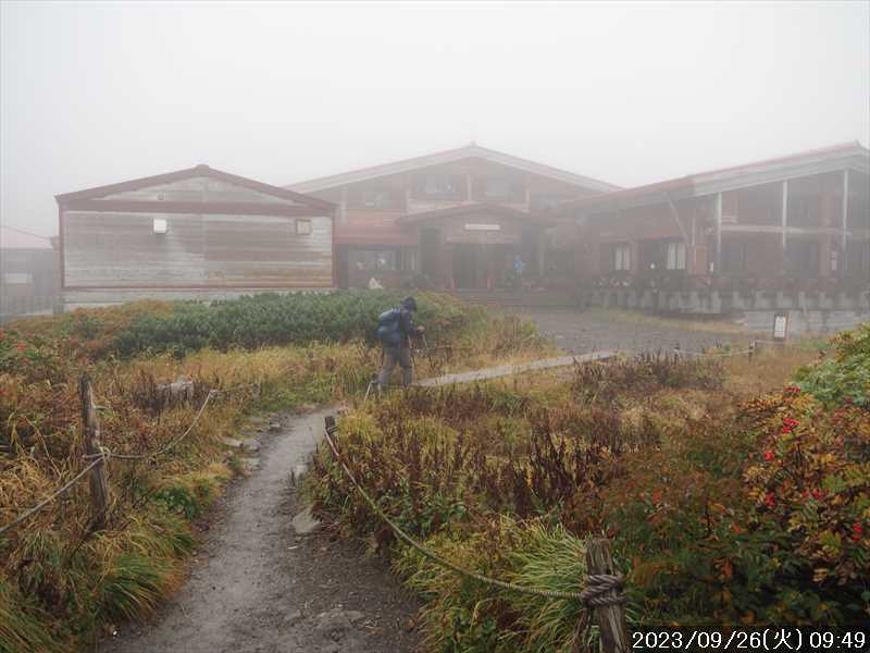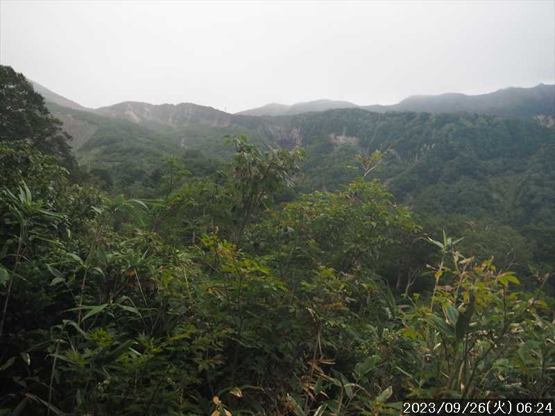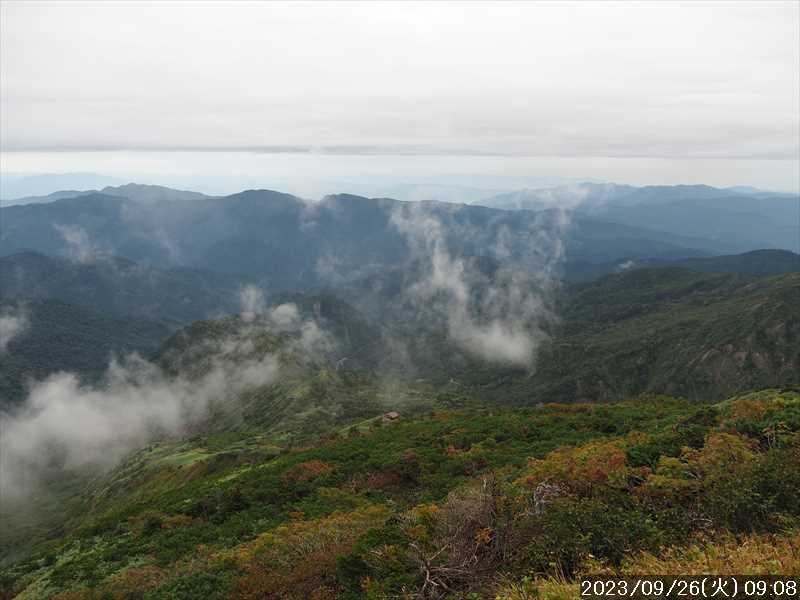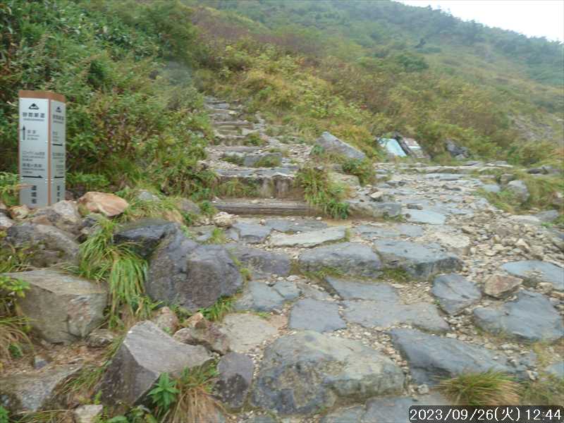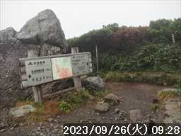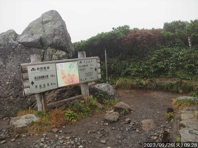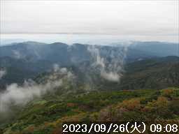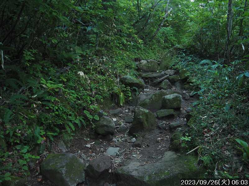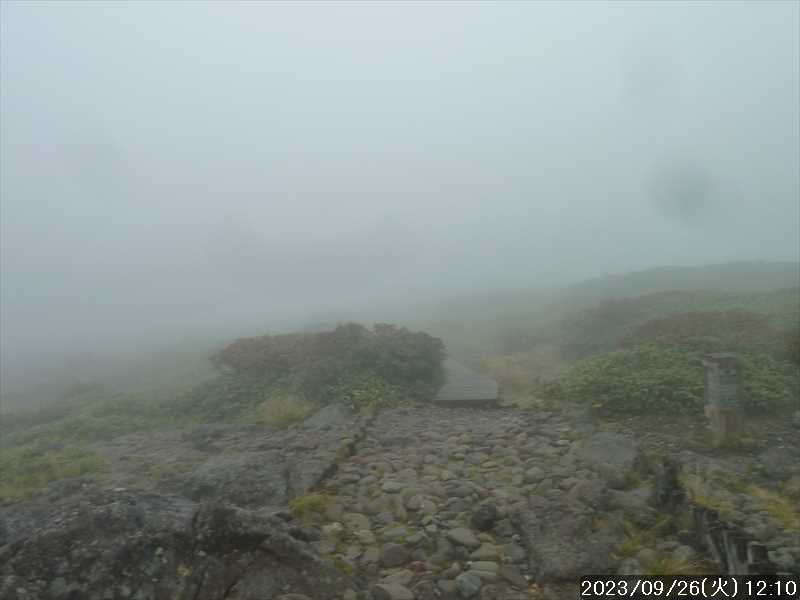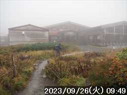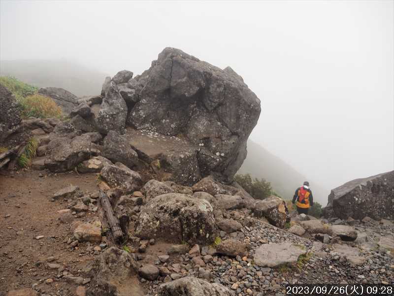 | 今シーズン 5回目の遠征 車中泊 2泊で、毎年恒例となった白山と、帰路に寄り道をして青葉山へ登る予定。 白山は、高速を利用しなくても行けるので 5年前から毎年行くようになった。テント泊も出来るので 1シーズンに 2回行ったことも 2度ある。 登山口からの標高差は 1500m、距離も 15㎞ほどあるので、当方の足で限界に近い山である、いつまで登頂可能か指標になる。 2日目は、いつも通り疲れた足でも負担にならない山ということで、昨年に引き続き若狭の山の青葉山を選択した。低山だが別名が若狭富士、近畿・関西 100名山である。 【前日(移動日) 9月25日(月)】 車中泊地の勝山までオール下道で 5時間くらい。近くのガソリンスタンドで満タンにして 14時に奈良をスタート。 なお、ガソリン価格は政府補助が上がったことにより、前回(13日前)より 6円/㍑下がっていた。 京都の手前の城陽から渋滞気味になり、京都を抜け湖西道路に入るまで渋滞が続いた。3~40分は余分にかかった感じ。 しかしその後は順調に流れ、いつも通り高島のスーパーで、夕食と明日の朝食の食材を仕入れ、その先も順調にに走り、暗くなった「道の駅:河野」でスーパーで購入したソバ・イナリの夕食。のど越しがいいので最近のパターンだ。 福井市内も渋滞に引っかかることはなく、車中泊地の「道の駅:恐竜 渓谷かつやま」には 19:40に到着。自宅から 210.7㎞ 5:40’で走って来た。 広い駐車場に駐車している車は 数台、トイレに近い端っこに駐車した。3年前に出来た新しい道の駅で、勝山ICに近く、この道の駅ができてからは白山に行くときにはここを利用するようになった。 時間は早かったが、することもなく運転疲れもあるので車内ベットを設え、明日 3時半起床として横になる。 厚手の毛布とシュラフを持参してきたが外気温は 23℃だったので、シュラフに下半身入った状態で十分だった。夜中にトイレに起きた時、少し冷えを感じたのでシュラフを胸元までかけ直した。 いつも通り寝つきは悪かったが、いつの間にか寝ていた 【1日目 9月26日(火) 自宅を出てからは 2日目】 トイレに起きて次に目覚めたのが 3時過ぎ。起きるにはまだ早いので少しベットの中でグズグズしてから起床。マァーマァー寝れた感じだった。 昨日、スーパーで購入したオニギリ・パンの朝食。今までは道の駅の自販機で缶コーヒー等を購入していたが節約のためスーパーでコーヒーも購入してきた。道の駅に貢献できなくて申し訳ない感じだが、節約が一番だ。 道の駅正面のコンビニで、昼食の食材を購入して、登山口に向かう。 現地には 05:20に到着。道の駅から 45.2㎞ 1:10’で走ってきた。スタート時は真っ暗だったが、現地に近づくにつれ空は白み始め、到着時は日の出前だがもう明るくなってきていた。 登山口に出来るだけ近くということで、県道横の駐車地の先まで行って駐車しかけたが、後部が草ボウボウで、車のフロントが道路にはみ出してしまうので、そこでの駐車をあきらめ、少し戻った舗装された駐車地に駐車。 隣のワンボックスは後ろのドアにマウンテンバイクを乗せていた。ナンバーを見ると札幌ナンバー、はるばる北海道からの大遠征みたい。 到着時の気温は 16℃。明けてきた空は曇空。昨日確認した「てんくら」の天気予報も曇りだったが、登山指数は「A」が並んでいた。 Tシャツに長袖のシャツを着てスタート。9月も終わりの時期になったので薄手の上着を持ってこようと思っていたのに忘れてきたが、今日は上着がなくても問題ない気温。 駐車地から 600mほどを 7~8分歩き別当出合に到着。 毎回思うのだが下の大駐車場と比べてどちらが楽だろうか。下の駐車場は、登山口までの距離は半分ほどだが県道横の路肩Pに比べ地道の登りが 50mほどある。 別当出合には、2組ほどしか見かけなかった。準備中に数台ほど車が通過して行ったので、平日の今日でもそれなりの登山者がいるかと思ったのだが。 鳥居をくぐり、砂防新道の吊橋に向かわず、今回は左の観光新道から登る事にした。観光新道を登りで使うのは 7年ぶり 3回目だ。最近は楽な砂防新道ばかりだった。 入山したすぐ先から急登が始まるが、石畳等で道が整備されているので比較的歩きやすい。足元は濡れているが登りなので滑ることはない。 観光新道に入って、キツイ坂を一生懸命に登って高度を上げていくと次第に霧が濃くなり霧雨模様になってきた。今年新調したザックは防水が効いていないのでザックカバーをする。雨具は迷ったが、軽い霧雨程度だったので着用しなかった。 今までに見た記憶のない喜市郎坂の標識の所を過ぎると、霧雨模様から小雨模様に変わってきたので、雨具の上下を着用した。雨具のズボンを履くと足サバキが窮屈になるが、靴の中に雨が染みこみ濡れるのを防ぐため致し方ない。結果的にこの先下山するまで上下とも着用しいたままだった。入山早々から下山まで雨具を着用したのは初めての経験。 駐車場をスタートして 1:27’、別当出