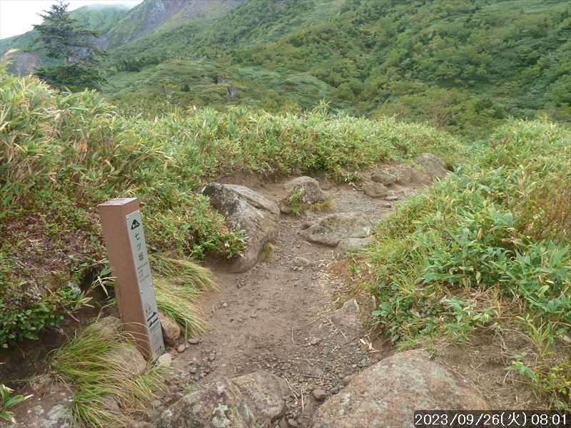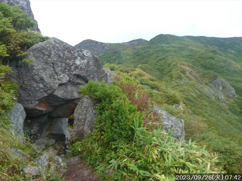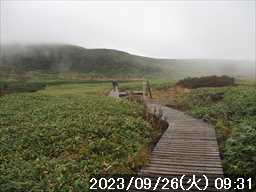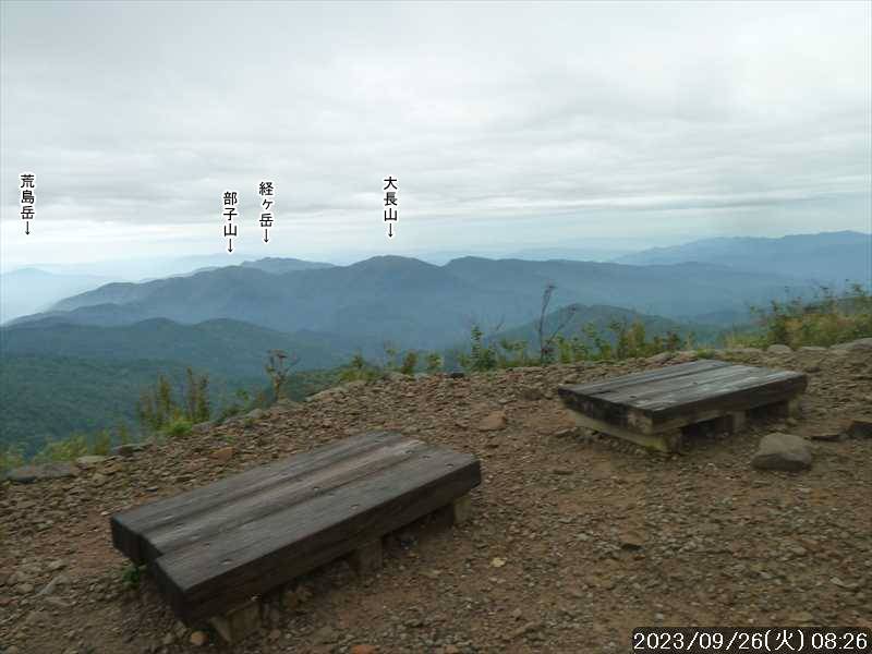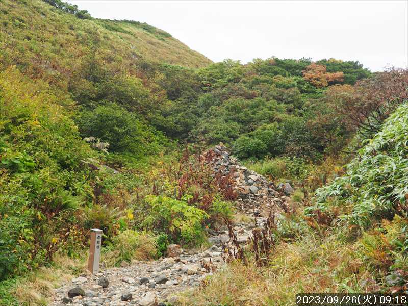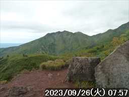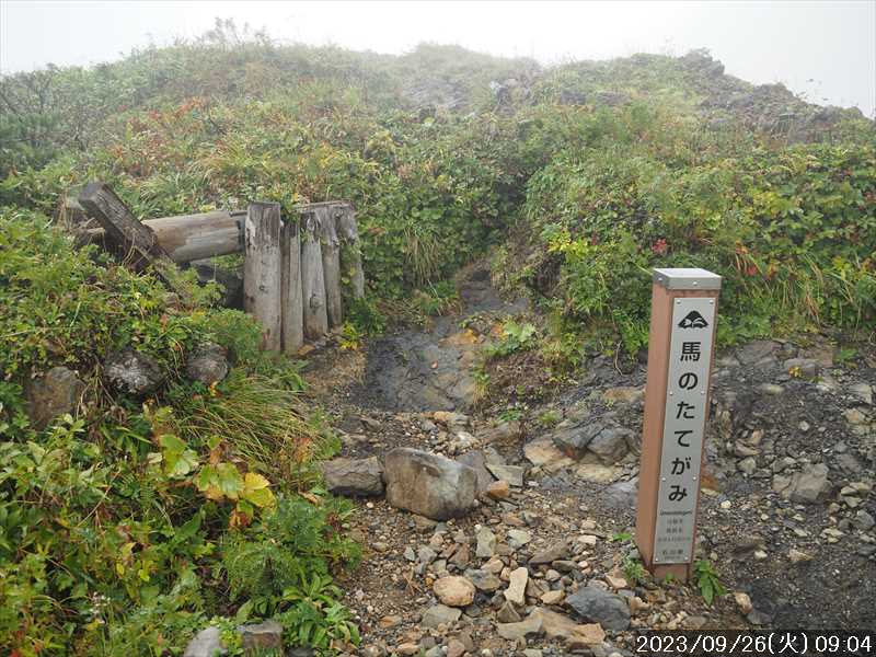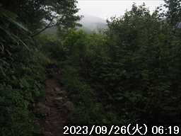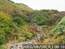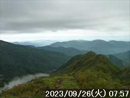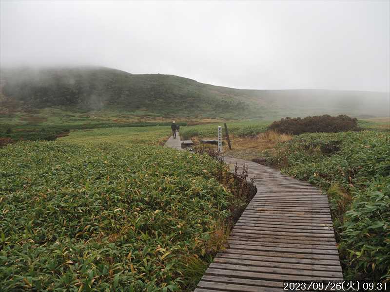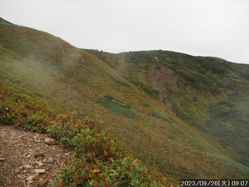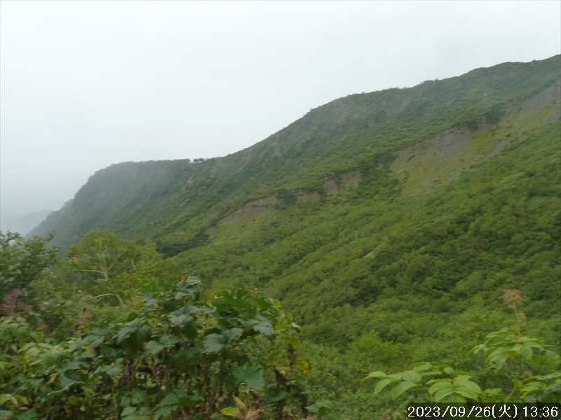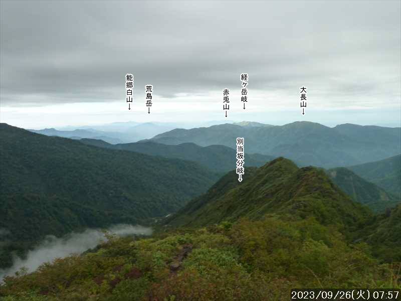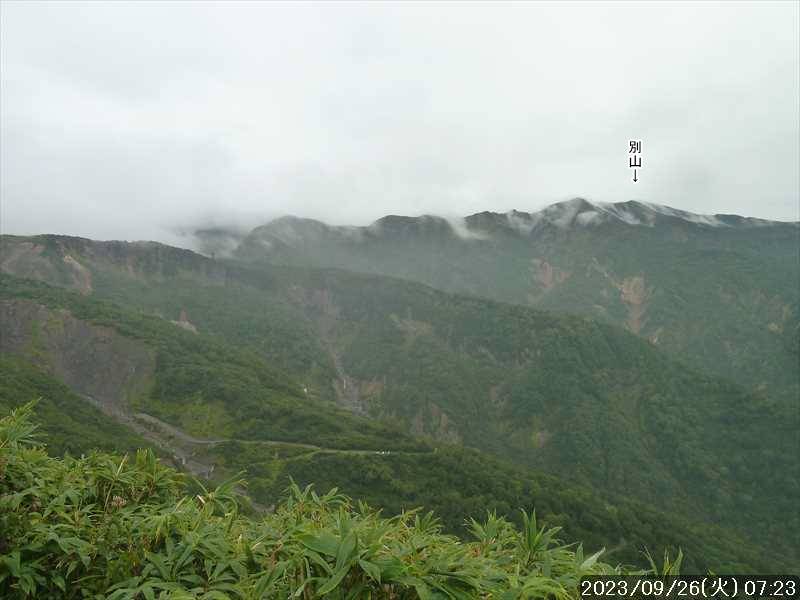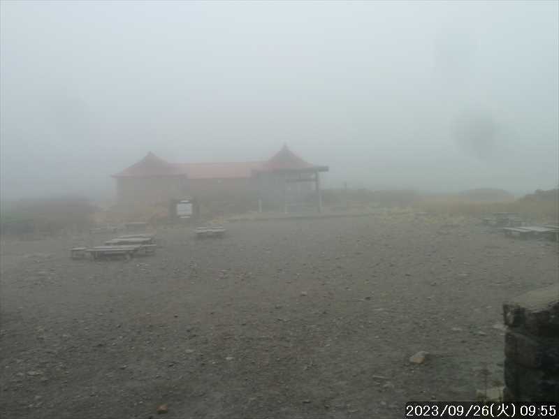 | 今シーズン 5回目の遠征 車中泊 2泊で、毎年恒例となった白山と、帰路に寄り道をして青葉山へ登る予定。 白山は、高速を利用しなくても行けるので 5年前から毎年行くようになった。テント泊も出来るので 1シーズンに 2回行ったことも 2度ある。 登山口からの標高差は 1500m、距離も 15㎞ほどあるので、当方の足で限界に近い山である、いつまで登頂可能か指標になる。 2日目は、いつも通り疲れた足でも負担にならない山ということで、昨年に引き続き若狭の山の青葉山を選択した。低山だが別名が若狭富士、近畿・関西 100名山である。 【前日(移動日) 9月25日(月)】 車中泊地の勝山までオール下道で 5時間くらい。近くのガソリンスタンドで満タンにして 14時に奈良をスタート。 なお、ガソリン価格は政府補助が上がったことにより、前回(13日前)より 6円/㍑下がっていた。 京都の手前の城陽から渋滞気味になり、京都を抜け湖西道路に入るまで渋滞が続いた。3~40分は余分にかかった感じ。 しかしその後は順調に流れ、いつも通り高島のスーパーで、夕食と明日の朝食の食材を仕入れ、その先も順調にに走り、暗くなった「道の駅:河野」でスーパーで購入したソバ・イナリの夕食。のど越しがいいので最近のパターンだ。 福井市内も渋滞に引っかかることはなく、車中泊地の「道の駅:恐竜 渓谷かつやま」には 19:40に到着。自宅から 210.7㎞ 5:40’で走って来た。 広い駐車場に駐車している車は 数台、トイレに近い端っこに駐車した。3年前に出来た新しい道の駅で、勝山ICに近く、この道の駅ができてからは白山に行くときにはここを利用するようになった。 時間は早かったが、することもなく運転疲れもあるので車内ベットを設え、明日 3時半起床として横になる。 厚手の毛布とシュラフを持参してきたが外気温は 23℃だったので、シュラフに下半身入った状態で十分だった。夜中にトイレに起きた時、少し冷えを感じたのでシュラフを胸元までかけ直した。 いつも通り寝つきは悪かったが、いつの間にか寝ていた 【1日目 9月26日(火) 自宅を出てからは 2日目】 トイレに起きて次に目覚めたのが 3時過ぎ。起きるにはまだ早いので少しベットの中でグズグズしてから起床。マァーマァー寝れた感じだった。 昨日、スーパーで購入したオニギリ・パンの朝食。今までは道の駅の自販機で缶コーヒー等を購入していたが節約のためスーパーでコーヒーも購入してきた。道の駅に貢献できなくて申し訳ない感じだが、節約が一番だ。 道の駅正面のコンビニで、昼食の食材を購入して、登山口に向かう。 現地には 05:20に到着。道の駅から 45.2㎞ 1:10’で走ってきた。スタート時は真っ暗だったが、現地に近づくにつれ空は白み始め、到着時は日の出前だがもう明るくなってきていた。 登山口に出来るだけ近くということで、県道横の駐車地の先まで行って駐車しかけたが、後部が草ボウボウで、車のフロントが道路にはみ出してしまうので、そこでの駐車をあきらめ、少し戻った舗装された駐車地に駐車。 隣のワンボックスは後ろのドアにマウンテンバイクを乗せていた。ナンバーを見ると札幌ナンバー、はるばる北海道からの大遠征みたい。 到着時の気温は 16℃。明けてきた空は曇空。昨日確認した「てんくら」の天気予報も曇りだったが、登山指数は「A」が並んでいた。 Tシャツに長袖のシャツを着てスタート。9月も終わりの時期になったので薄手の上着を持ってこようと思っていたのに忘れてきたが、今日は上着がなくても問題ない気温。 駐車地から 600mほどを 7~8分歩き別当出合に到着。 毎回思うのだが下の大駐車場と比べてどちらが楽だろうか。下の駐車場は、登山口までの距離は半分ほどだが県道横の路肩Pに比べ地道の登りが 50mほどある。 別当出合には、2組ほどしか見かけなかった。準備中に数台ほど車が通過して行ったので、平日の今日でもそれなりの登山者がいるかと思ったのだが。 鳥居をくぐり、砂防新道の吊橋に向かわず、今回は左の観光新道から登る事にした。観光新道を登りで使うのは 7年ぶり 3回目だ。最近は楽な砂防新道ばかりだった。 入山したすぐ先から急登が始まるが、石畳等で道が整備されているので比較的歩きやすい。足元は濡れているが登りなので滑ることはない。 観光新道に入って、キツイ坂を一生懸命に登って高度を上げていくと次第に霧が濃くなり霧雨模様になってきた。今年新調したザックは防水が効いていないのでザックカバーをする。雨具は迷ったが、軽い霧雨程度だったので着用しなかった。 今までに見た記憶のない喜市郎坂の標識の所を過ぎると、霧雨模様から小雨模様に変わってきたので、雨具の上下を着用した。雨具のズボンを履くと足サバキが窮屈になるが、靴の中に雨が染みこみ濡れるのを防ぐため致し方ない。結果的にこの先下山するまで上下とも着用しいたままだった。入山早々から下山まで雨具を着用したのは初めての経験。 駐車場をスタートして 1:27’、別当出