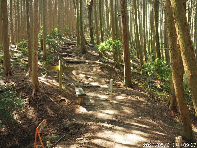 | 葛城山に、「自然ツツジ園」のツツジ鑑賞と、3年ぶりの体力測定に行くことにした。 ツツジはまだ早い模様だが、フライングしている株が幾つかあるのを期待して。 体力測定は、古希を超えてからどれくらい経年劣化してるか、数値で納得するため。 ゴールデンウィークの休日は混んでおると思われるため、谷間の平日を利用して行く。 今年のGWは、谷間の 5/1・2 を休めば 10連休。1年 365日連休の当方には関係ないが。 現地は近いので、特にこだわっていなかったがいつもより早く目が覚めたので、その分早く自宅をスタート。 通勤時間帯前であったが、それでも普段よりは走っている車は少ない感じだった。休みにしている所も多いのだろうか。 竹内峠を過ぎて大阪側に下って行くと左手に広い駐車場があり、そこには数台の車が駐車しており、準備中の車もあった。その駐車場には入らず、その先の右手にある二上山万葉の森の駐車場に入ろうとしたら、工事中で入り口が閉鎖されていた。 Uターンできないので隣のフィッシングセンターに入り万葉の森の駐車場に上がろうとしたら、そこからは上がれない。 そのまま、フィッシングセンターの駐車場に停めて準備していたら、軽トラにオッサンが入ってきてリュックを背負った当方をみて、登山者用の駐車場ではないとクレーム。そこは素直に謝り、先ほど見た国道反対側の広い駐車場に移動した。 今日の外気温は 11℃ ちょうどよい気候でのスタート。 駐車場から竹内峠へ向かわず反対側に少し下った所で左の林道に折れる。車止めゲートの下を潜り舗装林道をダラダラと登って行く。いつもは往路は竹内峠からで帰路にその林道を利用していたが今回は目先を変えて逆にした。 数個の溜池を左に見て、20分ほどで竹内峠からの舗装林道に合流。そこからはダイトレ道。 舗装道から未舗装・山道と変わっていく。一山超えて少し下ると平石峠。そのまま反対側の岩橋山への登りに入る。 数カ所の階段場を一生懸命に登り、過去のイメージより長く感じ岩橋山に到着。その登りの最中に続けて単独さん 3名に追い抜かれる。山頂で一服していた単独さんに何かイベントでもあるのかと聞くとノーとの事。トレランの雰囲気もあったので聞いたのだが偶然らしい。 岩橋山のベンチでパンを小腹に入れて先に進む。岩橋峠への下りは急な階段下り、帰路での登り返しを思うと溜息が出てきた。 岩橋峠まで下り、反対側の登りにかかるとそこからは、ダラダラとした登り・階段場・並行道などのルートが交互に出てくる。時々下りもある。 新庄(布施城跡)分岐・持尾辻・忍海(山麓公園)分岐・忍海(山口・笛吹)分岐、と大阪方面・奈良方面への分岐を通り過ぎると、前方に急階段が出てきた。階段手前に左に巻いていく踏み跡があった。 その踏み跡に入ると尾根に回り込んで、その尾根を上がると先ほどの階段の上部に出た。 その少し先でも、同じように急階段の手前に左に踏み跡。そこも左の踏み跡に進むと、北尾根コースに合流した。出てきた所にはロープが張ってあった。その北尾根を少し上がると、先ほどの階段の上部に出た。 北尾根分岐から直ぐの所で、またまた分岐。「←自然研究路から山頂 1.4㎞(階段少ない)」・「ダイヤモンドトレールから山頂 1.0㎞(階段多い)→」の案内表示があった。そこは距離は長くなるが自然研究路に折れる。 山腹を巻いている広い遊歩道をしばらく歩くと、ロープウェー山頂駅からのコンクリート道に合流した。ロープウェーで来た多くの人が山頂へ向かっていた。 急なコンクリート道を登りきると、キャンプ場からのダイトレに合流。その合流地点の隣に葛城山山頂へのショートカット道があるので、その道から山頂を目指す。 葛城山山頂には、スタートして 3:39’で到着。多くの人がいた。 少し濁っていたが、大展望の景色を見て「自然ツツジ園」に向かいかけた所、山頂横のコンクリートベンチが 1つ空いていた。山頂には多くの人がいたのでツツジ園に行ってもベンチ(デッキ)は混んでいるだろうと思い、山頂で昼食にすることにした。 天気は良いが山頂は吹き曝しで風が強い。寒くはないがベンチに店開きした品々が飛ばされないように気を使う。そんなんで山頂では昼食のみを済ませ早々に「自然ツツジ園」に向かう。 「自然ツツジ園」を見下ろせる山頂際まで進むと、予想通りツツジは蕾が膨らみ始めた段階くらい。下のほうが咲き始めているようで赤みが多かった感じ。 そんなこともあり、「つつじ鑑賞路」の道標に従い、下のほうに周回していく道をとる。いつもは上部から眺めるだけだったが、今回初めて「自然ツツジ園」の下方まで行ってみる事にした。 咲き始めたツツジを見ながら下まで下りると、休憩デッキの人が帰る所だったので入れ替わりにデッキに上がり一服。昼食時にパスしたコーヒー・デザートで寛ぐ。 すると若い女性 2人が当方の居るデッキ横で写真を撮っている、カタクリだ。全然気付いてなく