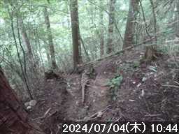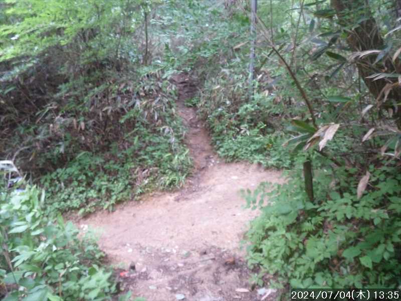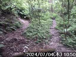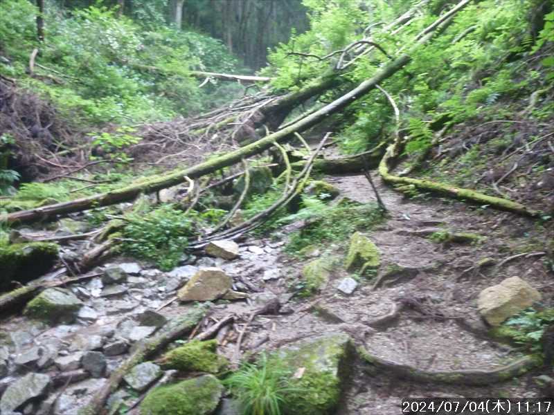 | 梅雨前線が日本列島の上の方に移動して、列島の太平洋岸は真夏のような天気になった。 そんな訳で、今日は耐暑登山訓練となりそうだ 今日の目的は金剛山。どのルートで歩くかで検討すると、良く歩かれているルートでまだ歩いた事のないルートがあった。カタクリ尾根だ。 そのカタクリ尾根をまわるルートとして、水越峠からダイトレで金剛山に上がり、カタクリ尾根は下りで利用して、下りきった細尾谷ルートから登り返し、太尾東尾根から戻る周回とした。 現地は自宅から近いので、いつも通りに起きて自宅をスタート。 通勤時間帯にはまだ早いのでほぼ順調に奈良市内を抜けたが、郊外に出ると次第に車が増え信号にも多く引っかかった。最近よく利用している 24hスーパーに寄ったこともあるので、現地まですいていたら 1時間くらいで行ける所を 1:35’かかって到着。 水越バス停(バス回転所)横の駐車地に駐車した。下山予定の太尾東尾根の登山口の少し上側だ。先着車は 5台で、まだ数台の空きがあった。 車で来る途中、まだ朝のうちにもかかわらず外気温は 30℃まで上がっていて、今日はどうなる事やら と思っていたが、現地に着いたら 24℃まで下がっていた。 駐車地から、旧国道を水越峠に向かってセッセと登って行くと、峠の少し手前から路駐車が並んでいた。 歩き始めて 6分ほどで、ガンドガコバ林道の起点からダイトレに入る。 傾斜のある舗装された林道を登って行く。途中で舗装は切れるが広い林道が続く。 日課にしていると思われる早朝登山者と何組かすれ違い、スタートして 37分でダイトレ分岐のカヤンボに到着。林道入口からはジャスト 30分だった。 橋を渡ると山道になり、直ぐの所の東屋の横を抜けて先の急登をジグザグに上がって行くと、林道が交差して、そのまま反対側に登って行くと、尾根上にある旧パノラマ台のベンチ場。 反対側に木の間から狭い展望があり、そこから奈良盆地の南端が見下ろせ、盆地の向こう側に大和三山が浮かんでいた。 旧パノラマ台からは、基本的に尾根の登り。丸太階段のステップ場が多く整備されているが、そのステップを一段一段登るのに足を踏ん張るのがキツイ。階段横で歩ける所 があれば、そこを小股で登って行く。 延々と続いていたそんな場面を、旧パノラマ台から 52分で一の鳥居に到着。水越峠からは 1:43’だった。 一の鳥居に登ってきた反対正面に金剛山遊歩道への下り道があるので、金剛山の山頂(葛木神社)は後にして、その下り道に入る。 両側にササが腰の高さぐらいまで伸びて来ているので、ルートを覆っているが、足元は広い踏み跡があるので時々ササをかき分けながら下る。 ものの数分で、金剛山遊歩道に着地。左側のロープウェー乗場方面に進む。その右すぐの所に登り返してくる細尾谷ルートの分岐がある 遊歩道を 15分で、カタクリ尾根分岐となるベンチ場に到着。尾根先になるベンチの後ろ辺りに入口があるかと見るもそこにはなく、少し先に狭い入口の踏み跡があった。入口から急下りになっているルートが見下ろせた。そこは大阪と奈良との県境尾根でもある。 入口から尾根芯に向けて急な坂を下り、尾根芯に出ると傾斜が緩み広い尾根下りに変わった。平穏なルート。今は季節でないので分からないが、カタクリが咲く場所だろうか。 カタクリ尾根に入り 10分ほどで、左に下り始めた所で分岐があるのに気付いた。そのまま下って行けばカタクリ尾根の左の谷に下りていき、右に回り込めば尾根を下って行く模様。GPSに落としてきたルートは左側の谷になっているが、そこは尾根ルートを選択した。 分岐から暫くは平穏な下りだったが、沢音がして着地点が近づくと激下りに変わった。ただ木の根や岩がステップ代わりにあるのでスリップの心配はない、足を引っかけて転倒に気を付ければ問題なかった。 下りきった所で、左からのルートと合流。先ほど分岐したルートだ。 合流した先で沢を渡渉すると、沢に並行した踏み跡の濃い細尾谷ルートに合流。その細尾谷ルートを登って行く。 谷横のルートは歩きやすかったが、少し先でルートは谷横から谷の中に入った。水量は多いが小岩の中を流れているのでドボンするような水たまりはない。ただルートが分かりにくいのと小岩で歩きにくい。谷に落ちてきている倒木も時々あった。 そんなんでチンタラ歩いていると、後ろからオバちゃんが追いついて来たので先に行ってもらう。 そのオバちゃんを追いかけて行く。歩きにくい沢をしばらく歩くいていると、次第に水の流れが薄くなり、気付かぬうち沢分岐の左側に入った辺りで水流はなくなり、滑りやすい足元になった。崩れている所にはロープも設置されていた。 細尾谷に着地してから登り返しにかかって 49分で遊歩道に上がった。歩きにくいルートだったこともあるがシンドイ登りだった。シルバールートとの別称のあるルートだが、シルバーには全然優しくない。 上がってきた遊歩道から山頂方向に向