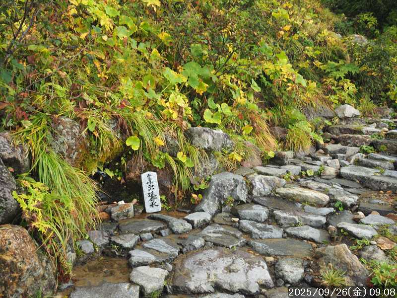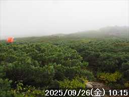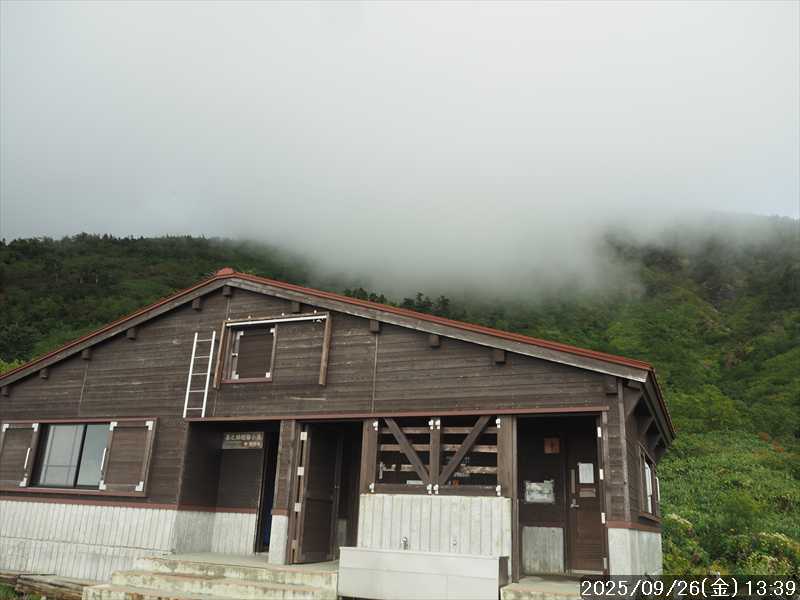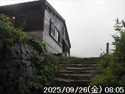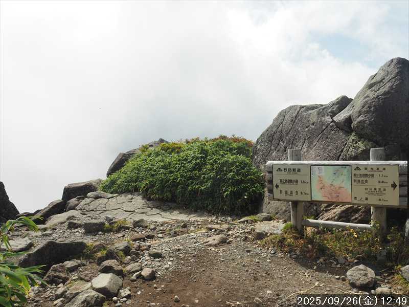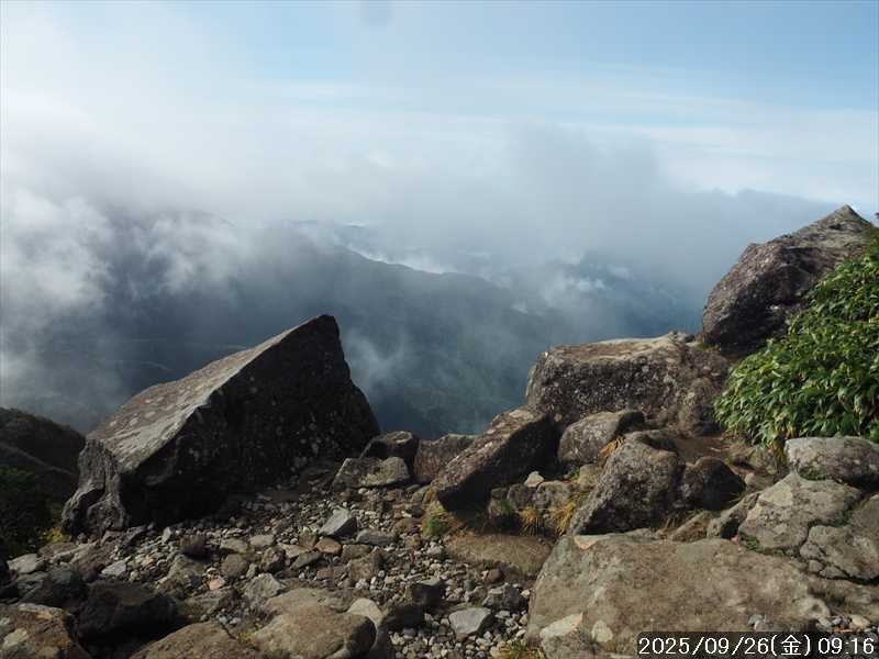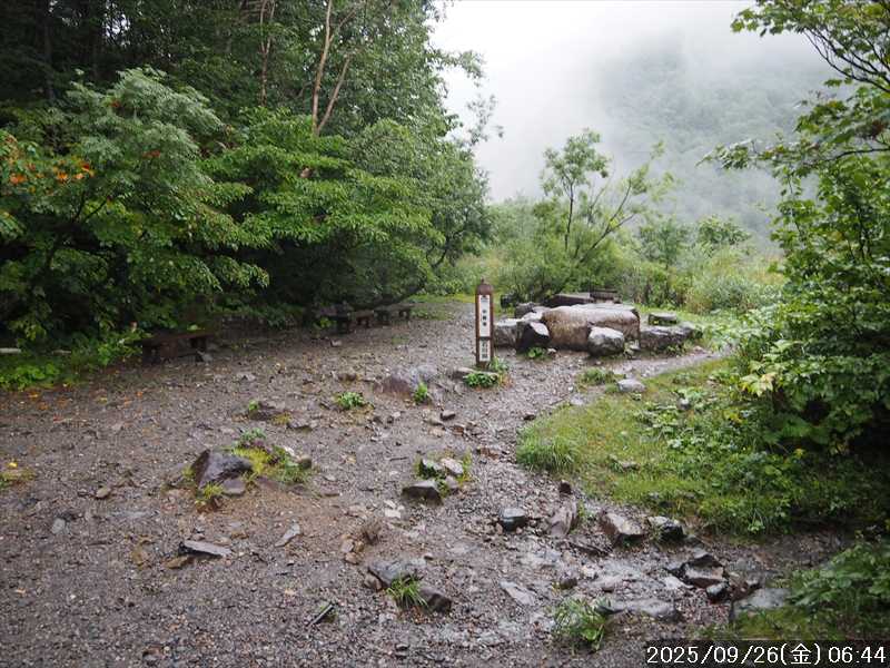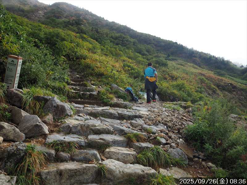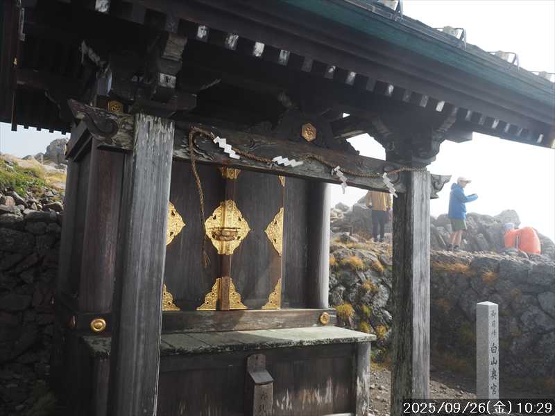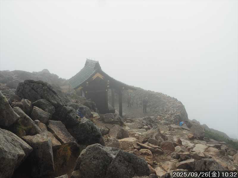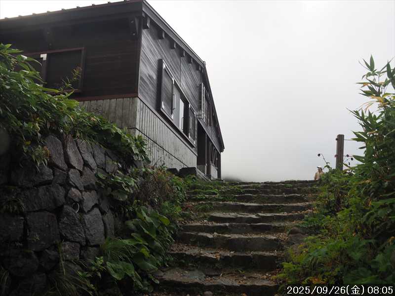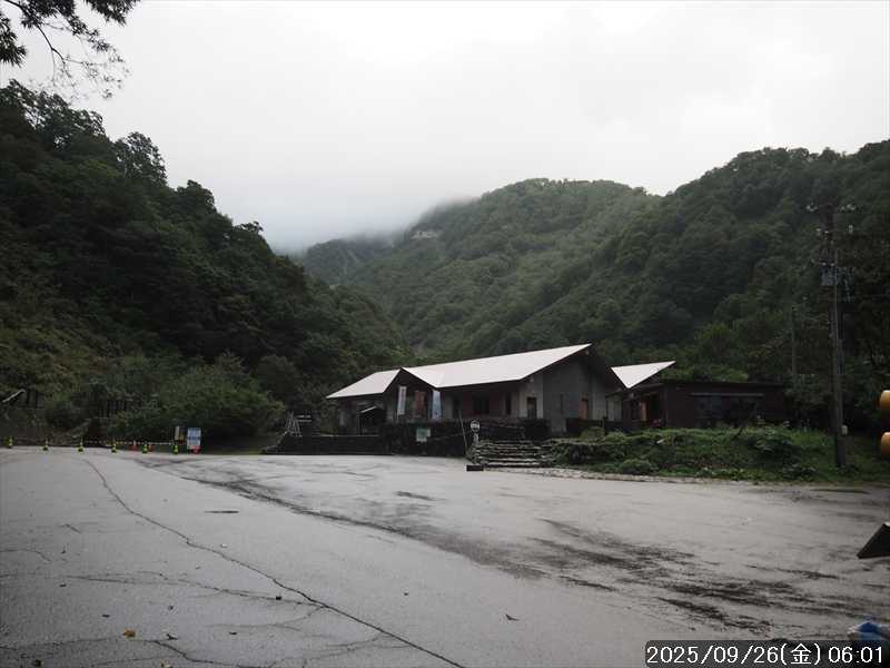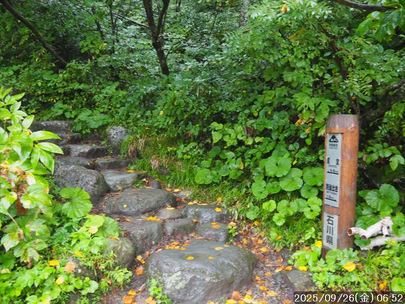 | 今シーズン 4回目の遠征。 遠征先は白山と由良ヶ岳で、2泊で 2山を登る予定とした。 10日前に歩いた越後駒ヶ岳で、体力の衰えを思い知らされているので、それより標高差のある白山は不安はあるが、何度も(11回)登った山であり登山道は整備され急こう配などのややこしい場面もないので弱った足でも問題ない・・たぶん。 昨年だけは機会を逸して登っていないが 2018年から毎年訪れており、1年に 2回訪れた年もあった。 ただ年を追うごとにシンドさが増しているように感じている。 2日目は軽めの山という事で、関西100名山の由良ヶ岳を選んだ。本来は日本300名山の冠山にしたかったが、下調べすると福井県側からは災害で通行止めになっている模様なので、次の機会に繰り越し。 【前日(移動日) 9月25日(木)】 ガソリンを満タンにして奈良を 14:15 にスタート。 京都付近でいつもより混んでいたので京都を抜けるまで 40分ほど余分にかかった。その後は順調に走り、高島のスーパーで今夕と明朝の食材を仕入れ、「道の駅;河野」でスーパーで購入した「ざるそば+おにぎり」の夕食を取る。このところ白山遠征時のパターンだ。 その先も順調に走り抜け、車中泊地の「道の駅;恐竜渓谷かつやま」には 20:00ジャストに到着。オール下道で夕食タイムを含め 209㎞を 5:45'で走ってきた。 5年前(2020年)この道の駅が出来てからは、白山に来るときはよく利用させてもらっている。 駐車場はガラガラで混んでいたためしはない。 到着時の外気温は 21℃。肌寒いくらいだが車は熱を持っているようで車中は暑いくらい。 明日、別当出合に 05:30 までに到着する予定にして、スマートウォッチのタイマーを 03:30にセットして、シュラフには潜らずお腹だけにかけて横になる。 疲れていたようで横になって間もなく眠れた感じ。 【1日目 9月26日(金) 自宅を出てからは 2日目】 「道の駅;恐竜渓谷かつやま」で、スマートウォッチが震動した 03:30 に起床。少し前に目が覚めていたが、時間まで横になっていた。 夜中もそれほど冷え込まなかったようで、夜中にトイレに起きたあとに足だけシュラフに入れて寝ただけだった。車が濡れていたので 一雨あったみたいだが眠っていたようで気付かなかった。 車内で朝食をとっている時に、雨が落ちてきたが暫くすると止んだ。どうも降ったり止んだりの天気模様みたい。 天気予報は 5時まで小雨で 6時以降はお日様マークが並んでいた。てんくらの登山指数も 6時からはオール「A」。天気は急速に回復する模様。 04:20 に道の駅をスタート。正面のコンビニで昼食の食材を仕入れ現地に向かう。 走行中は一時小雨が落ちてきた程度。 一ノ瀬から別当出合への道に入り暫く行った所で先行車に追いついた。狭い道なので急いでいた訳ではないが先方が譲ったので先に進むと、今度は後ろから 2台付いてくるのが見えた。 県道横の路肩駐車場が空いていたので、下の駐車場まで行かずにそこに駐車。続いて来た車 3台はそのまま下の駐車場に向かっていった。準備中に到着してきた 2台は当方の横に駐車した。 到着時の外気温は 17℃だったが特に寒さは感じなかった。雨はあがった感じなので長袖のシャツのままスタート。 別当出合の登山口には単独さんが 2名いて、観光新道と砂防新道にそれぞれ向かって行った。砂防新道に向かった女性には追いつけなかった。 別当出合の登山口をスタートして、登山口から少し入った所で霧雨の中に入ったみたい。そのまま歩いていたが濡れ始めたので、シェルを着て、ザックカバーもした。 先に進むほど霧雨から小雨・完全な雨へと変わった。頭が濡れるので、中飯場の手前の通路で、襟に収められているシェルのフードを被ろうとしたら、着たままではうまくいかない。致し方なくザックを下ろしシェルを脱いでいたら、続けて単独さんが 3人通過して行った。通路を半分塞いでいたので迷惑をかけてしまった。今日は平日なのに登山者が多い感じ。 フードで手間取っていたすぐ上が中飯場だった。フードの着用は中飯場まで待つべきだった。 その中飯場で、一服してあんパンの行動食。 小腹を満たして、雨模様の中を先に進む。完全に雨雲の中にいるので近くの物が見えるだけ。とにかく一生懸命に歩くだけだが、数組に追い抜かれた。追いついたのは単独の女性 1人だけ。 スタートして 2:12'で甚之助避難小屋に到着。ここまで多くの人に先行されたが、休憩していたのは直前に抜かれた 若者 3人さんのみ。抜いて行った人たちは足が速い。 この少し手前で雨は止んでいた、天気予報より 2時間遅れだ。下界方面には青空が一部に覗き始めていたが上の方はまだ真っ白だった。 雨は止んだのでシェルは脱いで、ザックカバーも外した。賞味期限のきた、カロリーメイトでエネルギー補給して、先に進む。 甚之助避難小屋から 21分で南竜分岐。そのまま通過して、次のポイント黒ボコ岩に向かう。 山腹を横切りながら登って行くルートに掛ると、足元が濡れているので