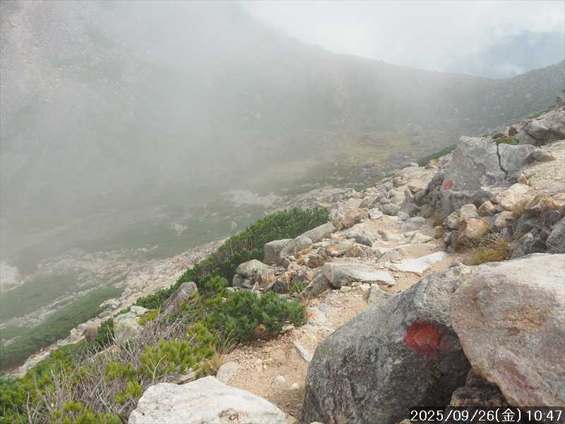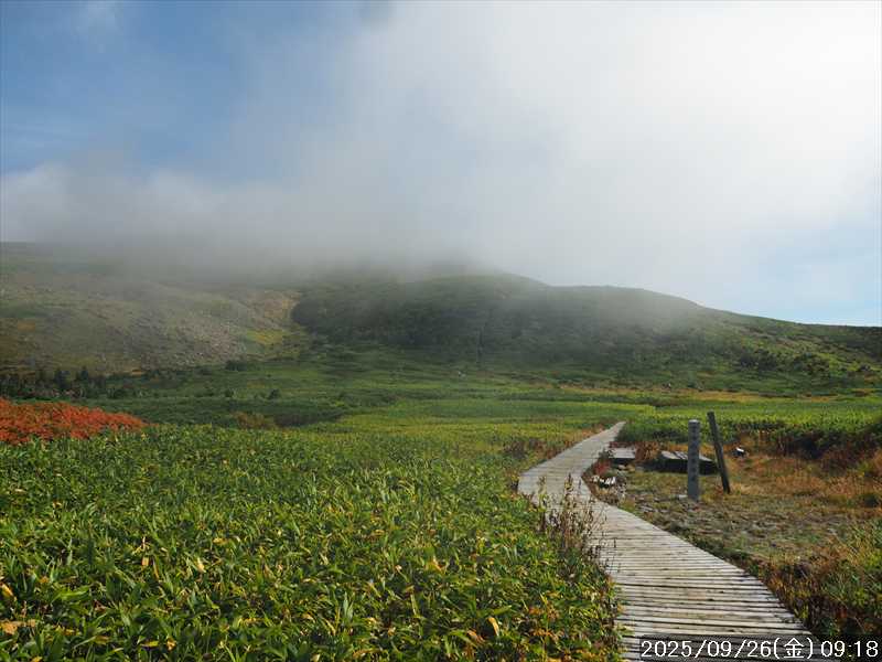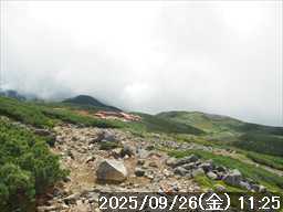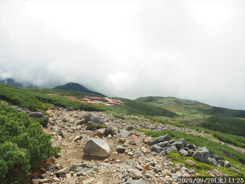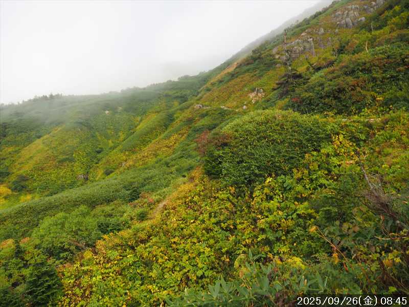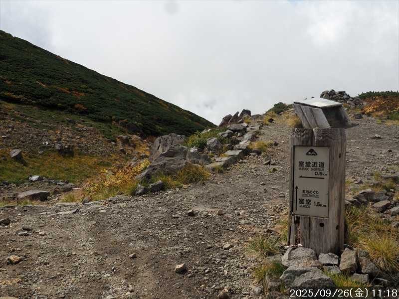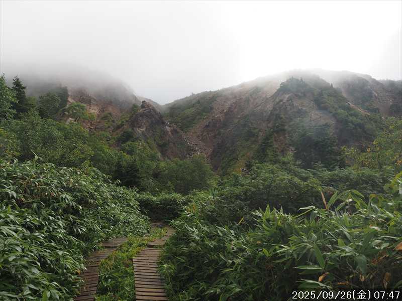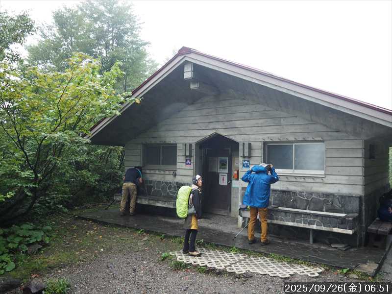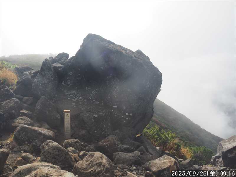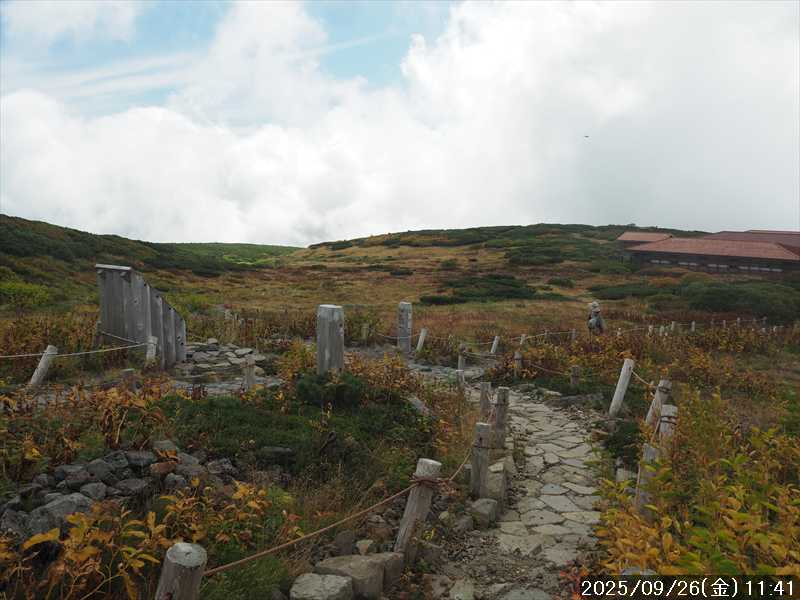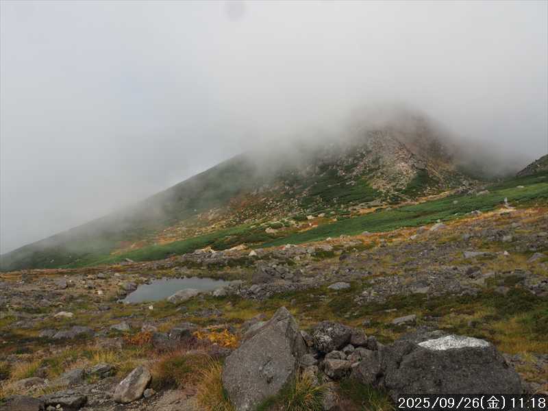 | 今シーズン 4回目の遠征。 遠征先は白山と由良ヶ岳で、2泊で 2山を登る予定とした。 10日前に歩いた越後駒ヶ岳で、体力の衰えを思い知らされているので、それより標高差のある白山は不安はあるが、何度も(11回)登った山であり登山道は整備され急こう配などのややこしい場面もないので弱った足でも問題ない・・たぶん。 昨年だけは機会を逸して登っていないが 2018年から毎年訪れており、1年に 2回訪れた年もあった。 ただ年を追うごとにシンドさが増しているように感じている。 2日目は軽めの山という事で、関西100名山の由良ヶ岳を選んだ。本来は日本300名山の冠山にしたかったが、下調べすると福井県側からは災害で通行止めになっている模様なので、次の機会に繰り越し。 【前日(移動日) 9月25日(木)】 ガソリンを満タンにして奈良を 14:15 にスタート。 京都付近でいつもより混んでいたので京都を抜けるまで 40分ほど余分にかかった。その後は順調に走り、高島のスーパーで今夕と明朝の食材を仕入れ、「道の駅;河野」でスーパーで購入した「ざるそば+おにぎり」の夕食を取る。このところ白山遠征時のパターンだ。 その先も順調に走り抜け、車中泊地の「道の駅;恐竜渓谷かつやま」には 20:00ジャストに到着。オール下道で夕食タイムを含め 209㎞を 5:45'で走ってきた。 5年前(2020年)この道の駅が出来てからは、白山に来るときはよく利用させてもらっている。 駐車場はガラガラで混んでいたためしはない。 到着時の外気温は 21℃。肌寒いくらいだが車は熱を持っているようで車中は暑いくらい。 明日、別当出合に 05:30 までに到着する予定にして、スマートウォッチのタイマーを 03:30にセットして、シュラフには潜らずお腹だけにかけて横になる。 疲れていたようで横になって間もなく眠れた感じ。 【1日目 9月26日(金) 自宅を出てからは 2日目】 「道の駅;恐竜渓谷かつやま」で、スマートウォッチが震動した 03:30 に起床。少し前に目が覚めていたが、時間まで横になっていた。 夜中もそれほど冷え込まなかったようで、夜中にトイレに起きたあとに足だけシュラフに入れて寝ただけだった。車が濡れていたので 一雨あったみたいだが眠っていたようで気付かなかった。 車内で朝食をとっている時に、雨が落ちてきたが暫くすると止んだ。どうも降ったり止んだりの天気模様みたい。 天気予報は 5時まで小雨で 6時以降はお日様マークが並んでいた。てんくらの登山指数も 6時からはオール「A」。天気は急速に回復する模様。 04:20 に道の駅をスタート。正面のコンビニで昼食の食材を仕入れ現地に向かう。 走行中は一時小雨が落ちてきた程度。 一ノ瀬から別当出合への道に入り暫く行った所で先行車に追いついた。狭い道なので急いでいた訳ではないが先方が譲ったので先に進むと、今度は後ろから 2台付いてくるのが見えた。 県道横の路肩駐車場が空いていたので、下の駐車場まで行かずにそこに駐車。続いて来た車 3台はそのまま下の駐車場に向かっていった。準備中に到着してきた 2台は当方の横に駐車した。 到着時の外気温は 17℃だったが特に寒さは感じなかった。雨はあがった感じなので長袖のシャツのままスタート。 別当出合の登山口には単独さんが 2名いて、観光新道と砂防新道にそれぞれ向かって行った。砂防新道に向かった女性には追いつけなかった。 別当出合の登山口をスタートして、登山口から少し入った所で霧雨の中に入ったみたい。そのまま歩いていたが濡れ始めたので、シェルを着て、ザックカバーもした。 先に進むほど霧雨から小雨・完全な雨へと変わった。頭が濡れるので、中飯場の手前の通路で、襟に収められているシェルのフードを被ろうとしたら、着たままではうまくいかない。致し方なくザックを下ろしシェルを脱いでいたら、続けて単独さんが 3人通過して行った。通路を半分塞いでいたので迷惑をかけてしまった。今日は平日なのに登山者が多い感じ。 フードで手間取っていたすぐ上が中飯場だった。フードの着用は中飯場まで待つべきだった。 その中飯場で、一服してあんパンの行動食。 小腹を満たして、雨模様の中を先に進む。完全に雨雲の中にいるので近くの物が見えるだけ。とにかく一生懸命に歩くだけだが、数組に追い抜かれた。追いついたのは単独の女性 1人だけ。 スタートして 2:12'で甚之助避難小屋に到着。ここまで多くの人に先行されたが、休憩していたのは直前に抜かれた 若者 3人さんのみ。抜いて行った人たちは足が速い。 この少し手前で雨は止んでいた、天気予報より 2時間遅れだ。下界方面には青空が一部に覗き始めていたが上の方はまだ真っ白だった。 雨は止んだのでシェルは脱いで、ザックカバーも外した。賞味期限のきた、カロリーメイトでエネルギー補給して、先に進む。 甚之助避難小屋から 21分で南竜分岐。そのまま通過して、次のポイント黒ボコ岩に向かう。 山腹を横切りながら登って行くルートに掛ると、足元が濡れているので