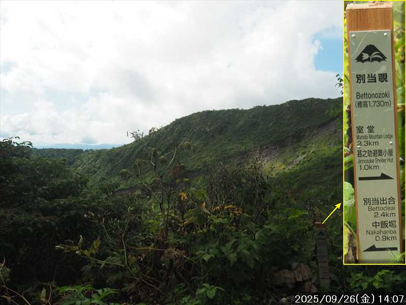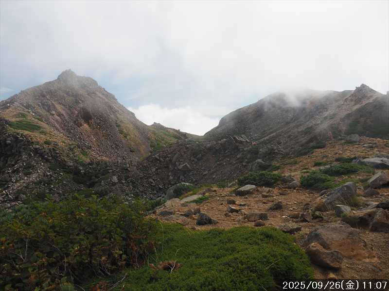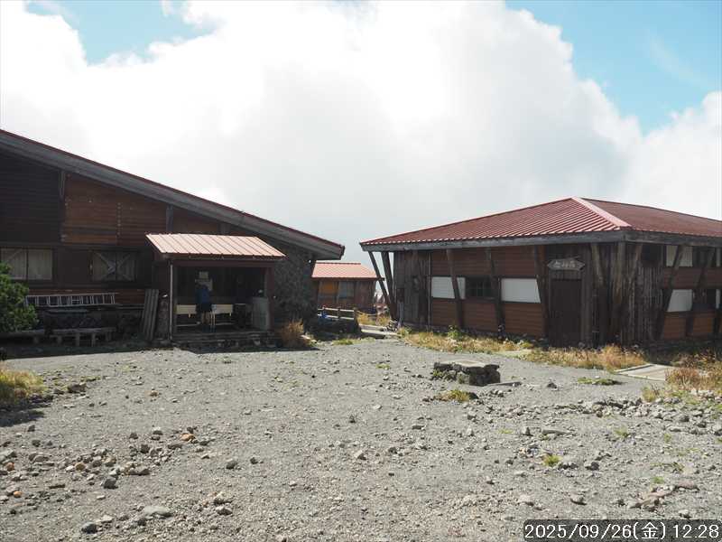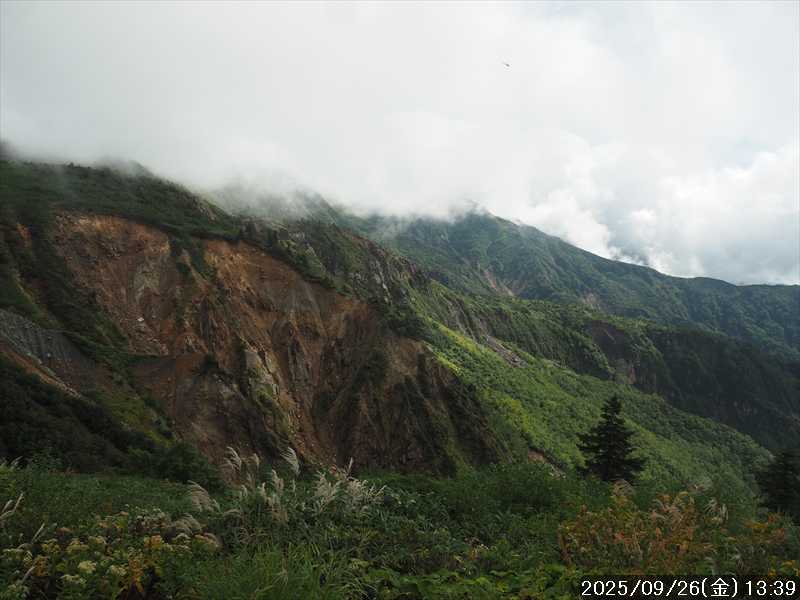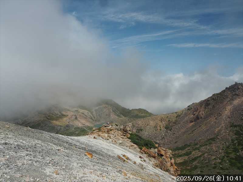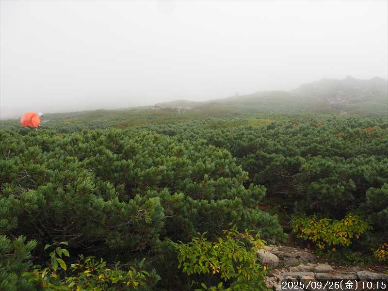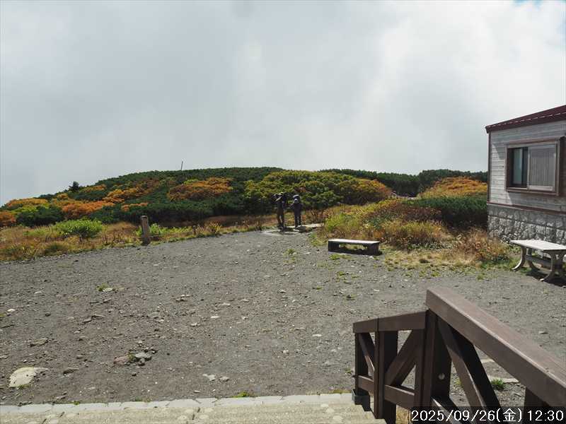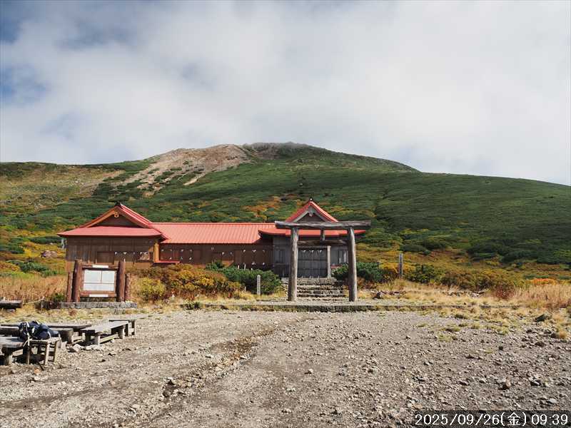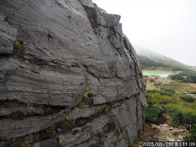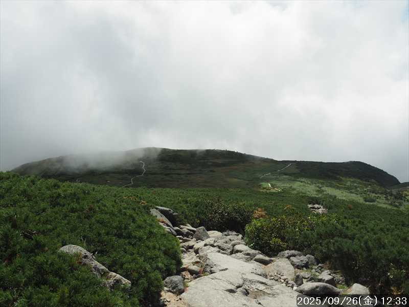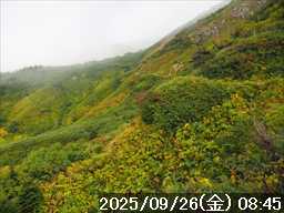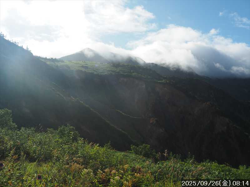 | 今シーズン 4回目の遠征。 遠征先は白山と由良ヶ岳で、2泊で 2山を登る予定とした。 10日前に歩いた越後駒ヶ岳で、体力の衰えを思い知らされているので、それより標高差のある白山は不安はあるが、何度も(11回)登った山であり登山道は整備され急こう配などのややこしい場面もないので弱った足でも問題ない・・たぶん。 昨年だけは機会を逸して登っていないが 2018年から毎年訪れており、1年に 2回訪れた年もあった。 ただ年を追うごとにシンドさが増しているように感じている。 2日目は軽めの山という事で、関西100名山の由良ヶ岳を選んだ。本来は日本300名山の冠山にしたかったが、下調べすると福井県側からは災害で通行止めになっている模様なので、次の機会に繰り越し。 【前日(移動日) 9月25日(木)】 ガソリンを満タンにして奈良を 14:15 にスタート。 京都付近でいつもより混んでいたので京都を抜けるまで 40分ほど余分にかかった。その後は順調に走り、高島のスーパーで今夕と明朝の食材を仕入れ、「道の駅;河野」でスーパーで購入した「ざるそば+おにぎり」の夕食を取る。このところ白山遠征時のパターンだ。 その先も順調に走り抜け、車中泊地の「道の駅;恐竜渓谷かつやま」には 20:00ジャストに到着。オール下道で夕食タイムを含め 209㎞を 5:45'で走ってきた。 5年前(2020年)この道の駅が出来てからは、白山に来るときはよく利用させてもらっている。 駐車場はガラガラで混んでいたためしはない。 到着時の外気温は 21℃。肌寒いくらいだが車は熱を持っているようで車中は暑いくらい。 明日、別当出合に 05:30 までに到着する予定にして、スマートウォッチのタイマーを 03:30にセットして、シュラフには潜らずお腹だけにかけて横になる。 疲れていたようで横になって間もなく眠れた感じ。 【1日目 9月26日(金) 自宅を出てからは 2日目】 「道の駅;恐竜渓谷かつやま」で、スマートウォッチが震動した 03:30 に起床。少し前に目が覚めていたが、時間まで横になっていた。 夜中もそれほど冷え込まなかったようで、夜中にトイレに起きたあとに足だけシュラフに入れて寝ただけだった。車が濡れていたので 一雨あったみたいだが眠っていたようで気付かなかった。 車内で朝食をとっている時に、雨が落ちてきたが暫くすると止んだ。どうも降ったり止んだりの天気模様みたい。 天気予報は 5時まで小雨で 6時以降はお日様マークが並んでいた。てんくらの登山指数も 6時からはオール「A」。天気は急速に回復する模様。 04:20 に道の駅をスタート。正面のコンビニで昼食の食材を仕入れ現地に向かう。 走行中は一時小雨が落ちてきた程度。 一ノ瀬から別当出合への道に入り暫く行った所で先行車に追いついた。狭い道なので急いでいた訳ではないが先方が譲ったので先に進むと、今度は後ろから 2台付いてくるのが見えた。 県道横の路肩駐車場が空いていたので、下の駐車場まで行かずにそこに駐車。続いて来た車 3台はそのまま下の駐車場に向かっていった。準備中に到着してきた 2台は当方の横に駐車した。 到着時の外気温は 17℃だったが特に寒さは感じなかった。雨はあがった感じなので長袖のシャツのままスタート。 別当出合の登山口には単独さんが 2名いて、観光新道と砂防新道にそれぞれ向かって行った。砂防新道に向かった女性には追いつけなかった。 別当出合の登山口をスタートして、登山口から少し入った所で霧雨の中に入ったみたい。そのまま歩いていたが濡れ始めたので、シェルを着て、ザックカバーもした。 先に進むほど霧雨から小雨・完全な雨へと変わった。頭が濡れるので、中飯場の手前の通路で、襟に収められているシェルのフードを被ろうとしたら、着たままではうまくいかない。致し方なくザックを下ろしシェルを脱いでいたら、続けて単独さんが 3人通過して行った。通路を半分塞いでいたので迷惑をかけてしまった。今日は平日なのに登山者が多い感じ。 フードで手間取っていたすぐ上が中飯場だった。フードの着用は中飯場まで待つべきだった。 その中飯場で、一服してあんパンの行動食。 小腹を満たして、雨模様の中を先に進む。完全に雨雲の中にいるので近くの物が見えるだけ。とにかく一生懸命に歩くだけだが、数組に追い抜かれた。追いついたのは単独の女性 1人だけ。 スタートして 2:12'で甚之助避難小屋に到着。ここまで多くの人に先行されたが、休憩していたのは直前に抜かれた 若者 3人さんのみ。抜いて行った人たちは足が速い。 この少し手前で雨は止んでいた、天気予報より 2時間遅れだ。下界方面には青空が一部に覗き始めていたが上の方はまだ真っ白だった。 雨は止んだのでシェルは脱いで、ザックカバーも外した。賞味期限のきた、カロリーメイトでエネルギー補給して、先に進む。 甚之助避難小屋から 21分で南竜分岐。そのまま通過して、次のポイント黒ボコ岩に向かう。 山腹を横切りながら登って行くルートに掛ると、足元が濡れているので