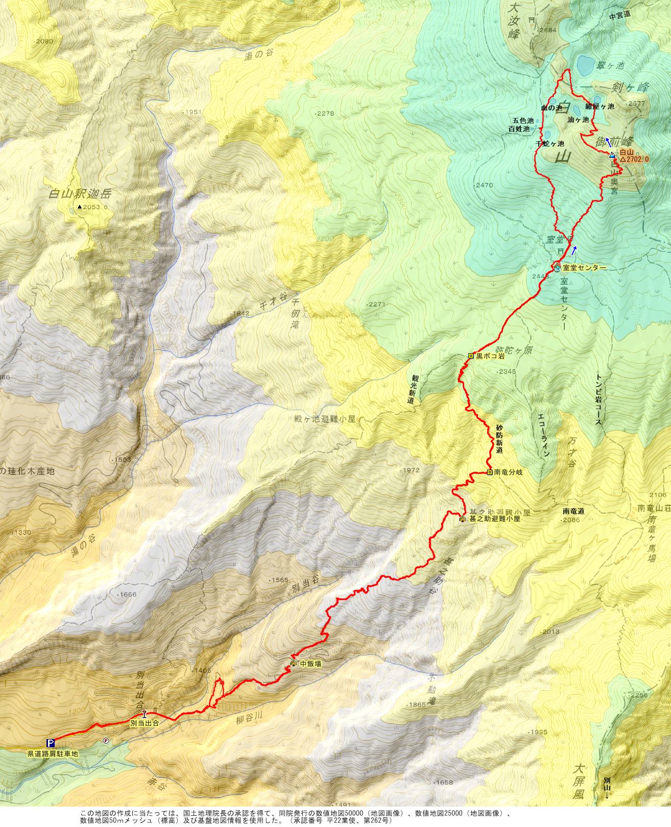 | P ⇔ 別当出合 ⇔ 中飯場 ⇔ 甚之助避難小屋 ⇔ 南竜分岐 ⇔ 黒ボコ岩 ⇔ 室堂センター ⇔ 白山(御前峰) 【往復】 ※ お池めぐり(ショート・コース)して、山頂から室堂に戻る |