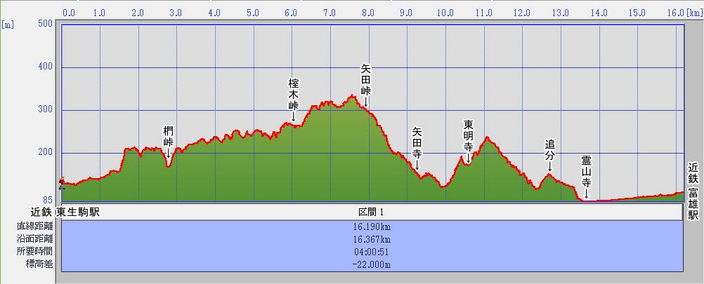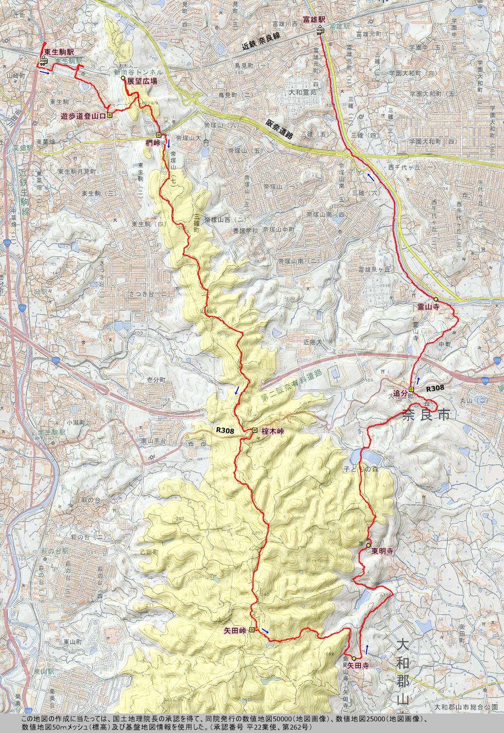 | 近鉄東生駒駅 → 《矢田丘陵遊歩道》 → 椚峠 → 榁木峠 → 矢田峠 → 矢田寺 → 東明寺 → 子どもの森 → 追分 → 霊山寺 →近鉄富雄駅 |